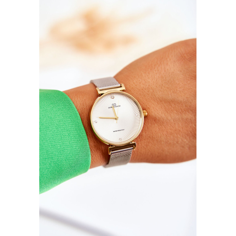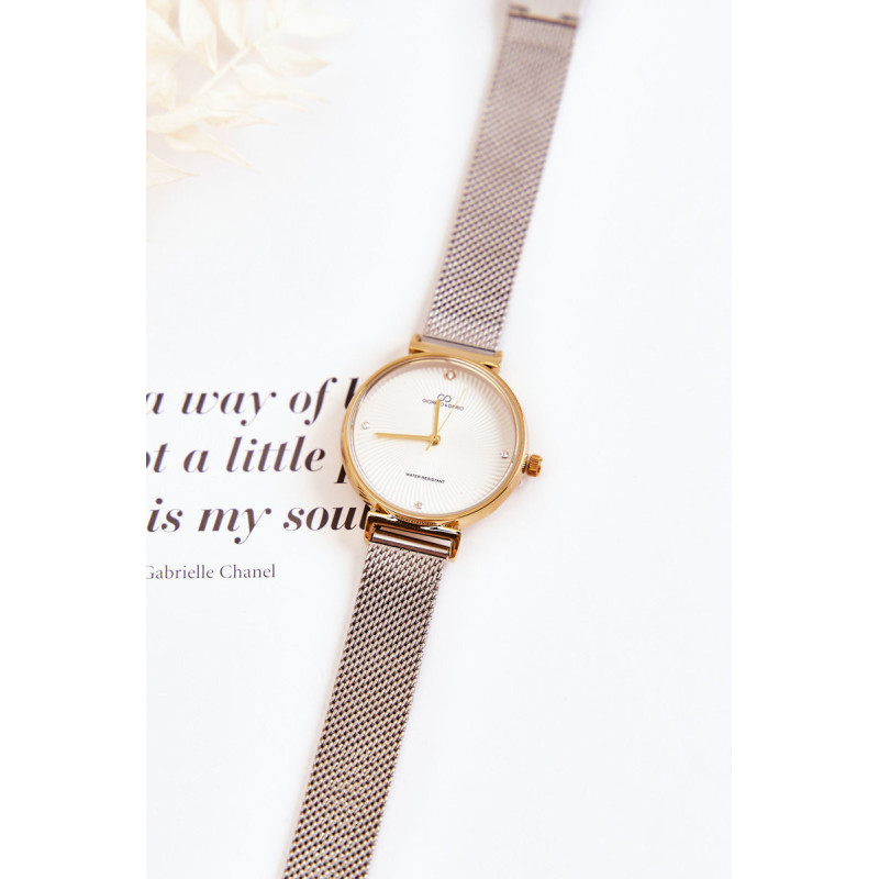 Klasikinis moteriškas laikrodis pagamintas iš nerūdijančio plieno. Ant ciferblato yra subtilus kubinio cirkonio formos ornamentas. Vandeniui atsparus modelis, pvz. plaunant rankas. Laikrodis užsegamas užsegimu. Giorgio & Dario prekės ženklas orientuojasi į aukštos kokybės gaminius, todėl šiuo modeliu tikrai liksite patenkinti! Šis laikrodis puikiai papildo daugybę stilių!