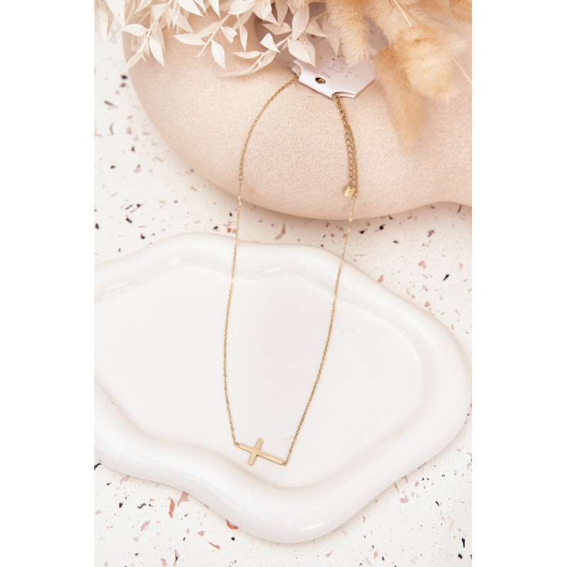 Moteriška grandinėlė, pagaminta iš chirurginio plieno, auksinės spalvos. Reguliuojamas užsegimas leidžia pritaikyti ilgį prie iškirptės, užtikrinant patogų nešiojimą. Visą komplektą papildo kryžiaus formos pakabukas, kuris suteikia papuošalui subtilų, klasikinį charakterį. Puikiai tinka kasdieniam dėvėjimui ir elegantiškesnėms stiliams.