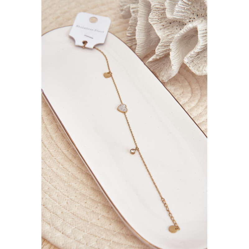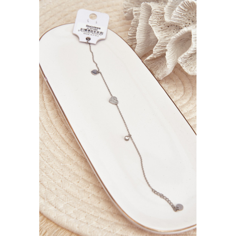 Moteriška kulkšnies apyrankė pagaminta iš nerūdijančio plieno. Plona grandinėlė turi dekoratyvinius elementus širdelių pavidalu. Reguliavimo galimybės dėka puikiai pritaikysite prie kojos apimties. Puikus priedas prie kasdienės, bet ir elegantiškesnės stilizacijos!