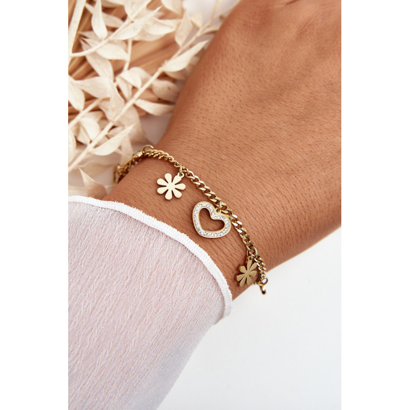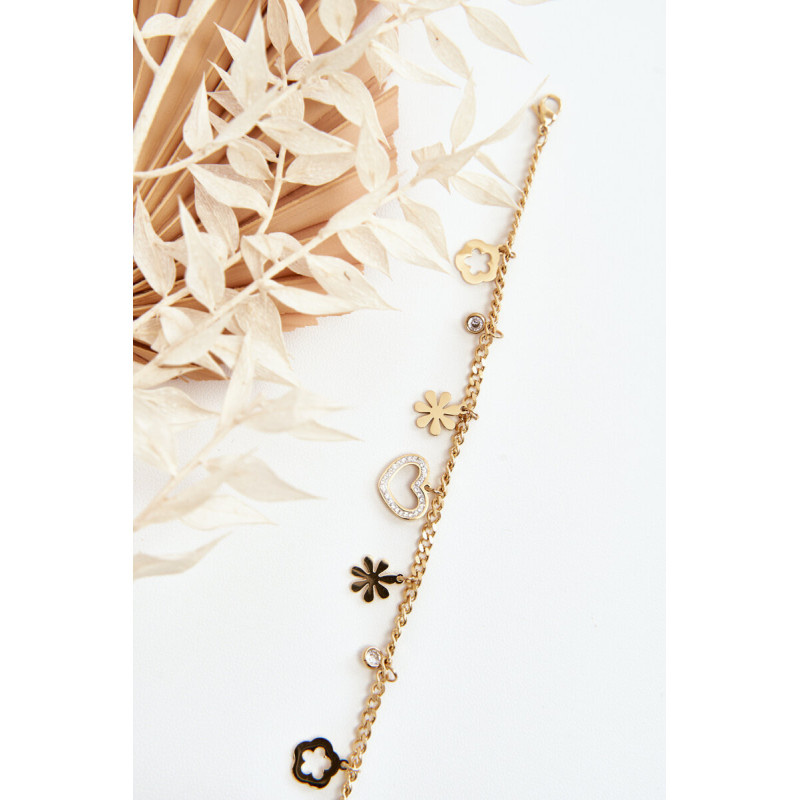 Apyrankė pagaminta iš nerūdijančio plieno. Jis turi reguliuojamo ilgio ir kelis pakabukus gėlių ir širdelių pavidalu su cirkonį imituojančiais purkštukais. Apyrankė atrodo labai ypatingai. Peržiūrėkite ir kitus mūsų papuošalų modelių pasiūlymus. Jūs privalote jį turėti!