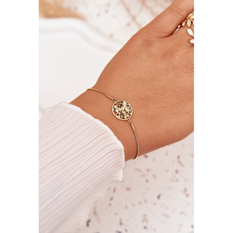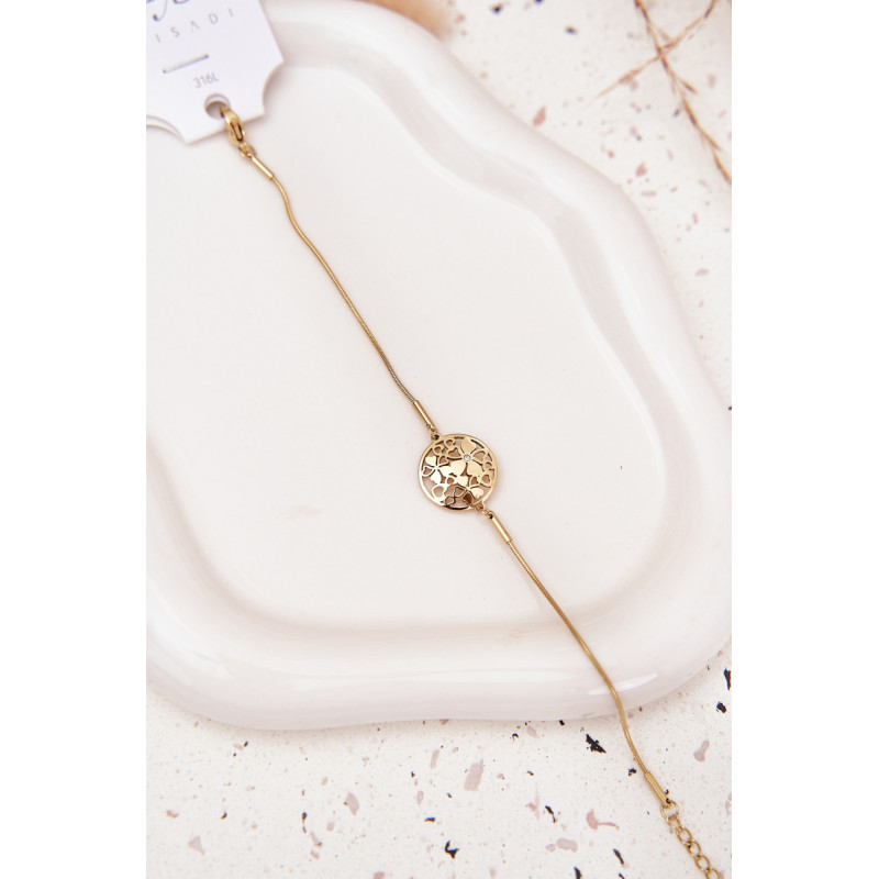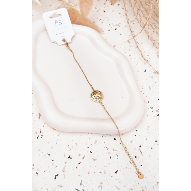Moteriškas apyrankės, pagamintos iš chirurginio plieno auksinės spalvos, yra subtilus ir elegantiškas aksesuaras bet kuria proga. Reguliuojamas užsegimas leidžia ją puikiai pritaikyti prie riešo ir užtikrina patogumą. Dekoratyvinis pakabukas mažo apskritimo formos su gėlėmis viduje priduria subtilaus žavesio ir mergaitiško charakterio. Puikiai tinka kasdieniam stiliui.