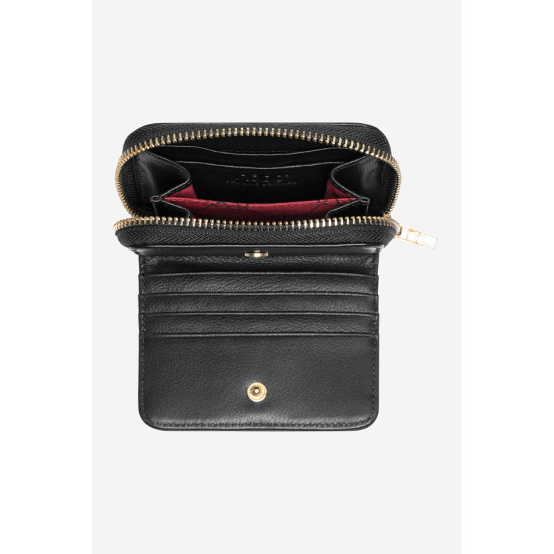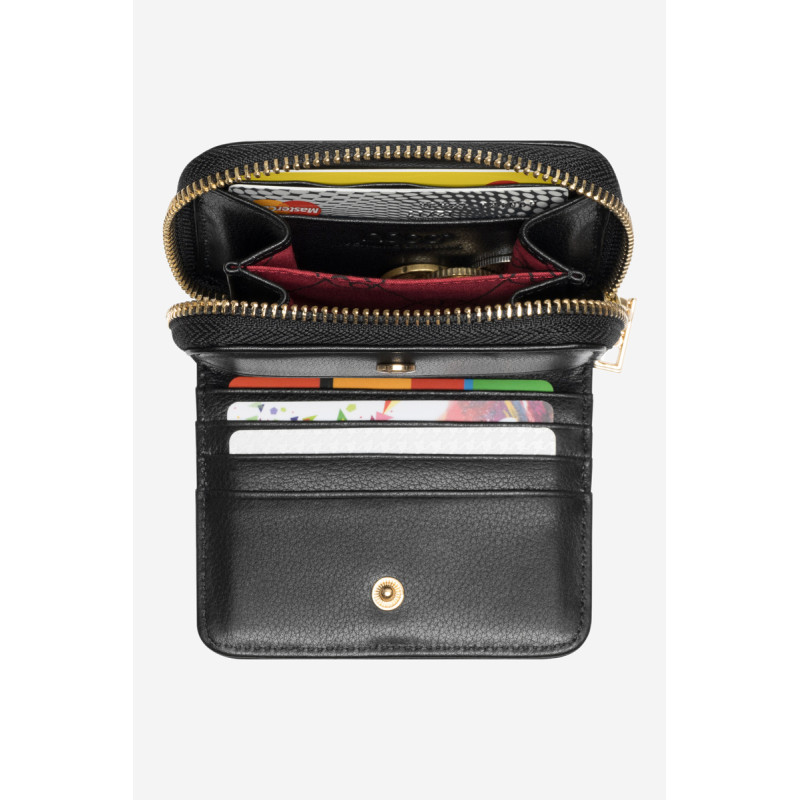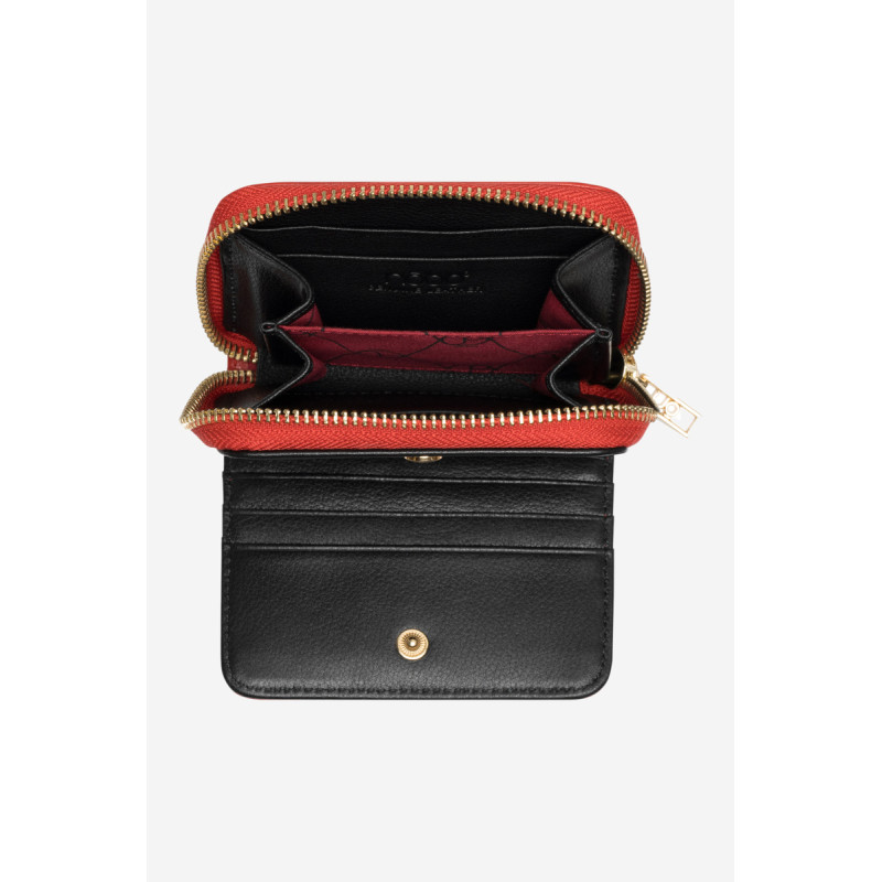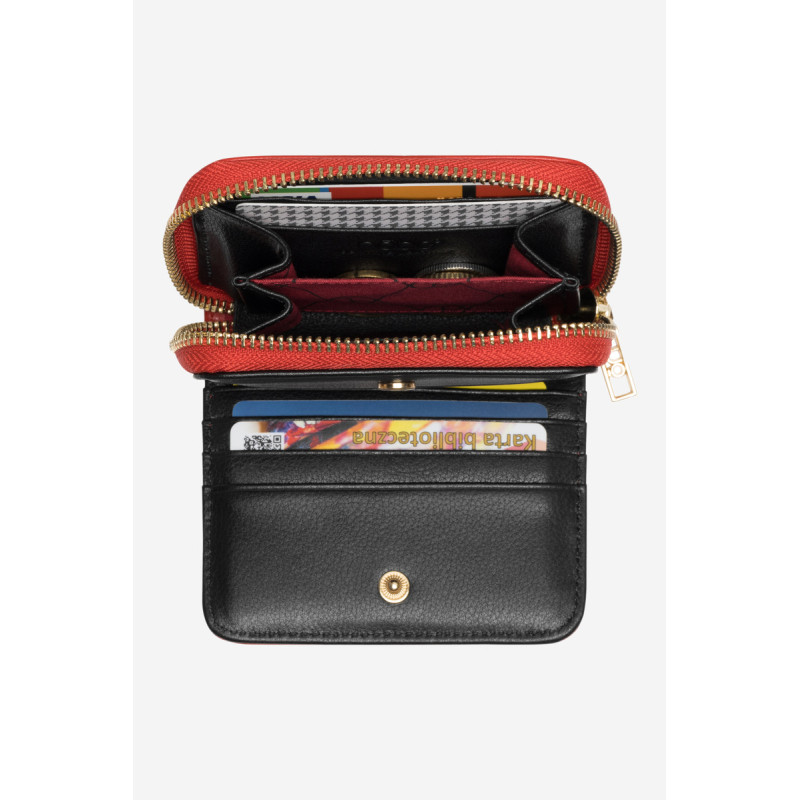 Maža moteriška piniginė pagaminta iš lygios natūralios odos. Viduje yra dvylika kortelių kišenių. Kišenėje su užtrauktuku yra skyrius, kuriame galite sutalpinti banknotus ir monetas. Modelis supakuotas elegantiškoje raudonoje dėžutėje. Puikiai tinka dovanai!