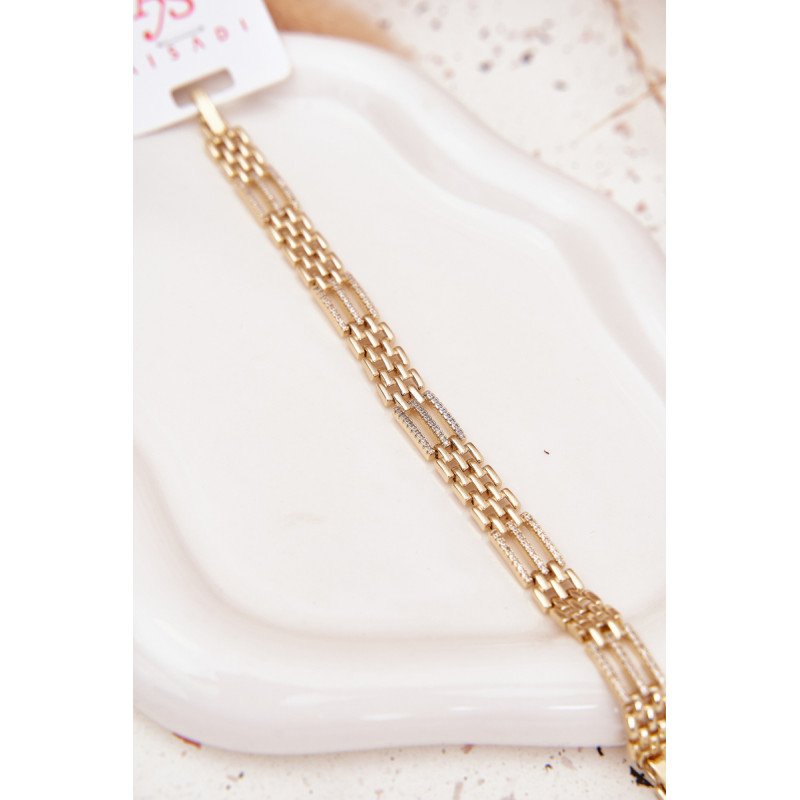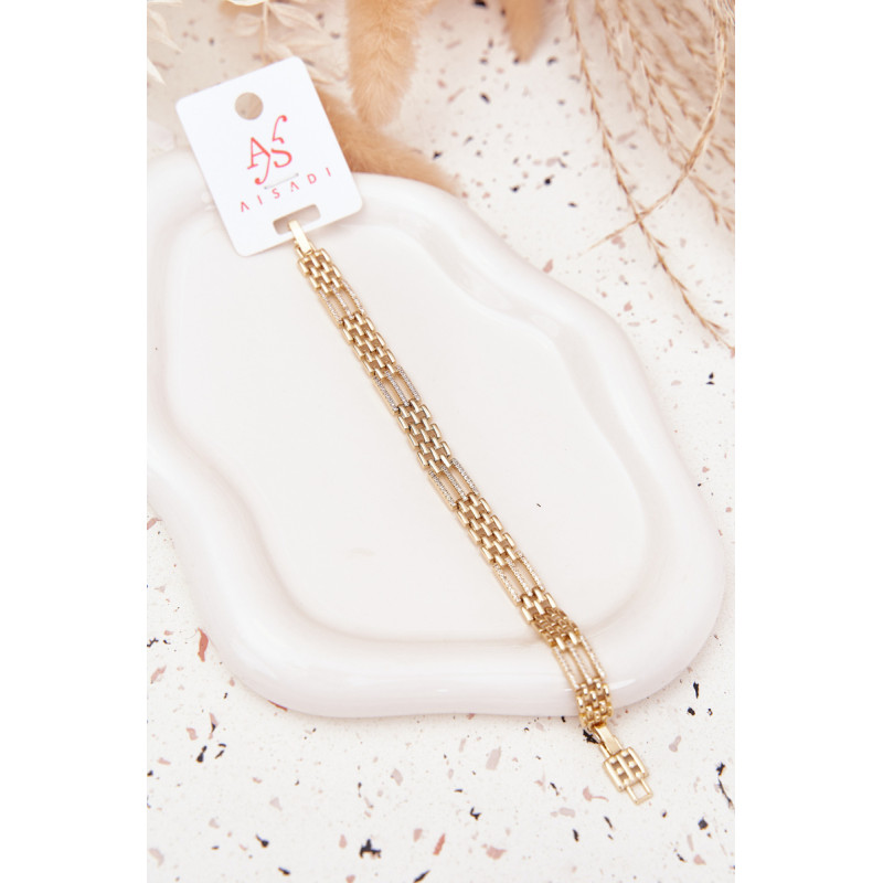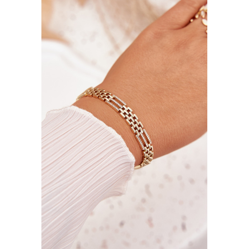 Moteriškas apyrankės aukso spalvos, pagamintos iš chirurginio plieno, žavi subtiliu mažų cirkonio žiedų spindesiu. Elegantiška ir patvari, puikiai atrodo ant riešo, prideda švelnumo ir moteriškos žavesio stiliui. Idealiai tinka kasdieniam dėvėjimui ir ypatingoms progoms.