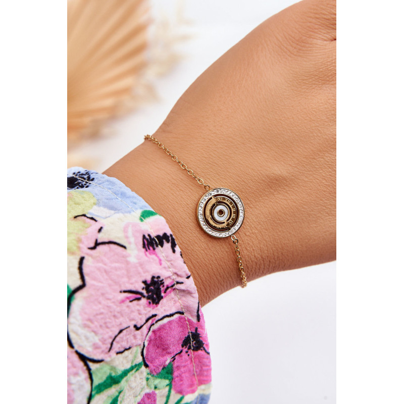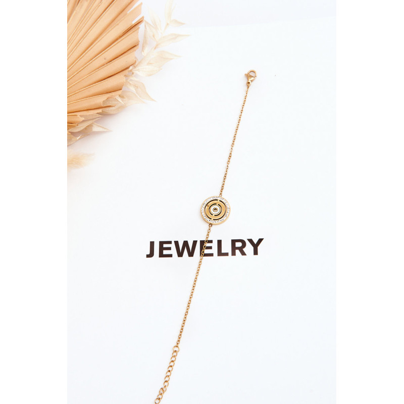 Moteriška apyrankė ant plonos grandinėlės pagaminta iš nerūdijančio plieno. Šio modelio viduryje yra apskritimo formos pakabukas su romėniškais skaitmenimis ir cirkonį imituojančiais cirkoniais. Apyrankė yra reguliuojamo ilgio ir užsegama omaro užsegimu.