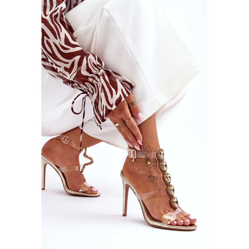 Šie nuostabūs sandalai turėtų būti jūsų drabužių spinta! Iš išorės pagaminta iš plastiko. Jie dekoruoti elegantiškais akmenimis ir kalnų krištolo imitacijomis. Vidpadis iš natūralios odos leis patogiai avėti batus. Sandalai yra ant aukštakulnio. Rinkdamiesi dydį, vadovaukitės dydžių lentele.