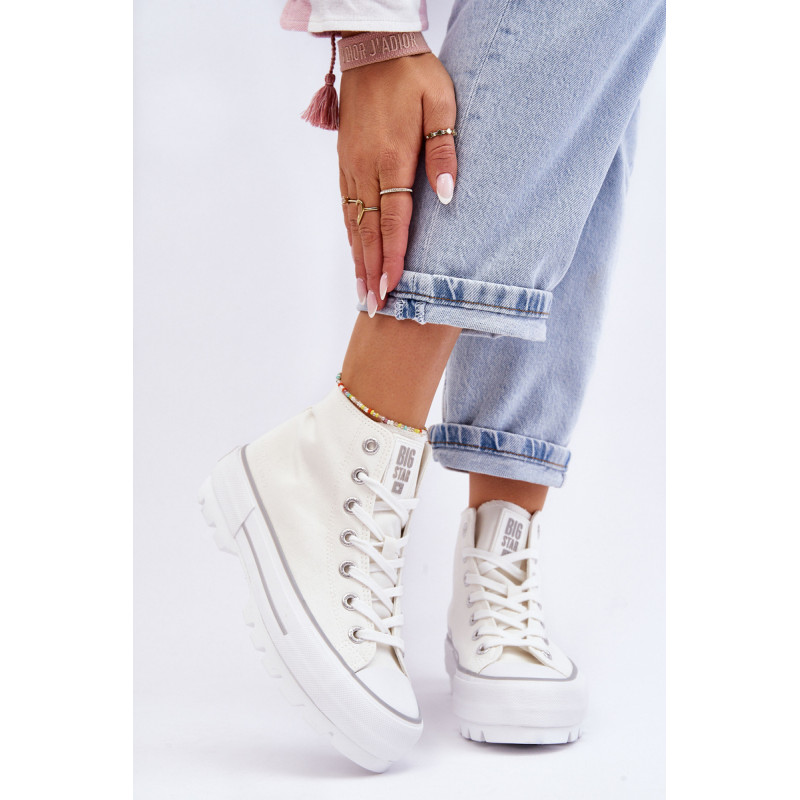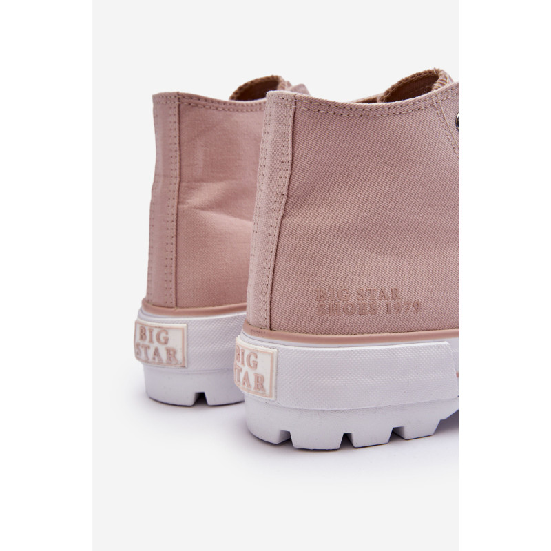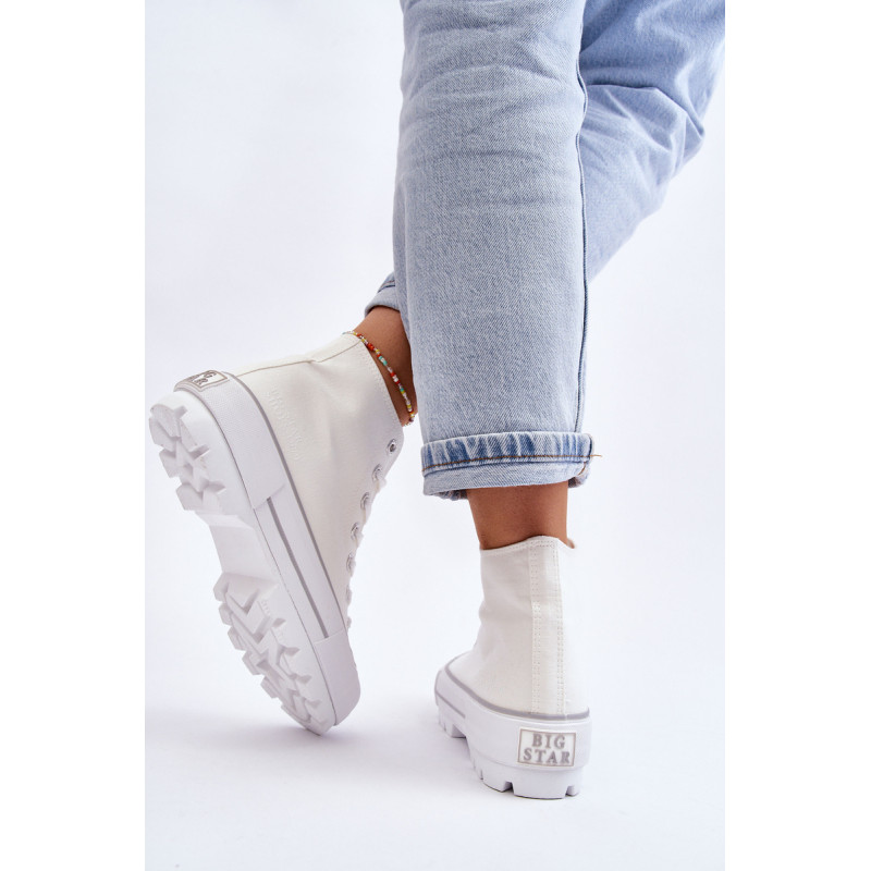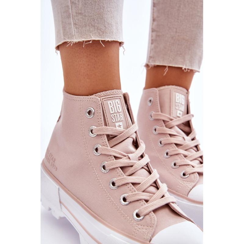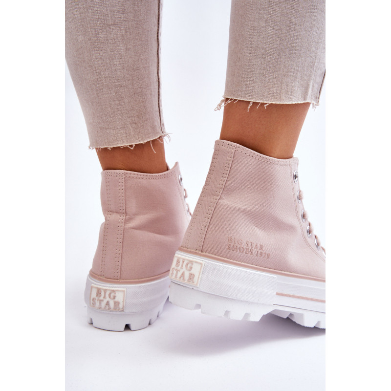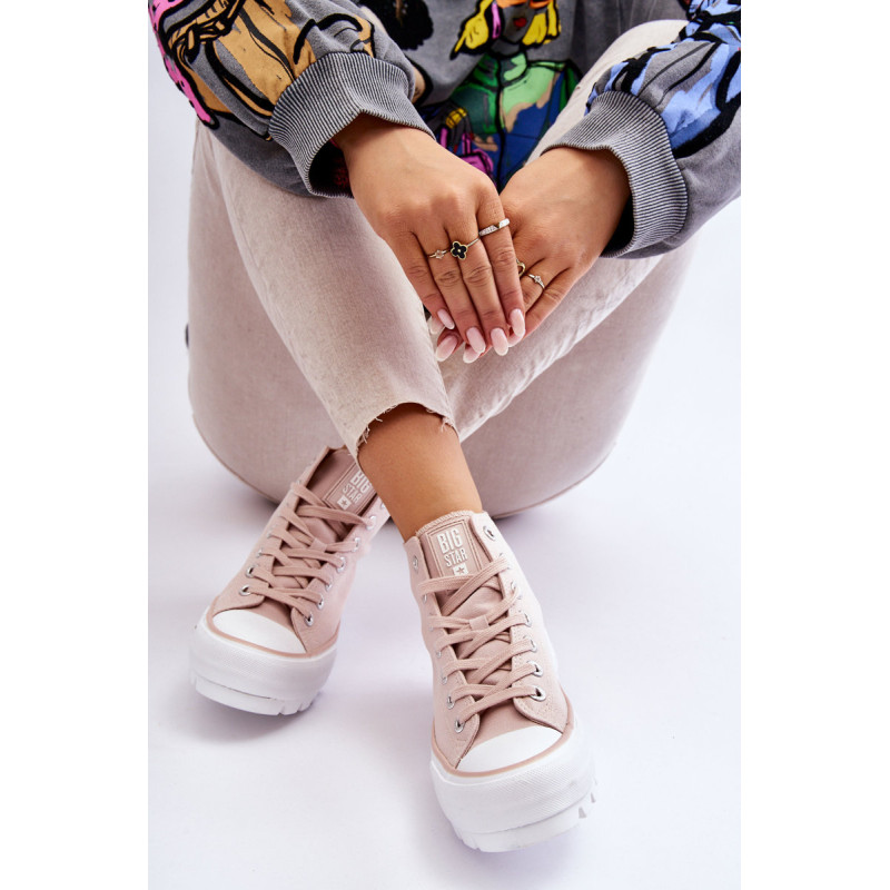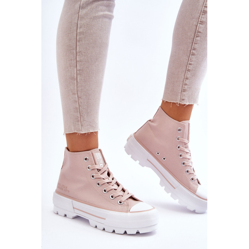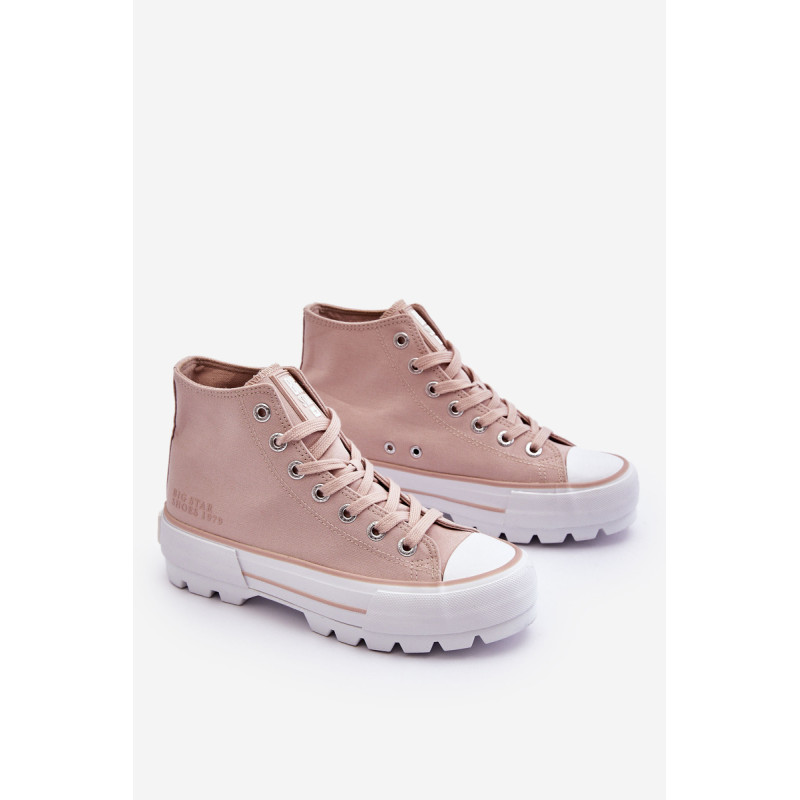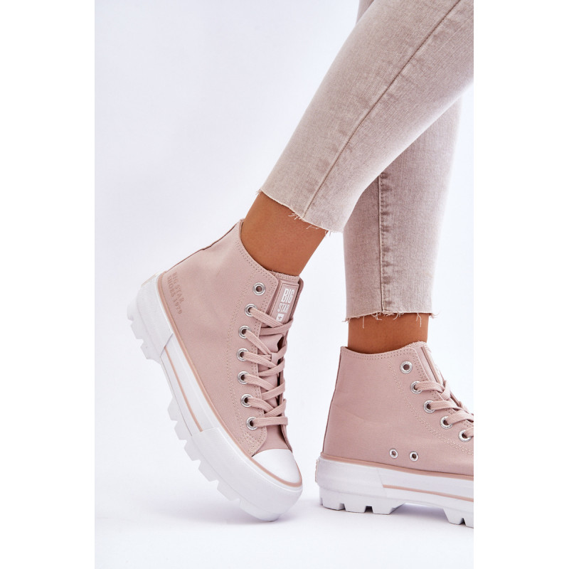 Madingi, aukšti moteriški sportbačiai iš prekės ženklo Big Star! Padas su aukštu protektoriumi ir viršutine dalis iš tekstilinės medžiagos kulkšnies. Šie sportbačiai taip pat turi šiek tiek standesnį kulno skaitiklį. Platforma ir padas pagaminti iš guminės medžiagos. Rinkdamiesi dydį žiūrėkite dydžių lentelę.
