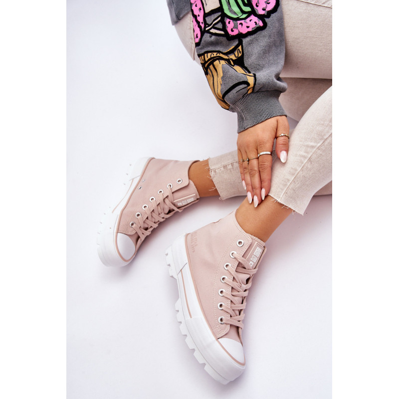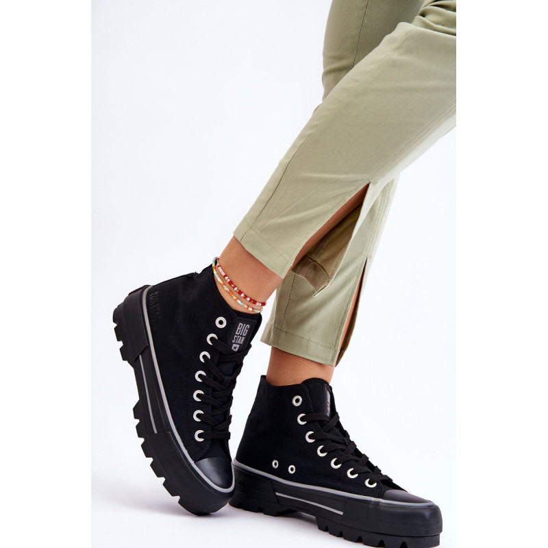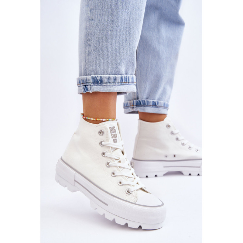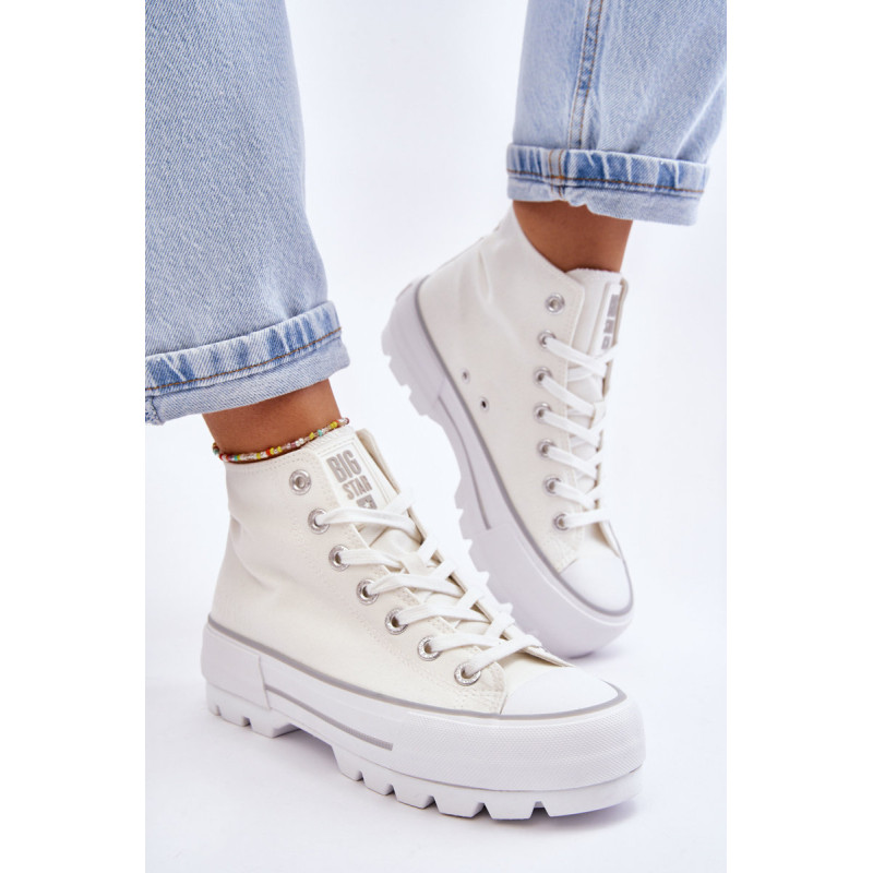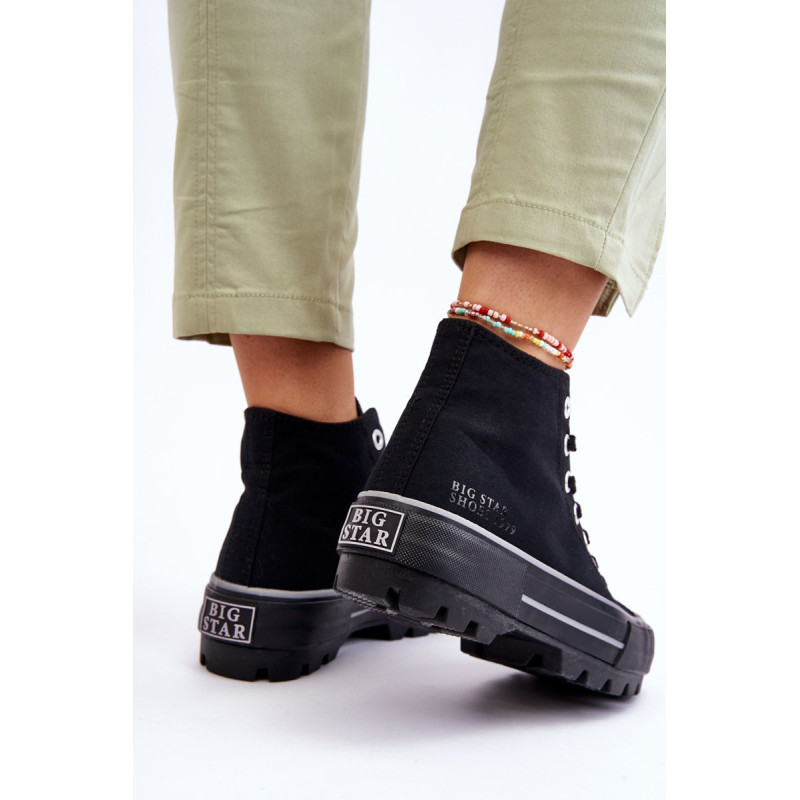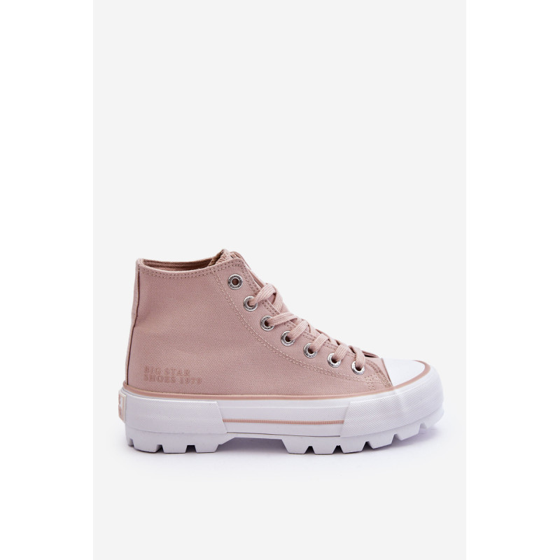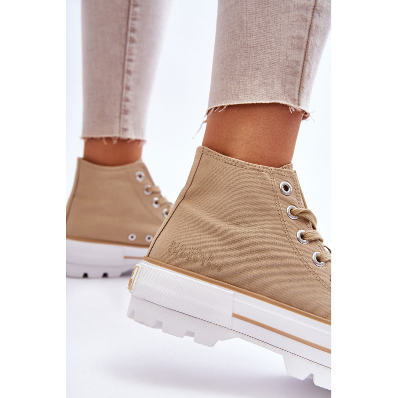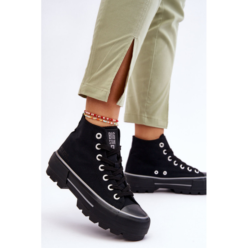 Madingi, aukšti moteriški sportbačiai iš prekės ženklo Big Star! Padas su aukštu protektoriumi ir viršutine dalis iš tekstilinės medžiagos kulkšnies. Šie sportbačiai taip pat turi šiek tiek standesnį kulno skaitiklį. Platforma ir padas pagaminti iš guminės medžiagos. Rinkdamiesi dydį žiūrėkite dydžių lentelę.