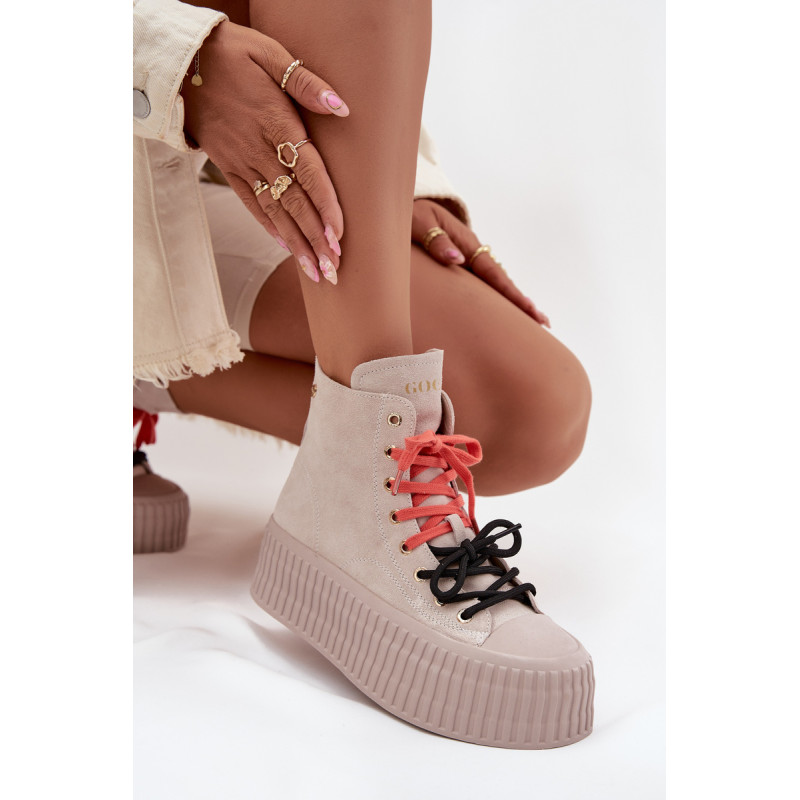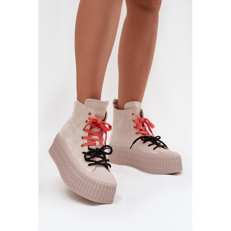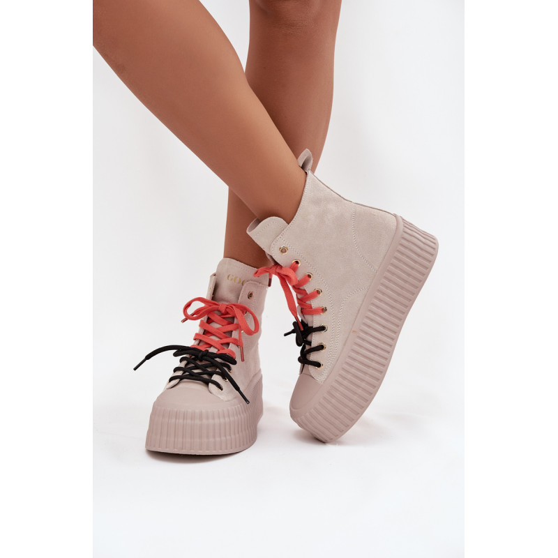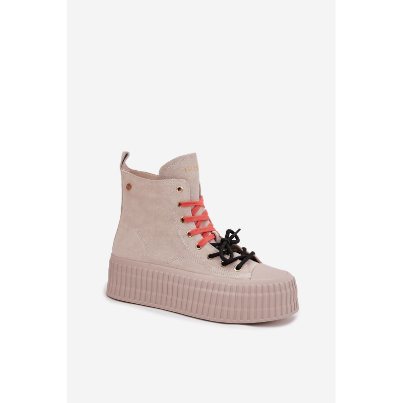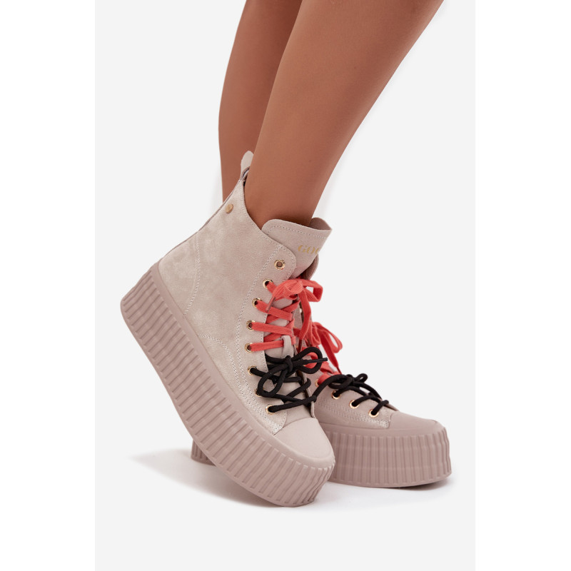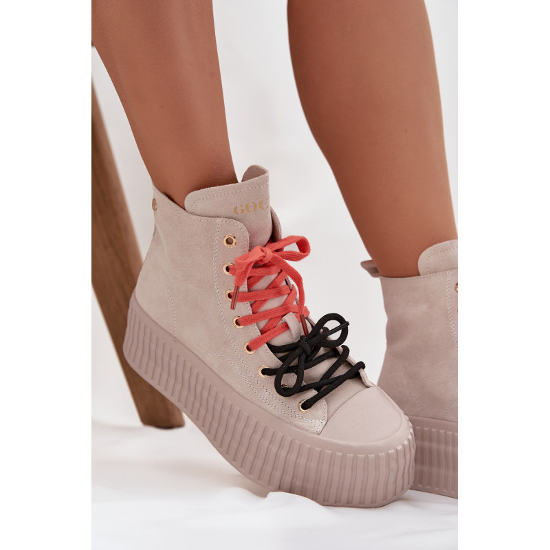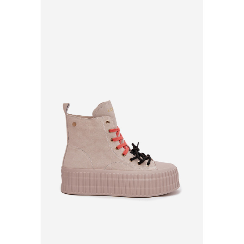 Šildyti moteriški GOE sportiniai bateliai yra stilinga avalynė, puikiai tinkanti šaltesnėmis dienomis. Pagaminti iš aukštos kokybės natūralaus zomšos, atrodo madingai ir elegantiškai, tuo pačiu užtikrindami ilgaamžiškumą ir patogumą. Juos sustiprina masyvi platforma, kuri suteikia aukščio ir pabrėžia modernų batų charakterį. Išskirtinis jų vaizdas yra dvigubas, dviaukštis raištelis, kuris sudaro originalų akcentą ir patraukia dėmesį. Šis modelis yra idealus moterims, vertinančioms patogumą, miesto stilių ir madingus akcentus kasdienėje aprangoje. Renkantis dydį, vadovaukitės dydžių lentele.