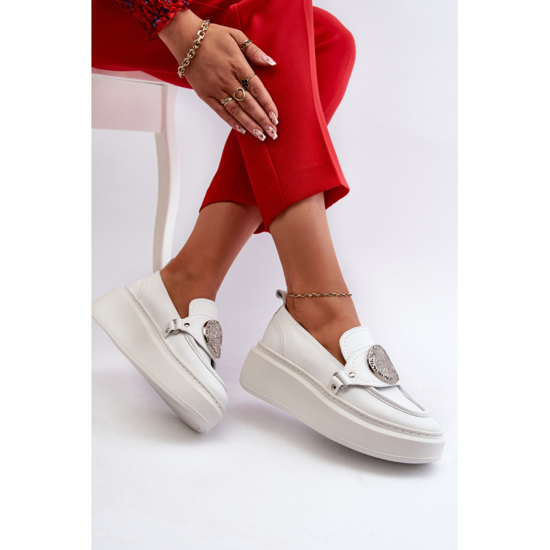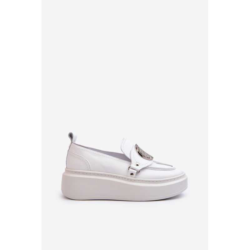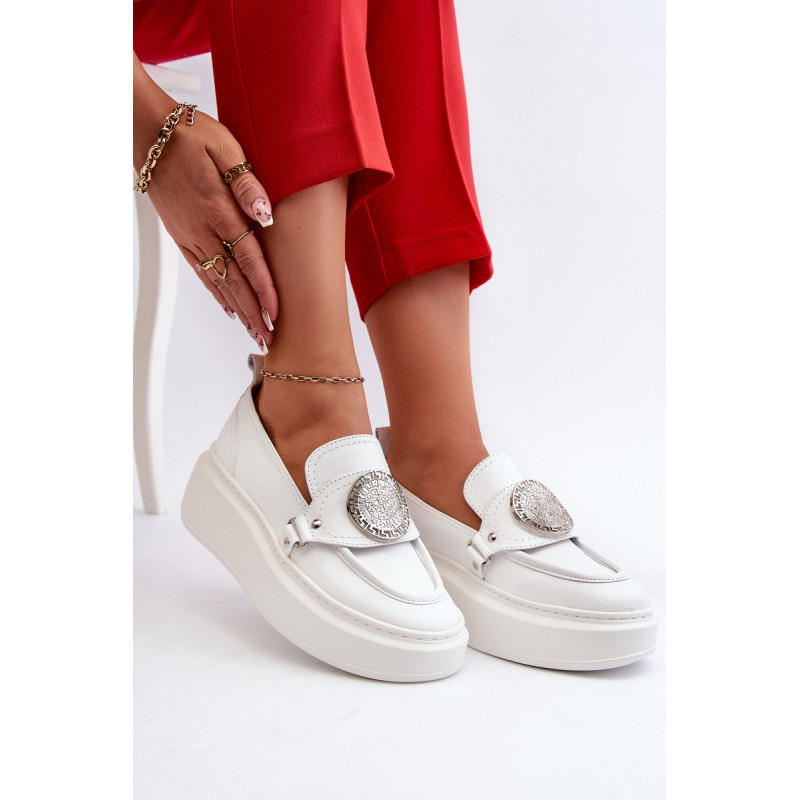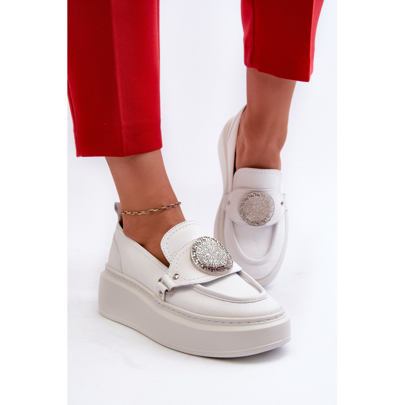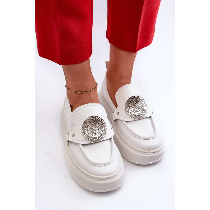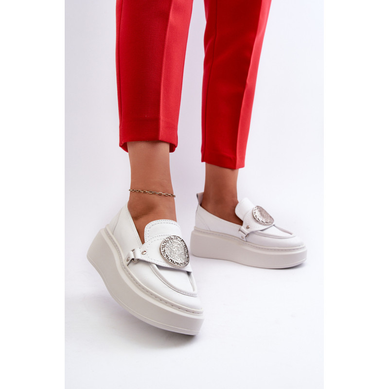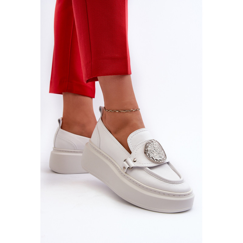 Moteriški mokasinai pagaminti iš natūralios odos, atkreipiant dėmesį į detales. Ant platformos su pleištu jie suteikia stabilumo ir pasitikėjimo kiekviename žingsnyje. Priekinė dalis dekoruota dirželiu ir sidabriniu ornamentu, suteikiančiu elegancijos. Puikiai tinka moterims, kurios vertina stilių ir patogumą! Rinkdamiesi dydį, žiūrėkite dydžių lentelę.