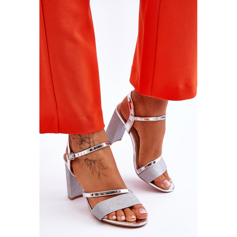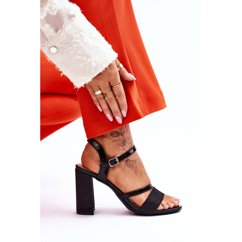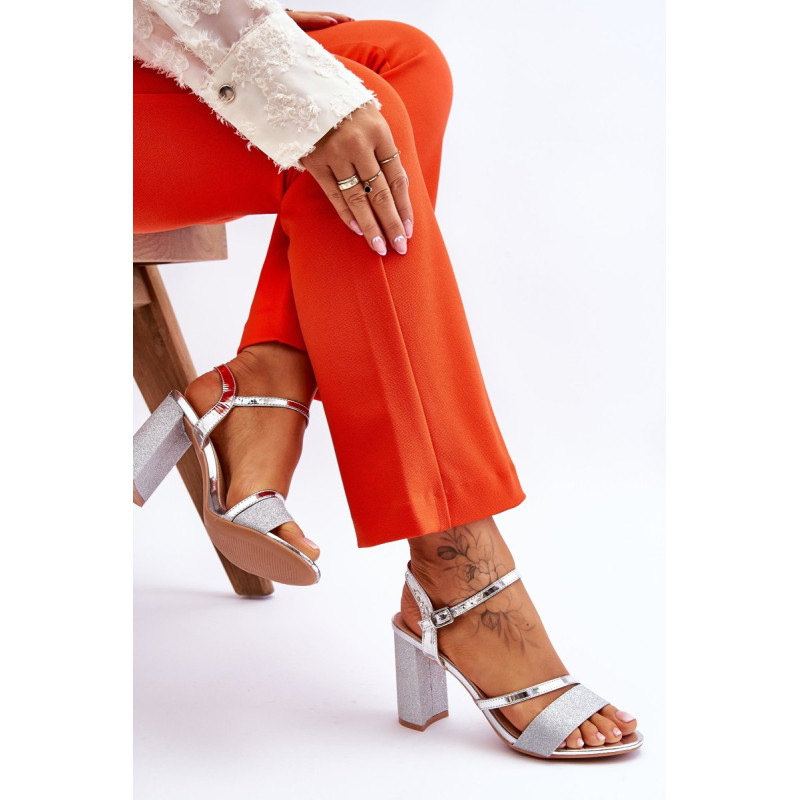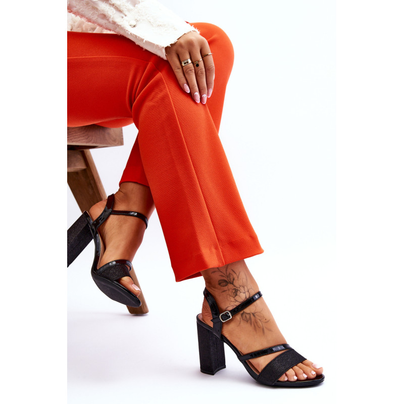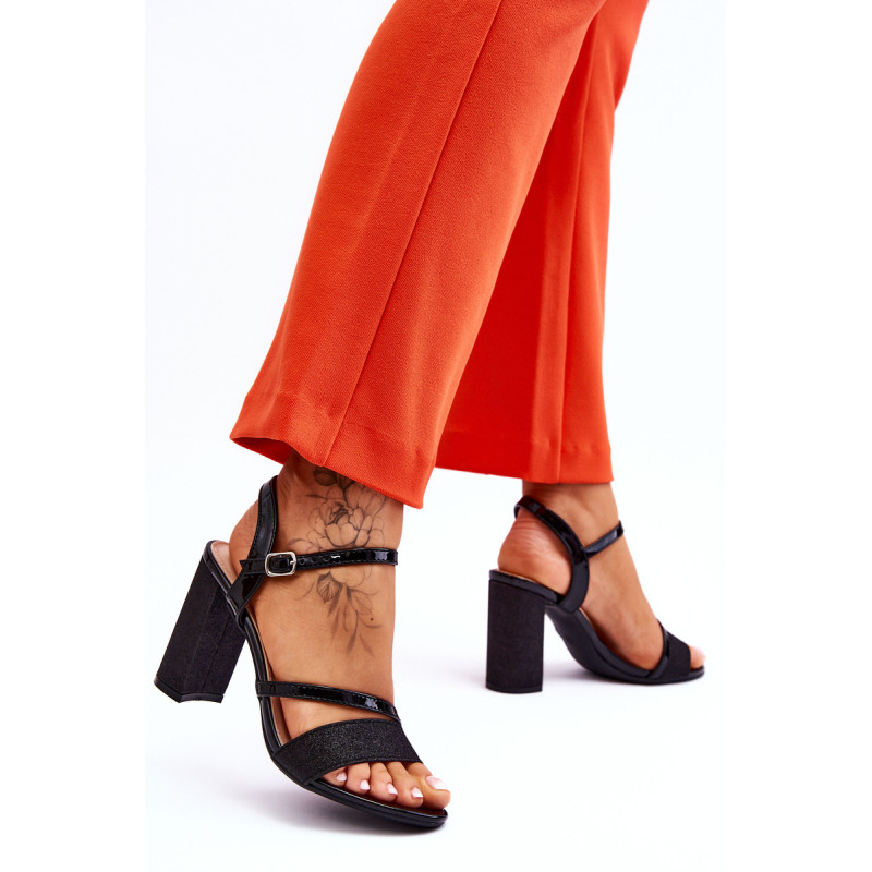 Gražūs stulpelio formos sandalai su kulnais. Šie batai yra pagaminti iš eko odos. Be to, juostelė priekyje ir kulnas blizga, todėl batai atrodo tikrai elegantiškai. Minkštas eko odos vidpadis užtikrins komfortą naudojimo metu. Batai turi reguliuojamą dirželį su sagtimi aplink kulkšnį. Šį modelį naudosite per daugybę šeimos švenčių, vakarėlių su draugais ar verslo susitikimų. Rinkdamiesi dydį, žiūrėkite dydžių lentelę.