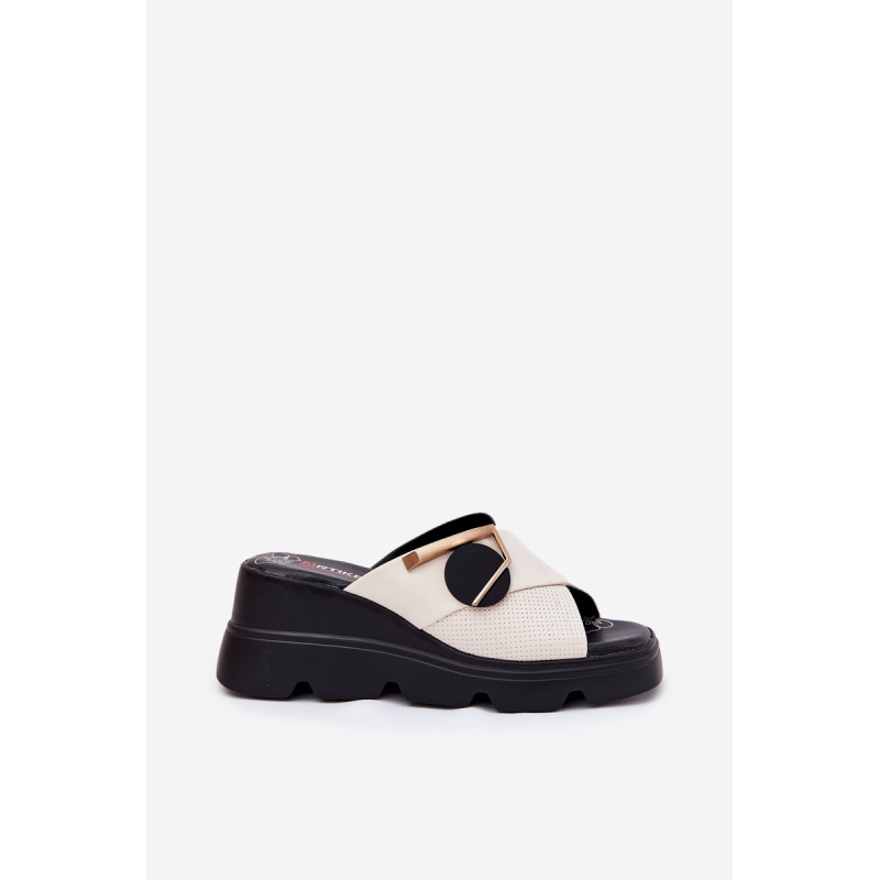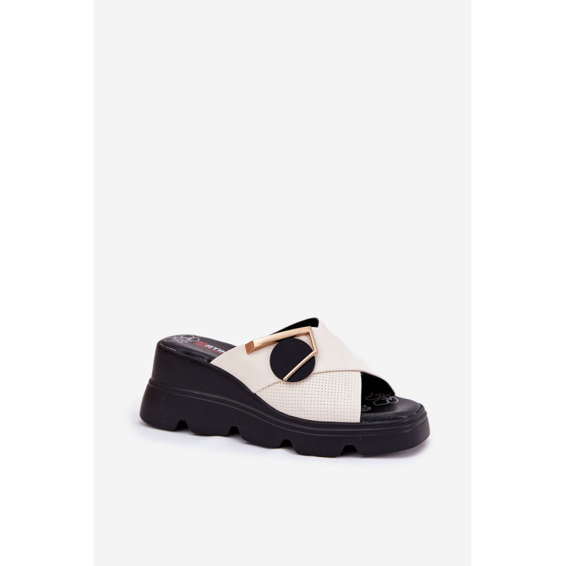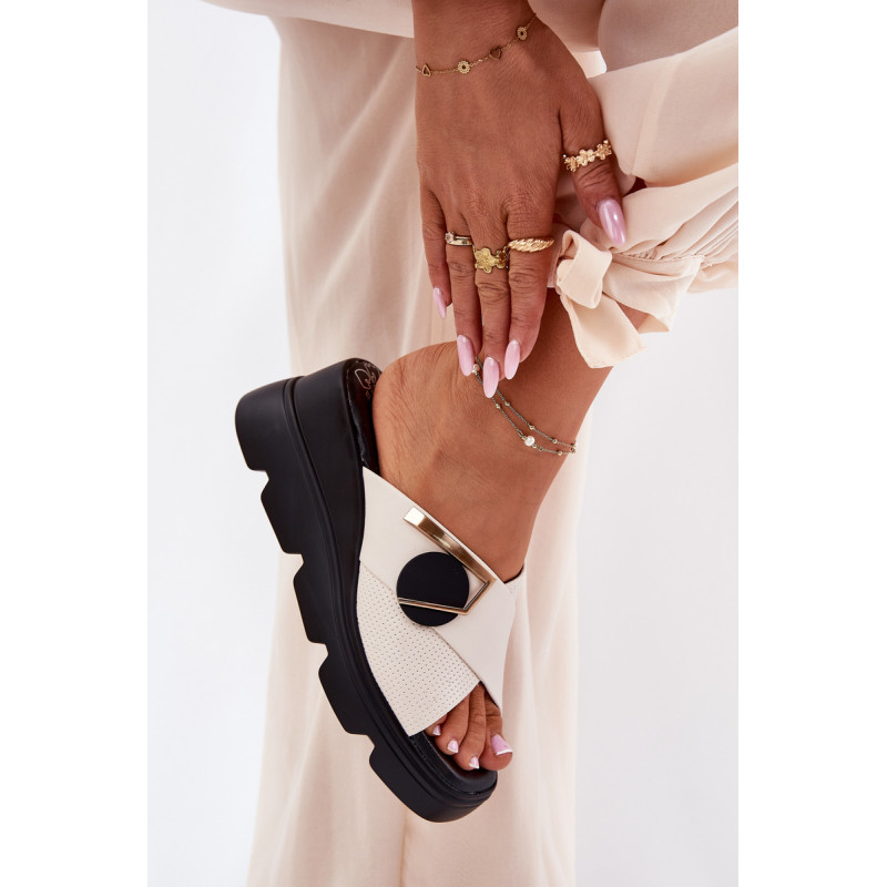 Elegantiškos moteriškos šlepetės iš natūralios odos yra puikus pasirinkimas šiltoms dienoms. Įrengtos ant platformos, jos užtikrina patogumą ir stabilumą. Modelis išsiskiria geometrine aplikacija, suteikiančia modernų charakterį. Minkšta pado danga garantuoja komfortą visą dieną, todėl šios šlepetės yra idealus aksesuaras vasaros stilizacijoms, derinančioms eleganciją su funkcionalumu. Renkantis dydį, vadovaukitės dydžių lentele.