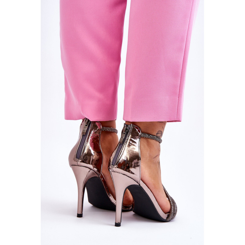 Elegantiški smeigtuko formos sandalai su kulnais. Šio modelio viršus pagamintas iš eko odos, o minkštas vidpadis – iš natūralios odos. Sandalai užsegami užtrauktuku viršutinės dalies gale. Nosis atvira, suapvalinta. Šis elegantiškas modelis puikiai tiks svarbiems susitikimams ar šeimos šventėms.Rinkdamiesi dydį, vadovaukitės dydžių lentele.