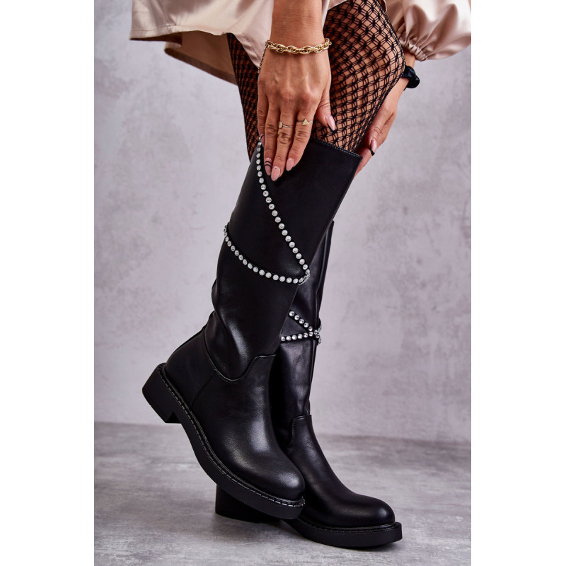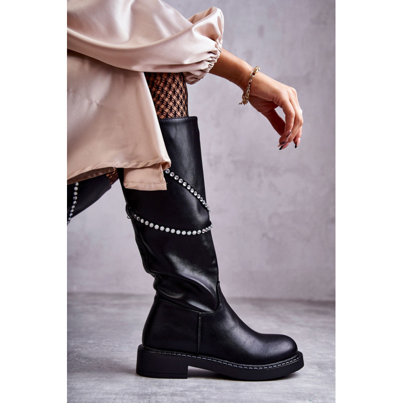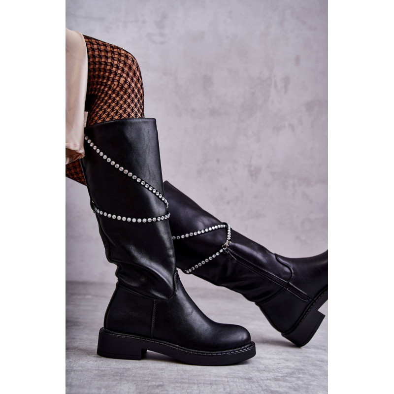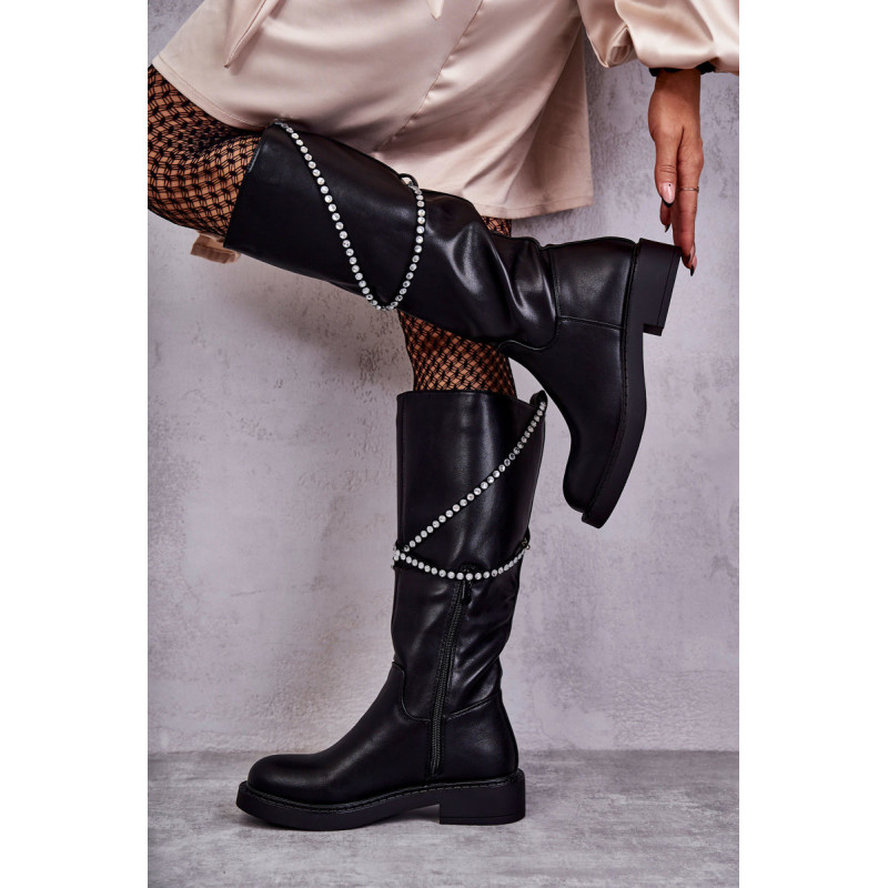 Moteriški batai su batviršiais virš kelių yra pagaminti iš ekologiškos odos. Jie turi dekoratyvų, nuimamą diržą su kalnų krištolais. Užsegamas modelis su papildomu užtrauktuku šone. Batai montuojami ant plokščio kulno ir subtilios platformos. Jie turi standintą kulną ir izoliaciją batų antklodės pavidalu. Puikus modelis ateinančiam sezonui! Renkantis dydį, naudokite dydžių lentelę.