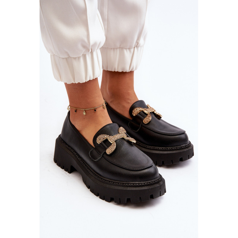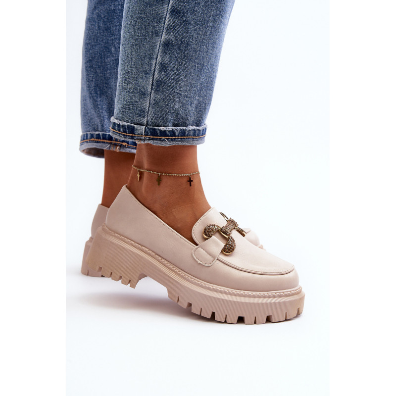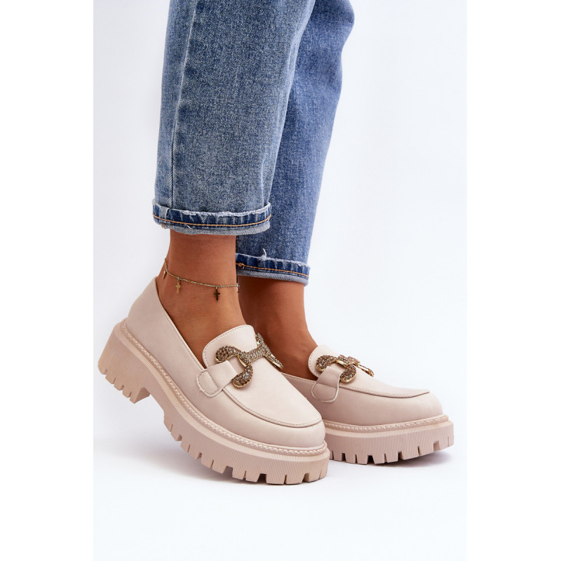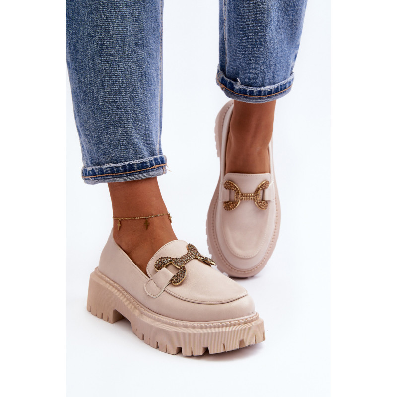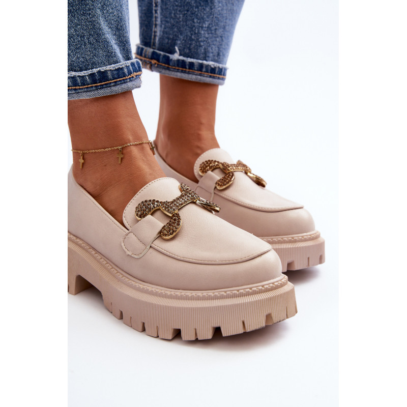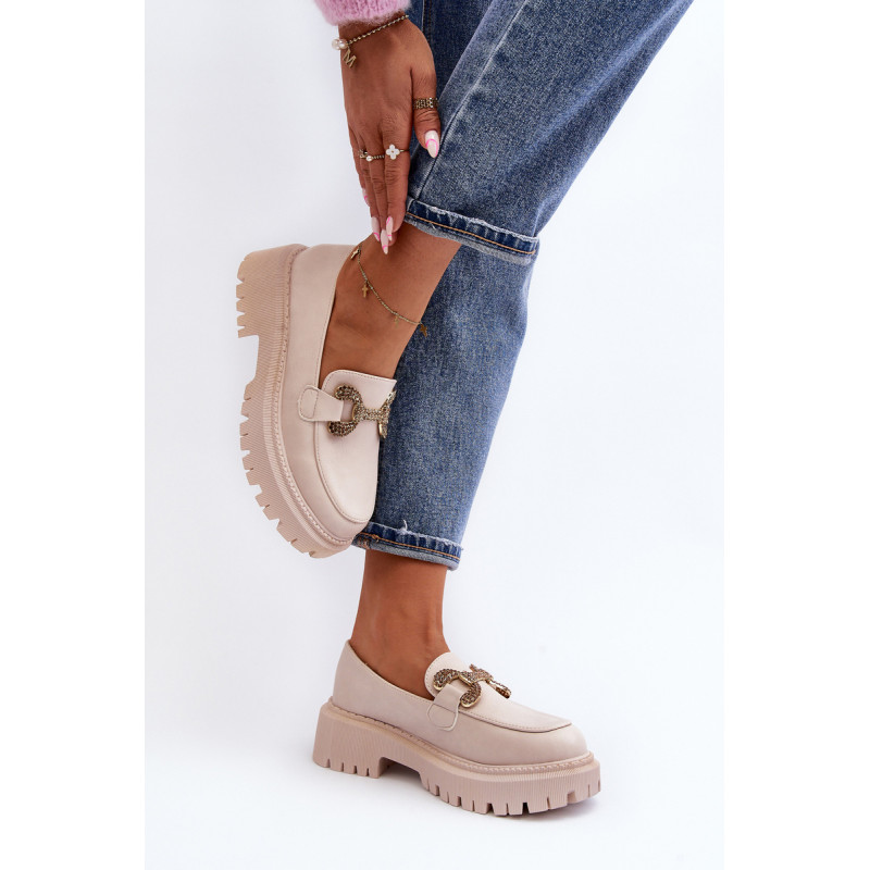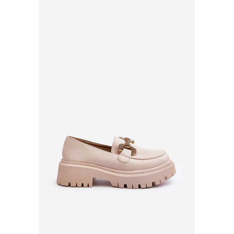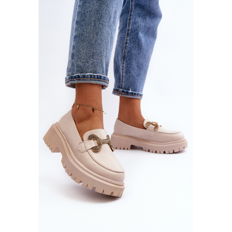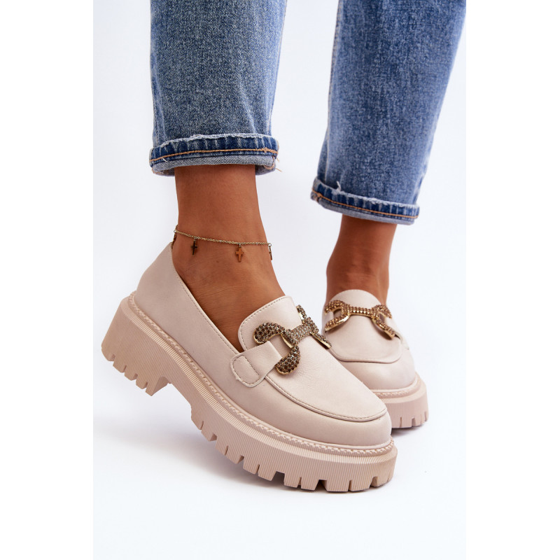 Moteriški mokasinai, pagaminti iš ekologiškos odos. Ant masyvaus, plokščio kulno ir storo pado. Šio modelio pirštai yra suapvalinti, o priekyje yra aukso papuošimas. Jūs tikrai turėtumėte juos turėti savo garderobe! Rinkdamiesi dydį, žiūrėkite dydžių lentelę.