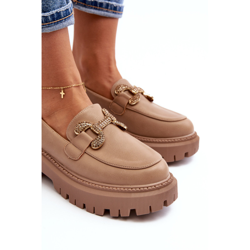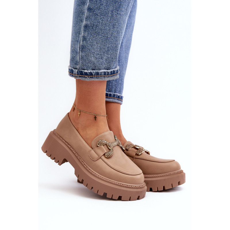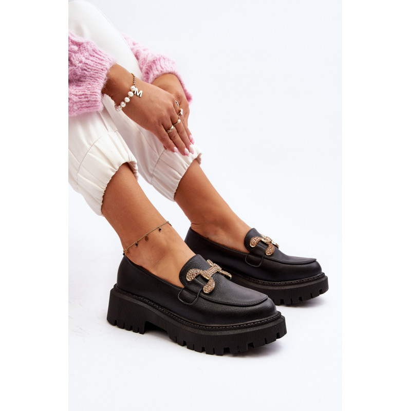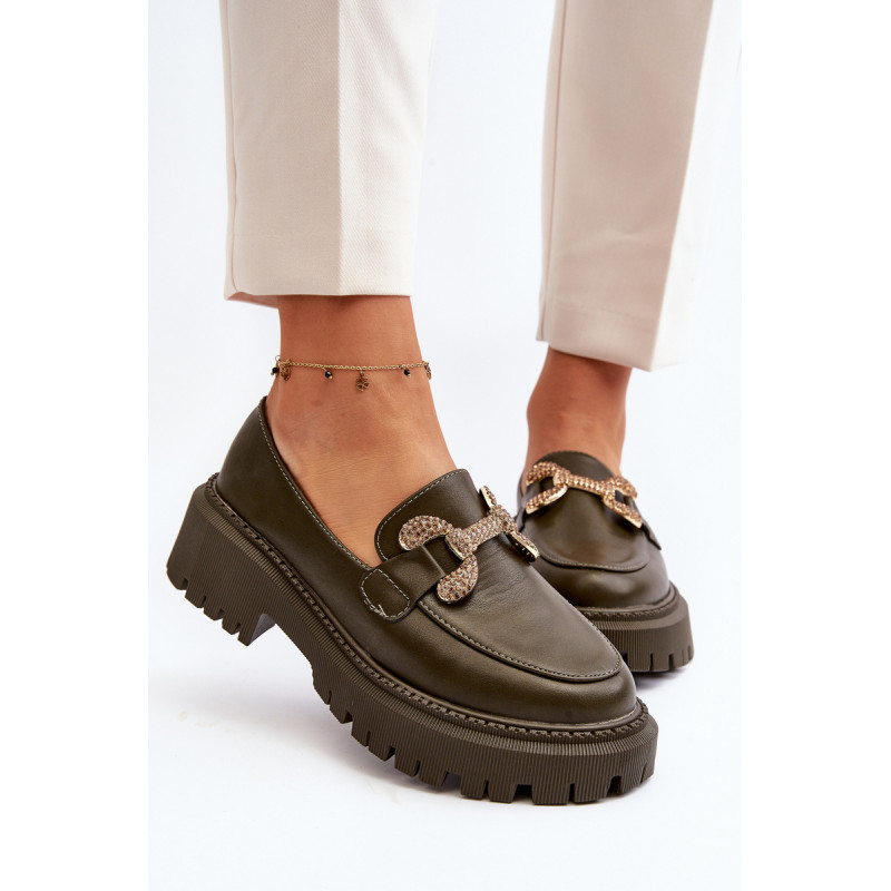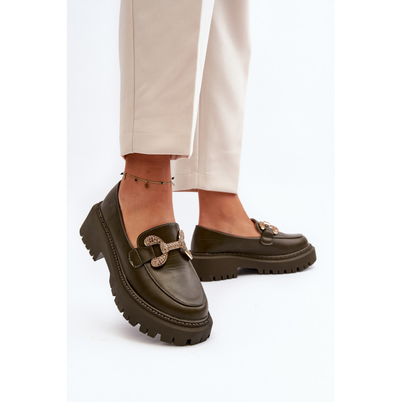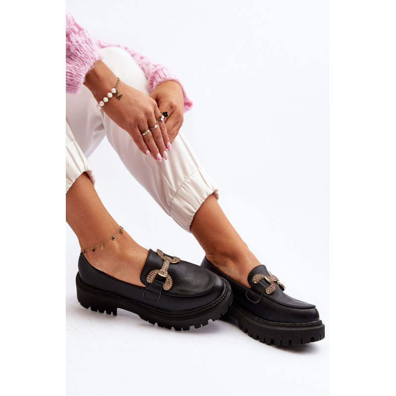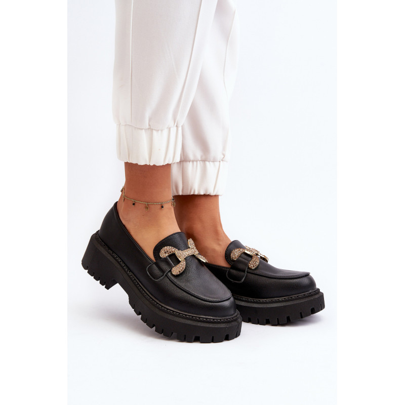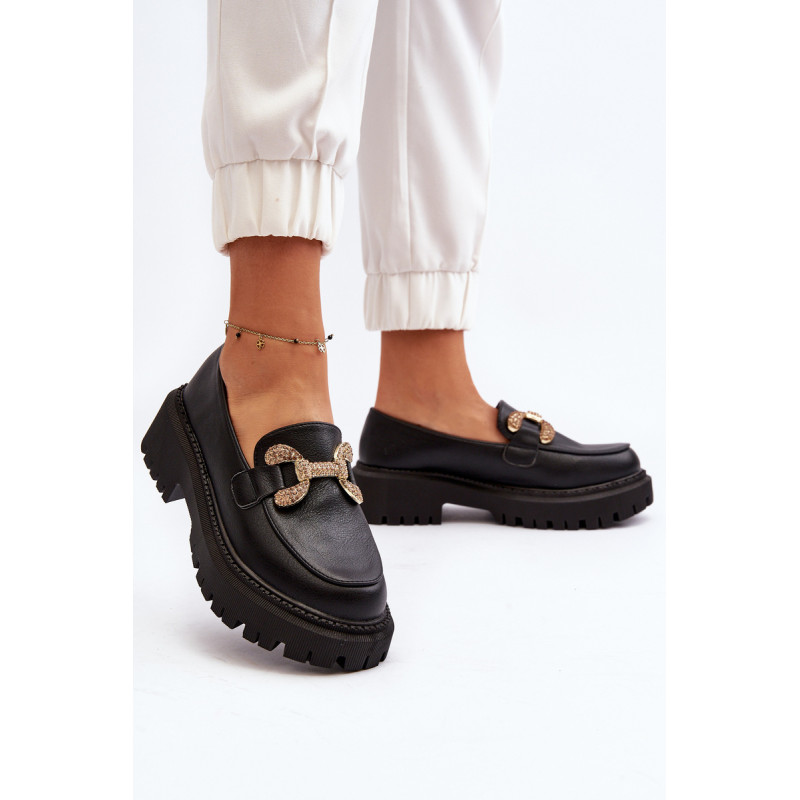 Moteriški mokasinai, pagaminti iš ekologiškos odos. Ant masyvaus, plokščio kulno ir storo pado. Šio modelio pirštai yra suapvalinti, o priekyje yra aukso papuošimas. Jūs tikrai turėtumėte juos turėti savo garderobe! Rinkdamiesi dydį, žiūrėkite dydžių lentelę.