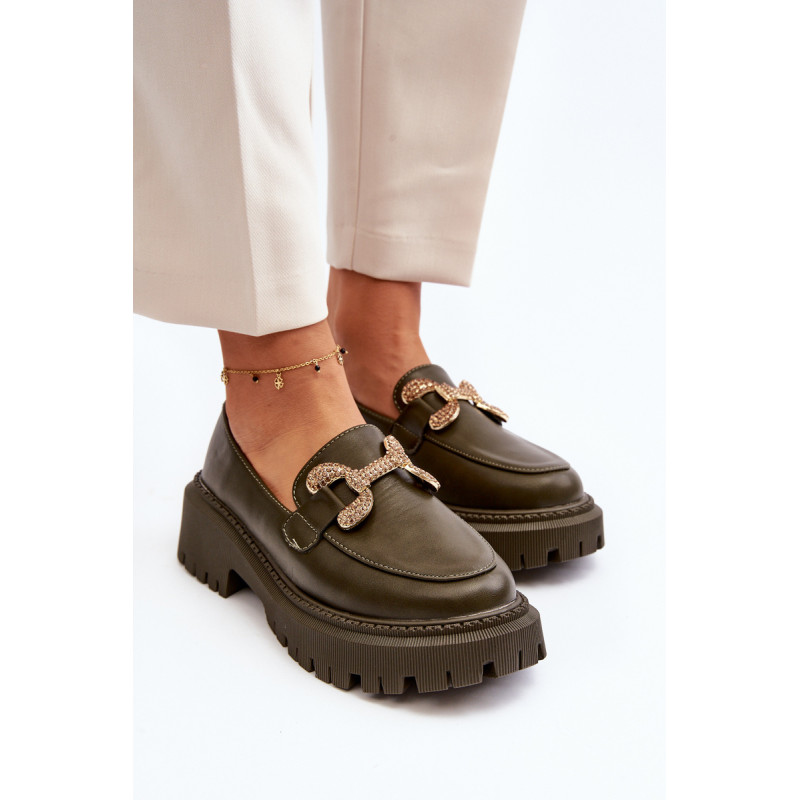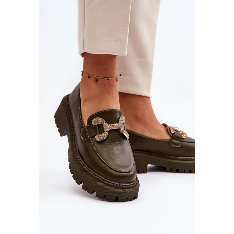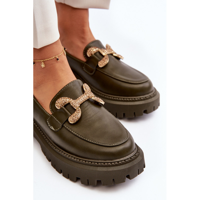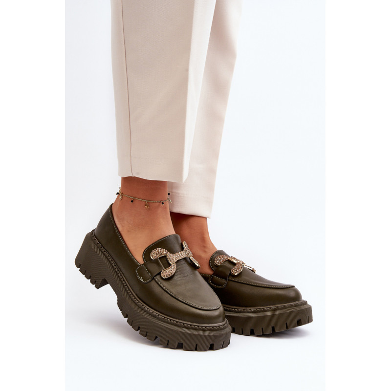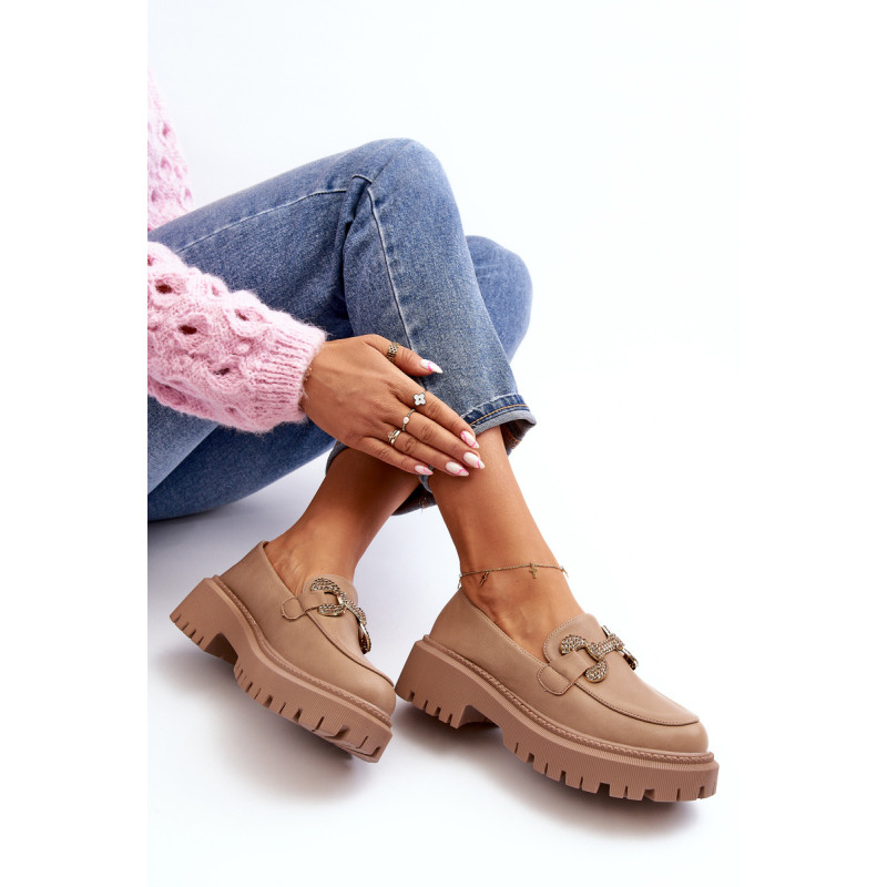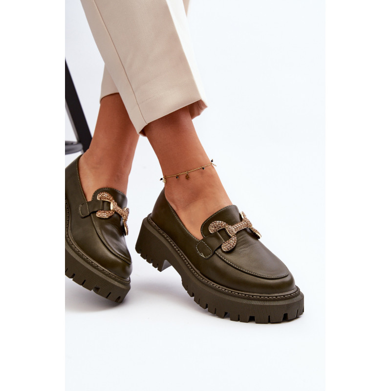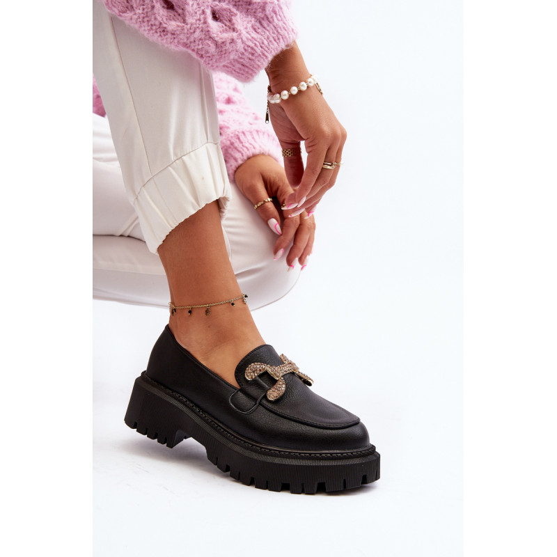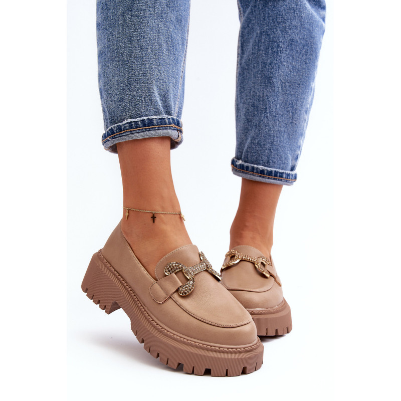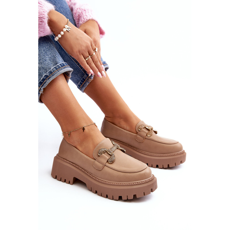 Moteriški mokasinai, pagaminti iš ekologiškos odos. Ant masyvaus, plokščio kulno ir storo pado. Šio modelio pirštai yra suapvalinti, o priekyje yra aukso papuošimas. Jūs tikrai turėtumėte juos turėti savo garderobe! Rinkdamiesi dydį, žiūrėkite dydžių lentelę.