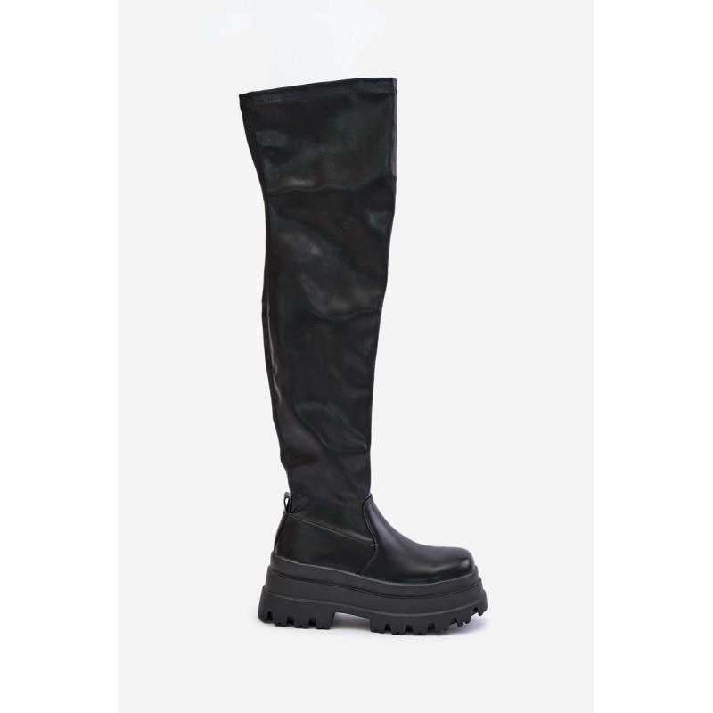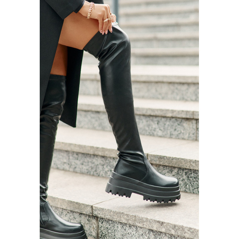 Čizme do kolen, postavljene na masivno platformo, so stilna izbira za hladnejše dni. Model na natikanje, z dodatnim zadrgo na dnu čevlja, kar olajša obuvanje in prilagajanje. Ogrinjene so samo na ravni stopala, zagotavljajo toploto in udobje pri nošenju. Modna zasnova, ki doda značaj vsaki obleki. Pri izbiri velikosti si oglejte tabelo velikosti.