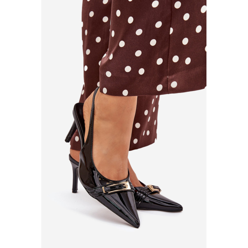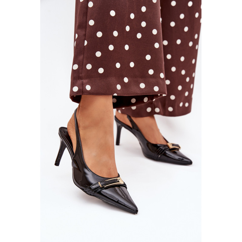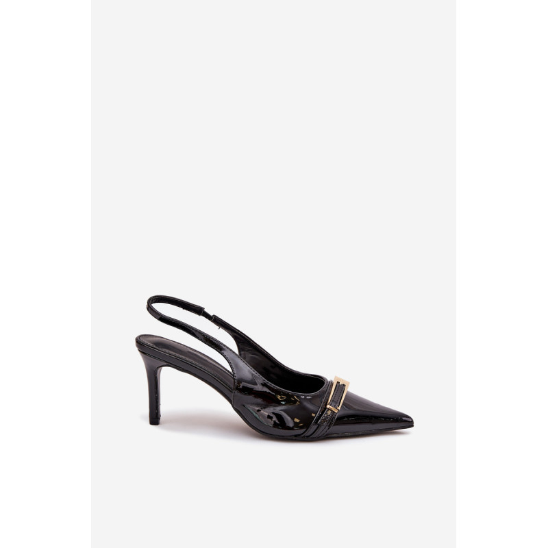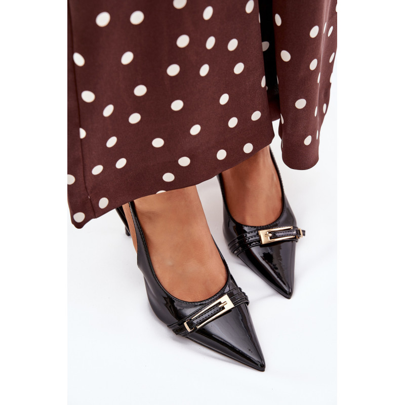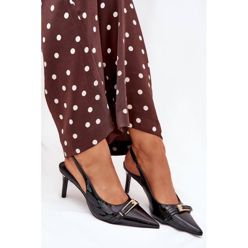 Stilingi ir eleganti ekologiški odiniai aukštakulniai, sumontuoti ant smailių kulnų, yra klasikos ir modernaus akcento derinys. Batų priekyje yra dirželis, puošiamas auksine sagtimi, kuris suteikia jiems išskirtinį šiką. Smailūs galiukai optiškai pailgina kojas, suteikdami siluetui elegantišką išvaizdą. Puikiai tinka vakariniams išėjimams, ypatingoms progoms arba elegantiškiems susitikimams. Renkantis dydį, vadovaukitės dydžių lentele.