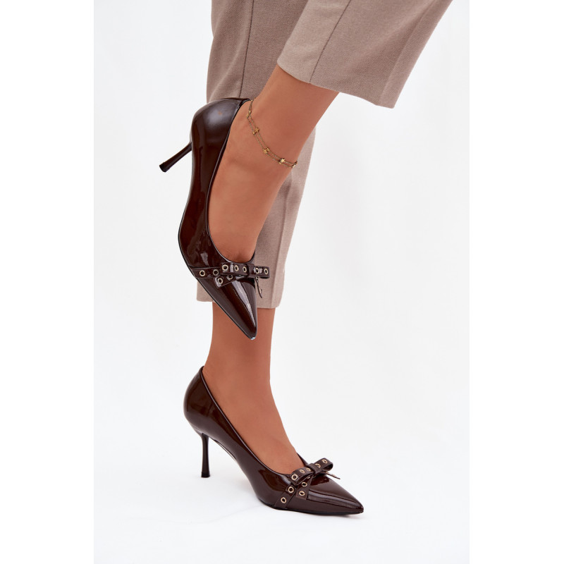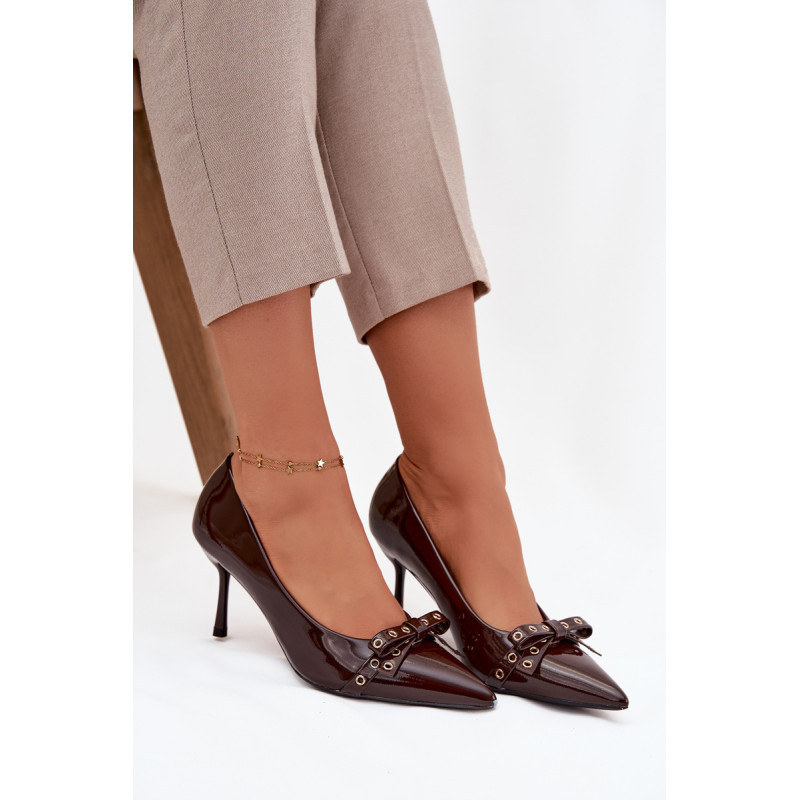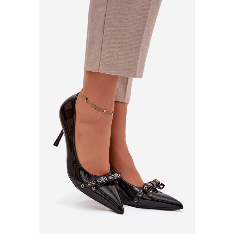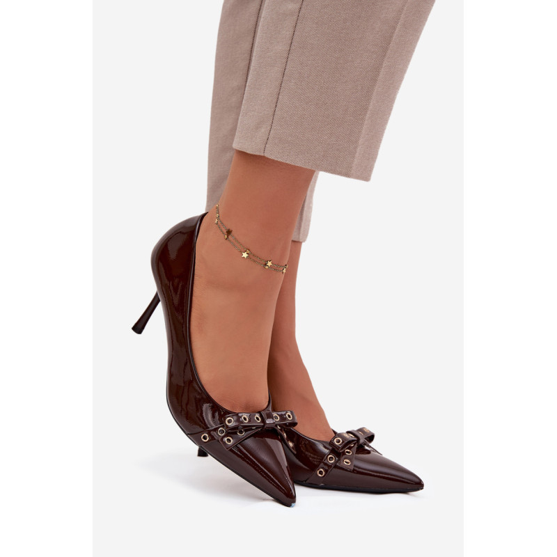 Klasikinės ir žavios aukštakulnės basutės, pagamintos iš lakuotos ekologiškos odos, skirtos moterims, vertinančioms eleganciją ir laikui nepavaldų stilių. Blizganti apdaila suteikia joms rafinuotumo, o siaura nosis gražiai ilgina kojas ir išryškina moterišką siluetą. Priekyje yra subtilus kaspinėlis, suteikiantis bateliams švelnų, romantišką charakterį. Plonas kulnas priduria lengvumo ir elegancijos, tuo pačiu užtikrindamas išskirtinį įvaizdį bet kokia proga. Šios aukštakulnės puikiai tinka tiek vakariniams drabužiams, tiek elegantiškiems biuro stiliams – kiekvieną kartą, kai norite atrodyti stilingai ir jaustis ypatingai. Renkantis dydį, vadovaukitės dydžių lentele.