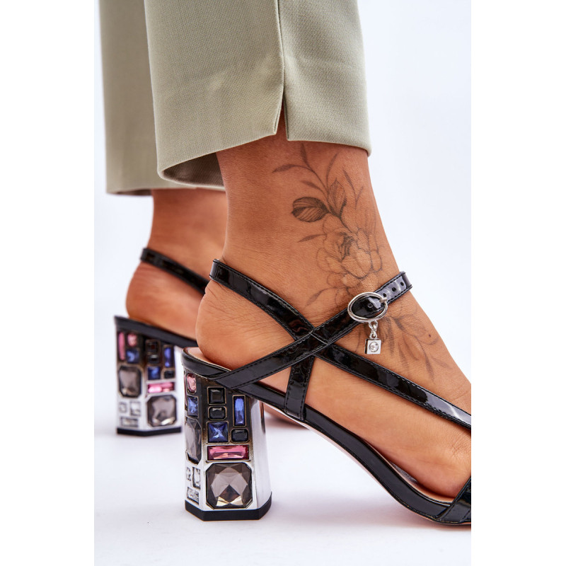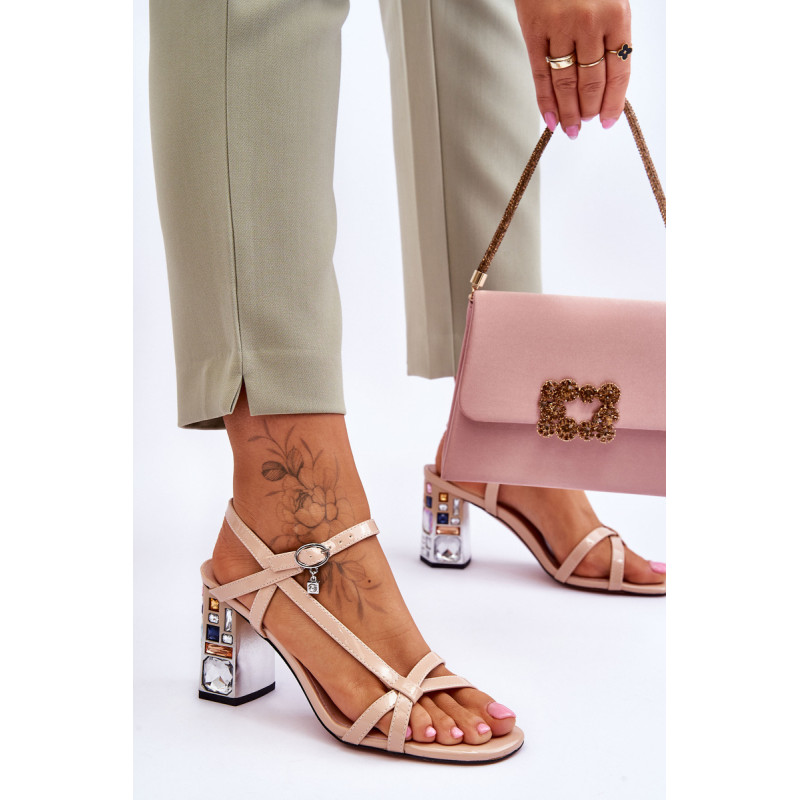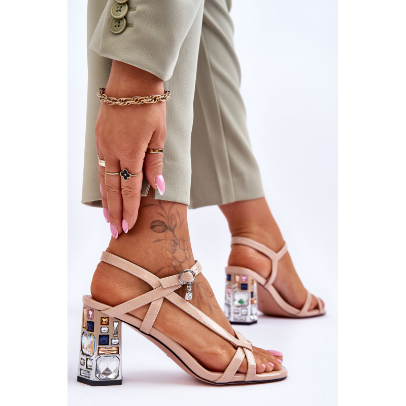 Šie elegantiški sandalai yra pagaminti iš aukštos kokybės eko odos. Šis modelis užsisega reguliuojamu dirželiu su sagtimi su pakabinama puošmena. Sandalai su dryžiais itin erdvūs ir patogūs. Minkštas vidpadis iš natūralios odos užtikrins patogų naudojimą. Sandalai buvo pastatyti ant kulno stulpelio su blizgančiais akmenimis pavidalu. Rinkdamiesi dydį, žiūrėkite dydžių lentelę.