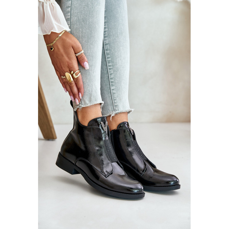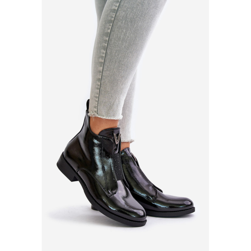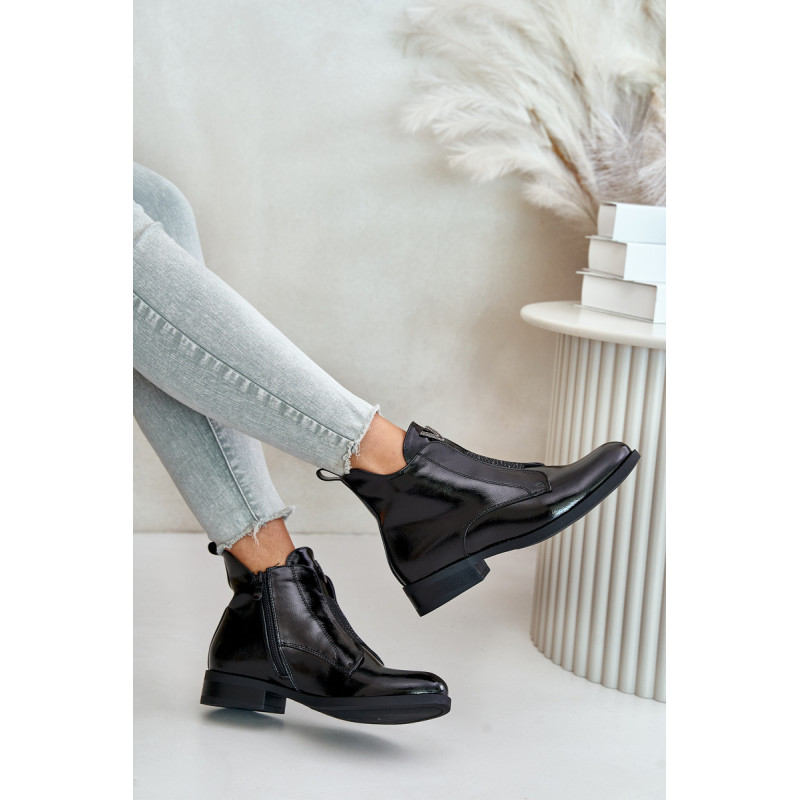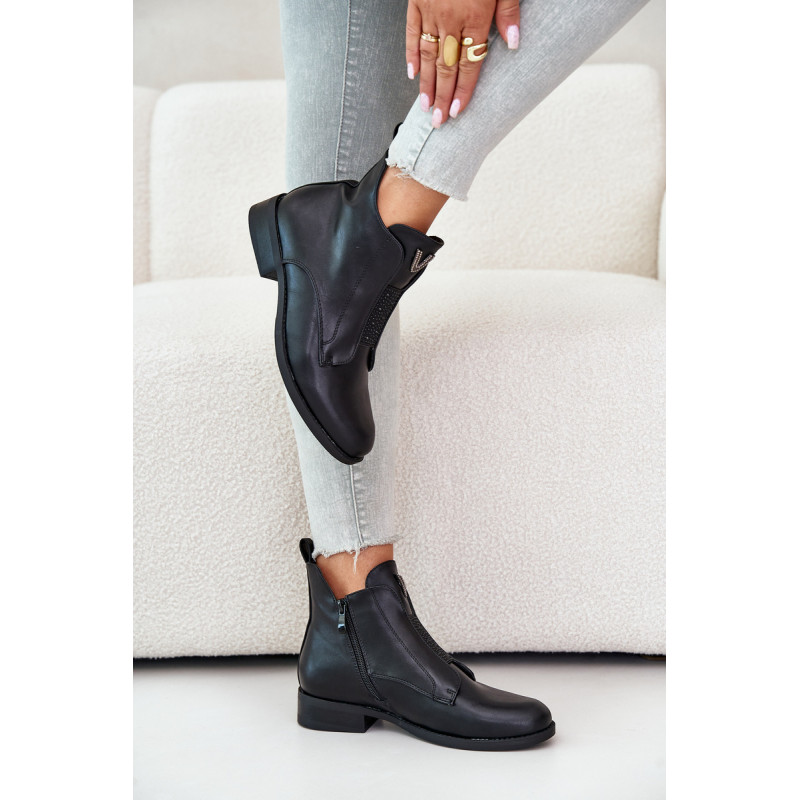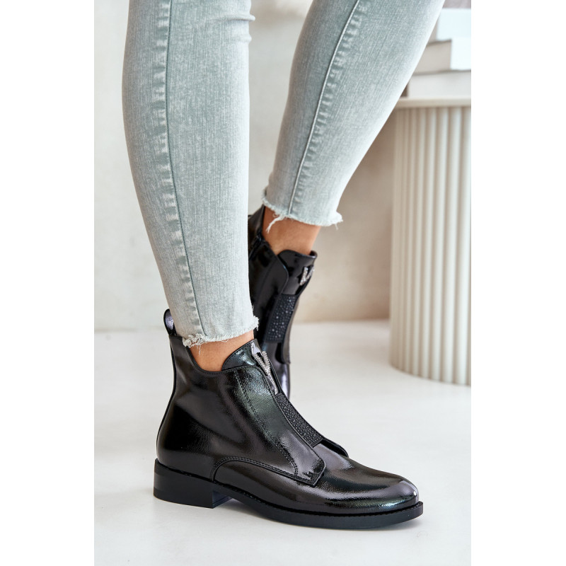 Moteriški batai iš ekologiškos odos. Ant plokščio kulno, kuris užtikrina stabilumą kiekviename žingsnyje. Vidus apšiltintas batų vilna. Pirštai suapvalinti. Užsegamas užtrauktuku. Priekyje puoštas elastiniu įdėklu ir maža detale ant liežuvėlio. Kotas yra iki kulkšnies. Sustiprintas kulnas. Rinkdamiesi dydį, žiūrėkite dydžių lentelę.