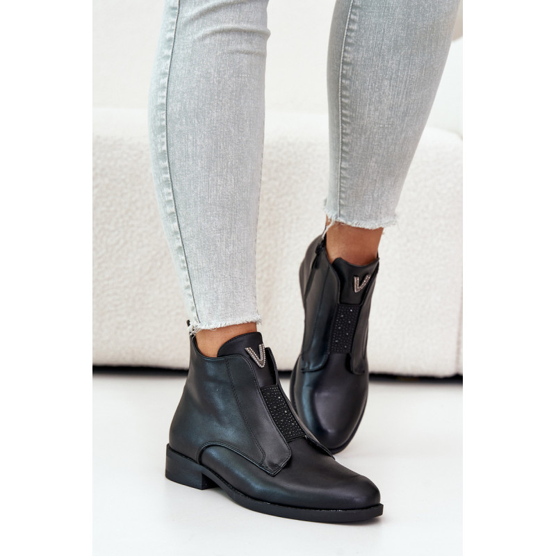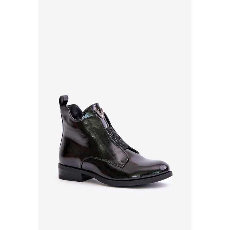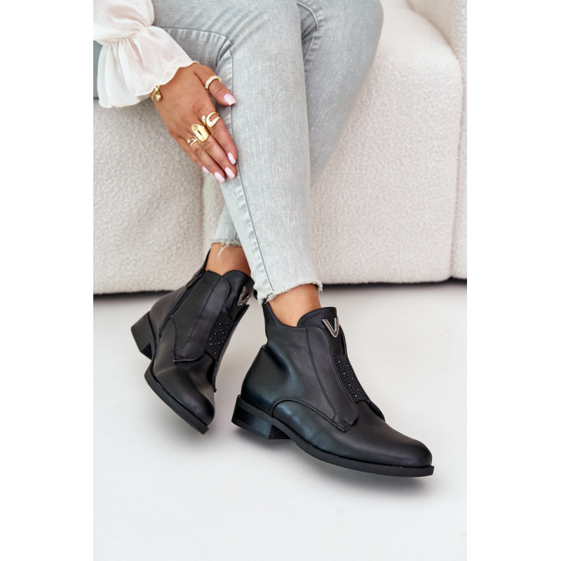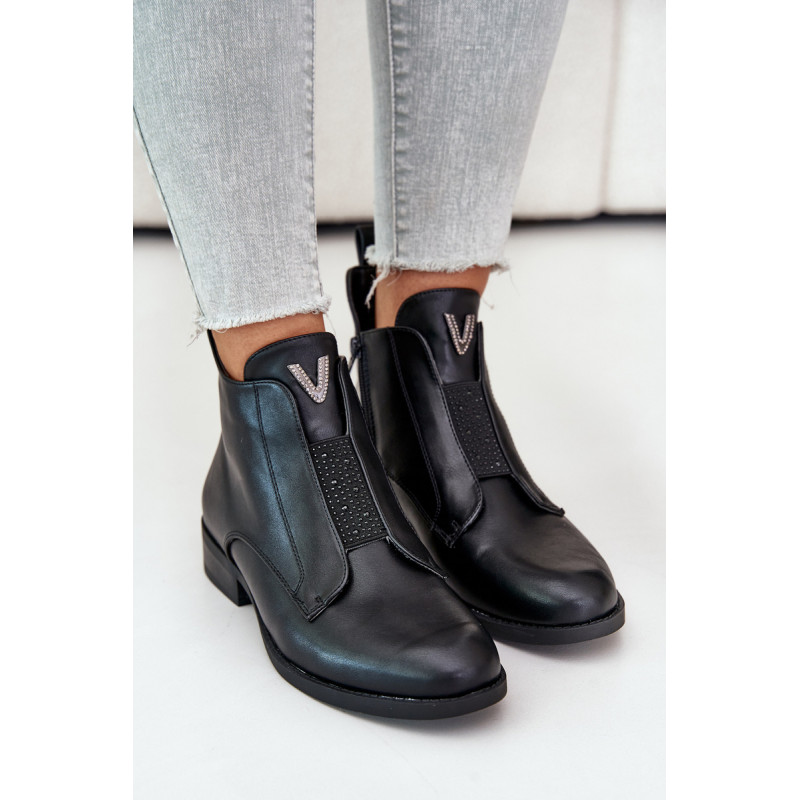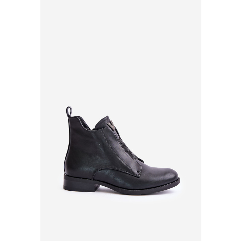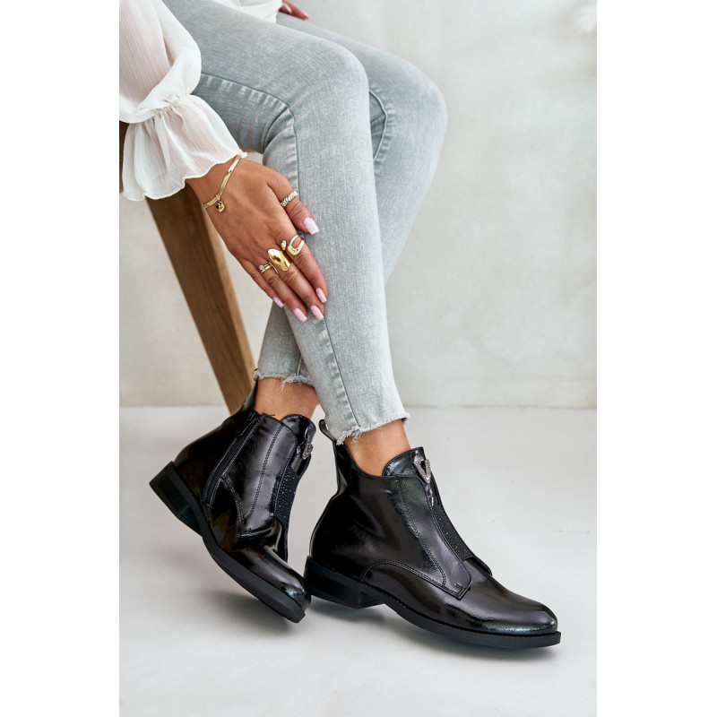 Moteriški batai iš ekologiškos odos. Ant plokščio kulno, kuris užtikrina stabilumą kiekviename žingsnyje. Vidus apšiltintas batų vilna. Pirštai suapvalinti. Užsegamas užtrauktuku. Priekyje puoštas elastiniu įdėklu ir maža detale ant liežuvėlio. Kotas yra iki kulkšnies. Sustiprintas kulnas. Rinkdamiesi dydį, žiūrėkite dydžių lentelę.