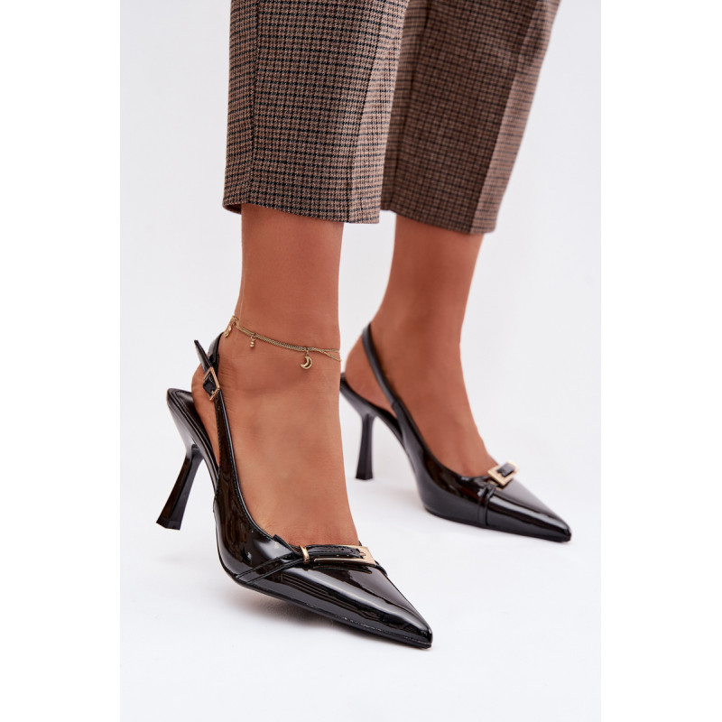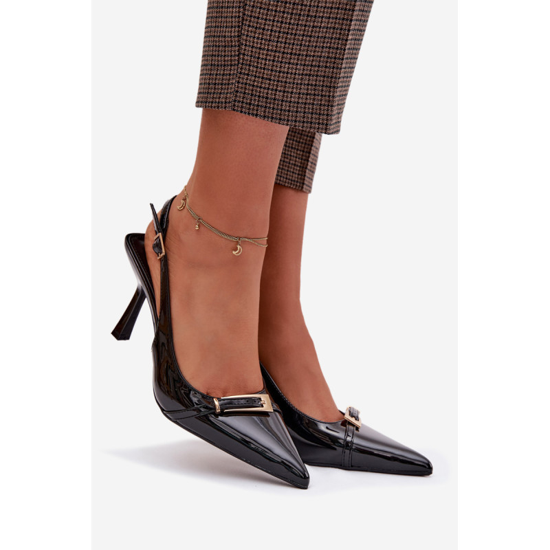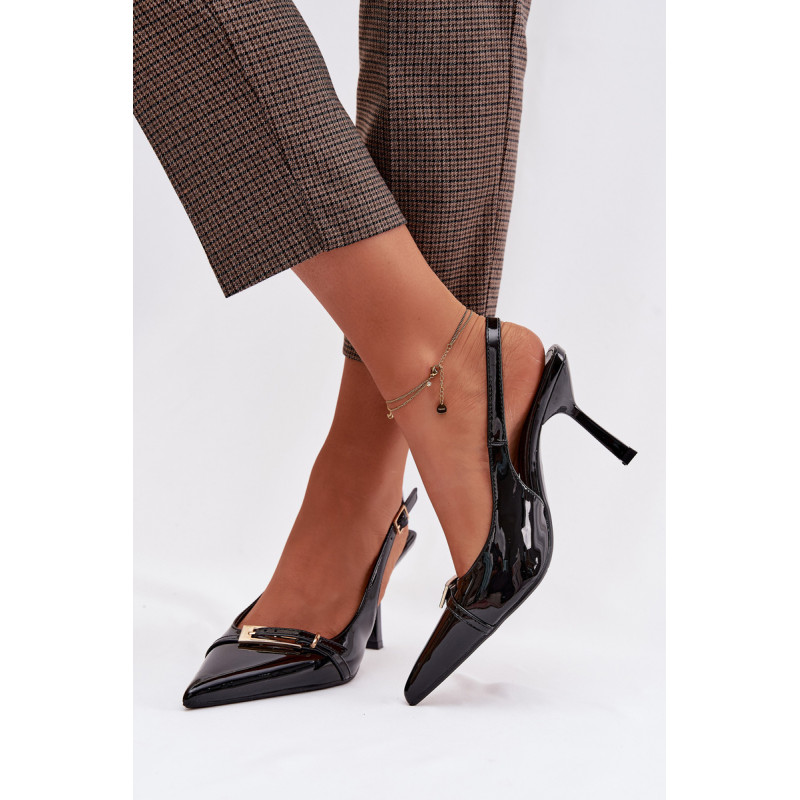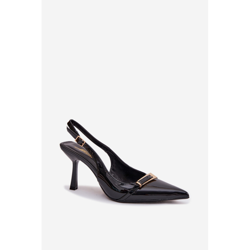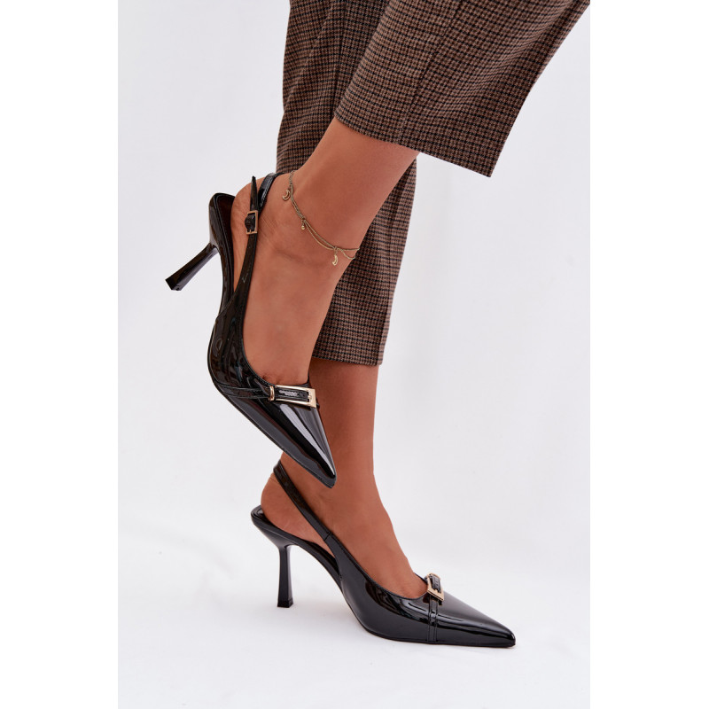 Eleganti moteriški sandalai, pagaminti iš blizgios eco odos, puikiai tinka moterims, norinčioms pabrėžti savo išskirtinį stilių. Plonas stileto kulnas suteikia siluetui lengvumo ir elegancijos, reguliuojamas dirželis su sagtimi leidžia puikiai pritaikyti prie kojos. Priekinė dalis papuošta subtiliu dirželiu su auksine sagtimi, kuris suteikia stilingą akcentą. Aštrus priekinis nosis vizualiai ilgina kojas ir suteikia išvaizdai elegancijos. Šis modelis puikiai tinka vakarinėms išvykoms, šventėms ir oficialiems susitikimams. Renkantis dydį, vadovaukitės dydžių lentele.