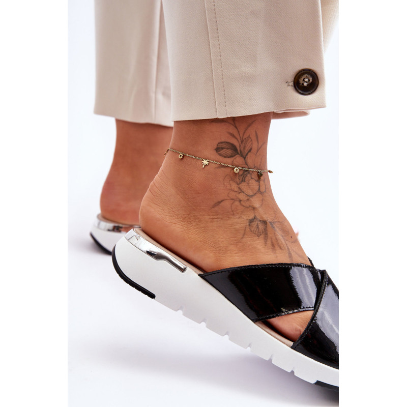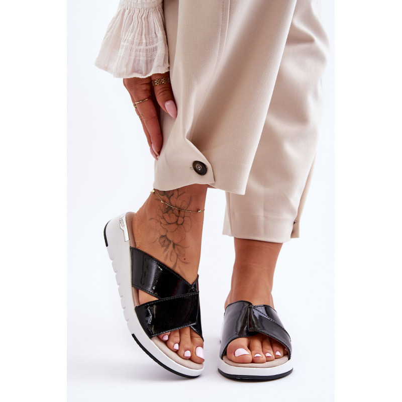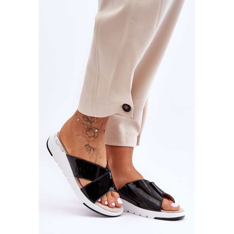 Moteriški mulai pagaminti iš natūralios odos. Šio modelio viršutinėje dalyje yra įsiūta elastinė juosta. Vidpadis Comfort pagamintas iš natūralios odos ir yra itin patogus naudoti. Mulai pastatyti ant platformos ir subtilaus kulno. Padas pagamintas iš sintetinės medžiagos. Atviras, suapvalintas pirštas. Tobulas kasdienis modelis! Renkantis dydį, vadovaukitės dydžių lentele.