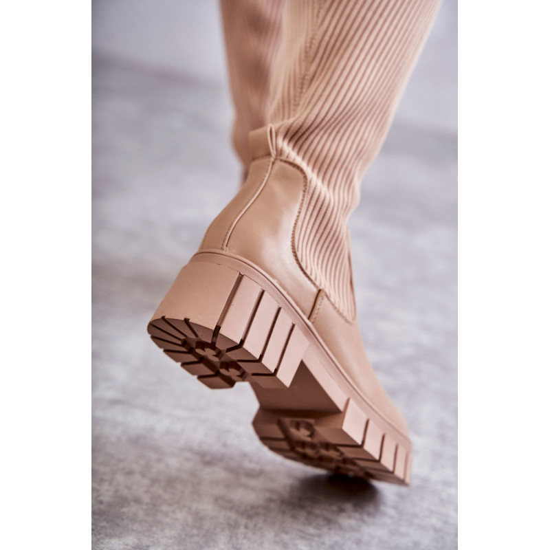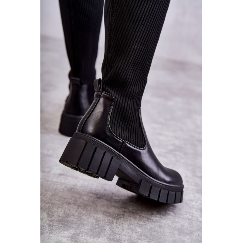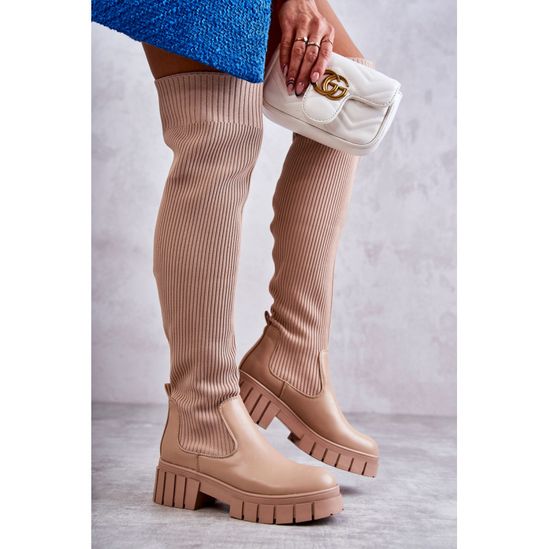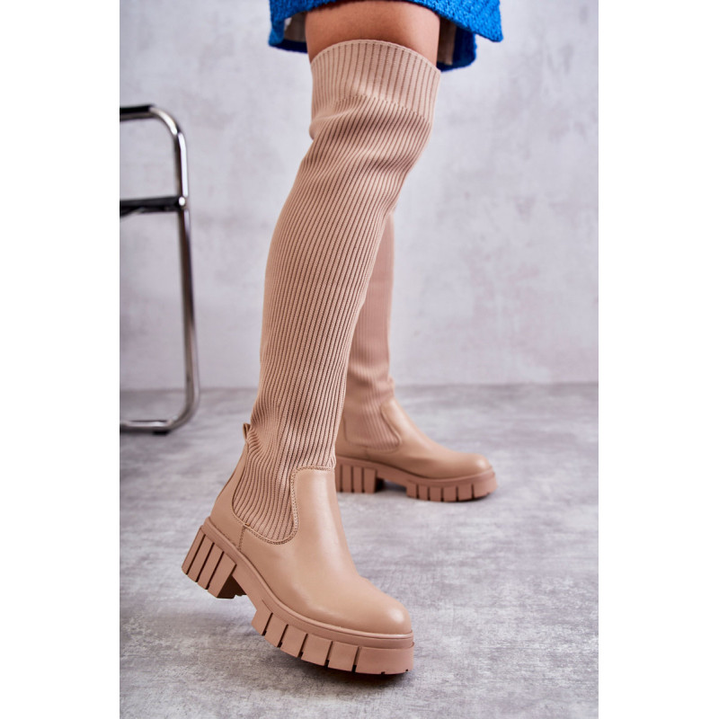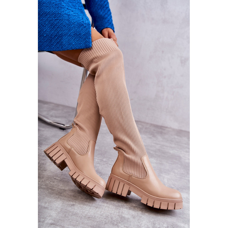 Madingi moteriški batai yra pagaminti iš ekologiškos odos ir briaunoto audinio derinio. Viršutinė kelio dalis. Modelis montuojamas ant plokščio kulno ir subtilios platformos su grioveliais. Šie batai turi izoliuotą vidpadį. Suapvalinta nosis. Slip-on modelis. Jie puikiai atrodys prie suknelių ar mini sijonų. Renkantis dydį, naudokite dydžių lentelę.