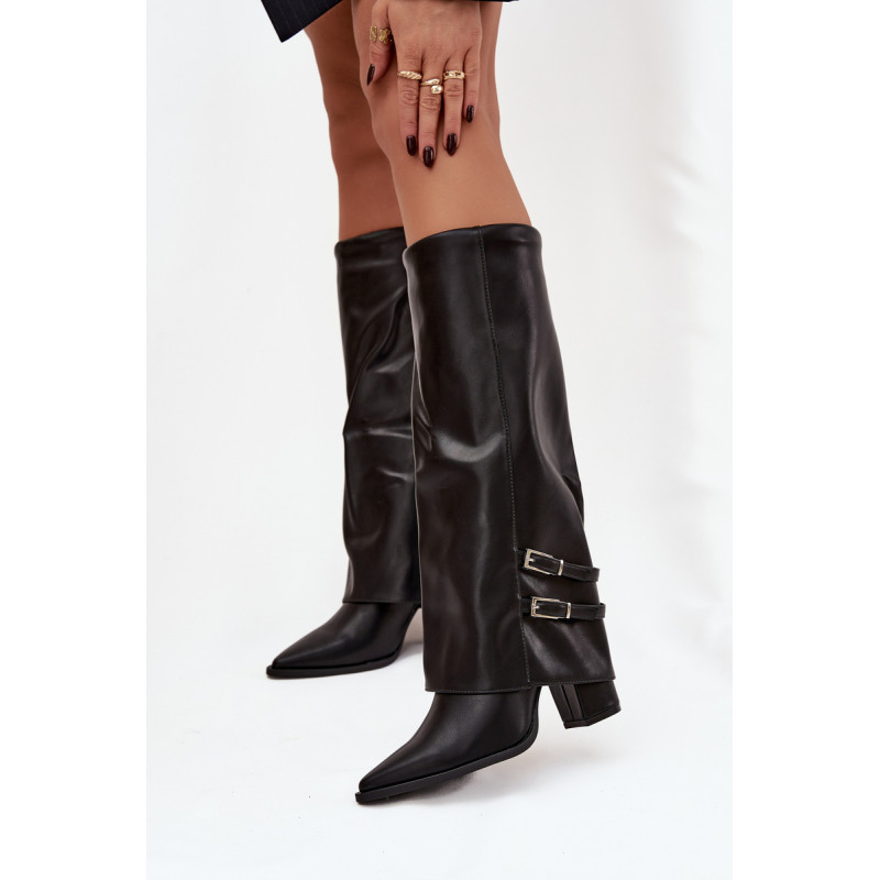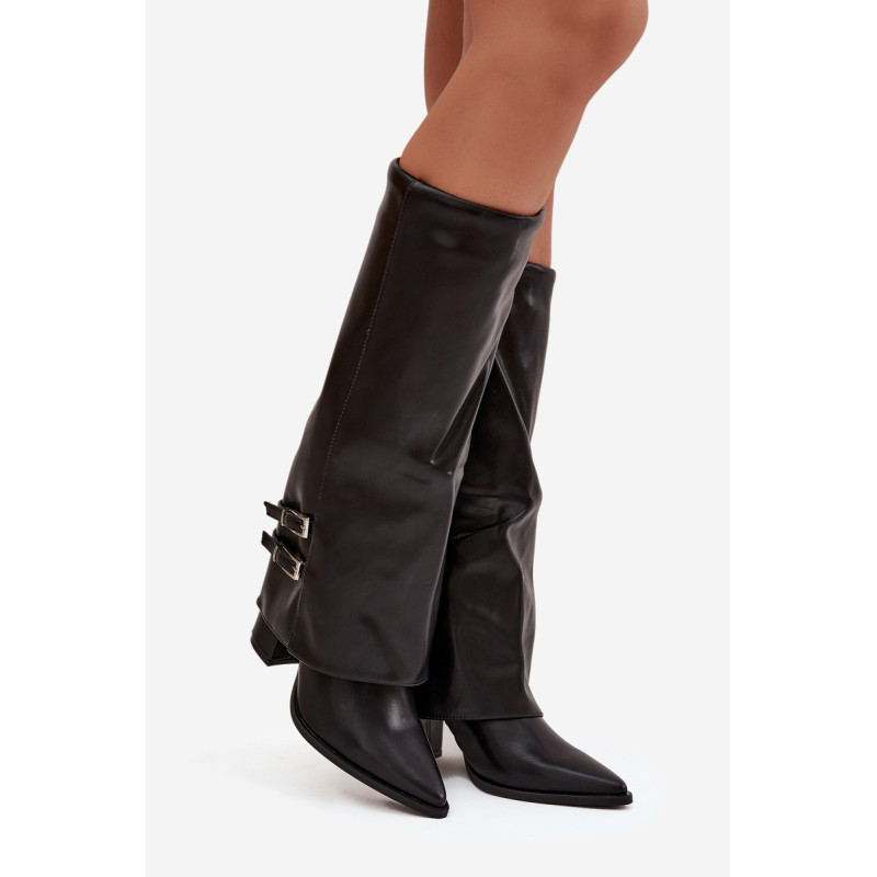 Moteriški batai iš ekologiškai pagamintos odos su stilingu dizainu ir apvartu yra elegancijos ir modernios dizaino kombinacija. Uždaryti užtrauktuku, su smailiais pirštais, optiškai pailgina kojas. Blokinis kulnas visą dieną užtikrina komfortą. Ant apvarto yra trys dirželiai su sagtimis, kurie suteikia išskirtinį charakterį. Avalynės pūkų izoliacija garantuoja šilumą, todėl jie yra puikus pasirinkimas vėsesnėms dienoms. Renkantis dydį, vadovaukitės dydžių lentele.