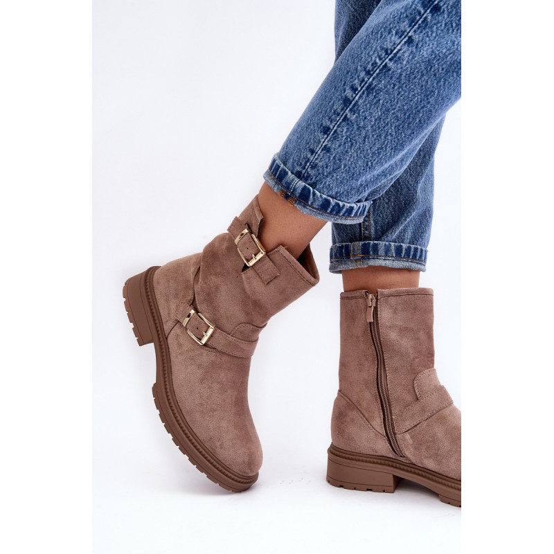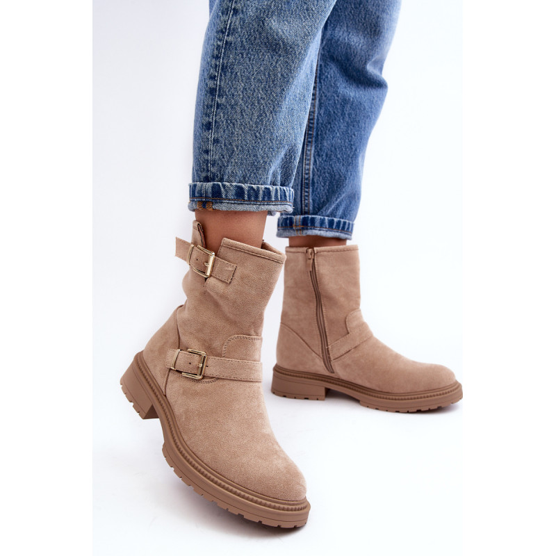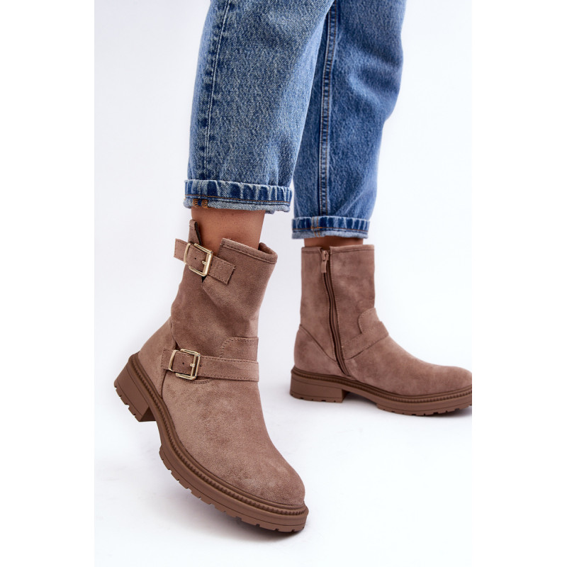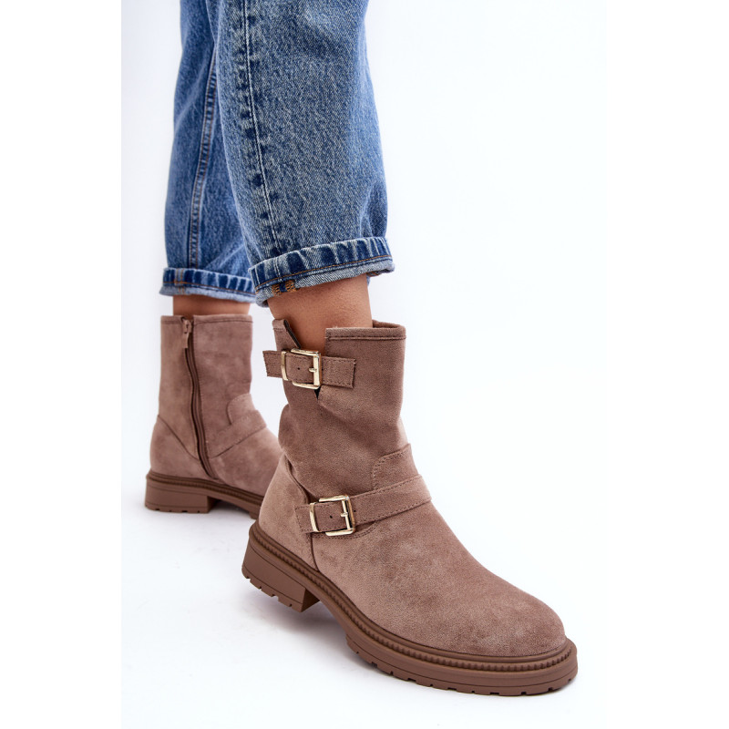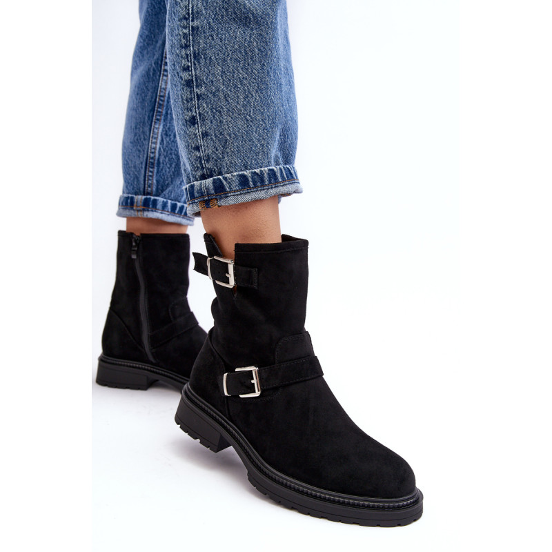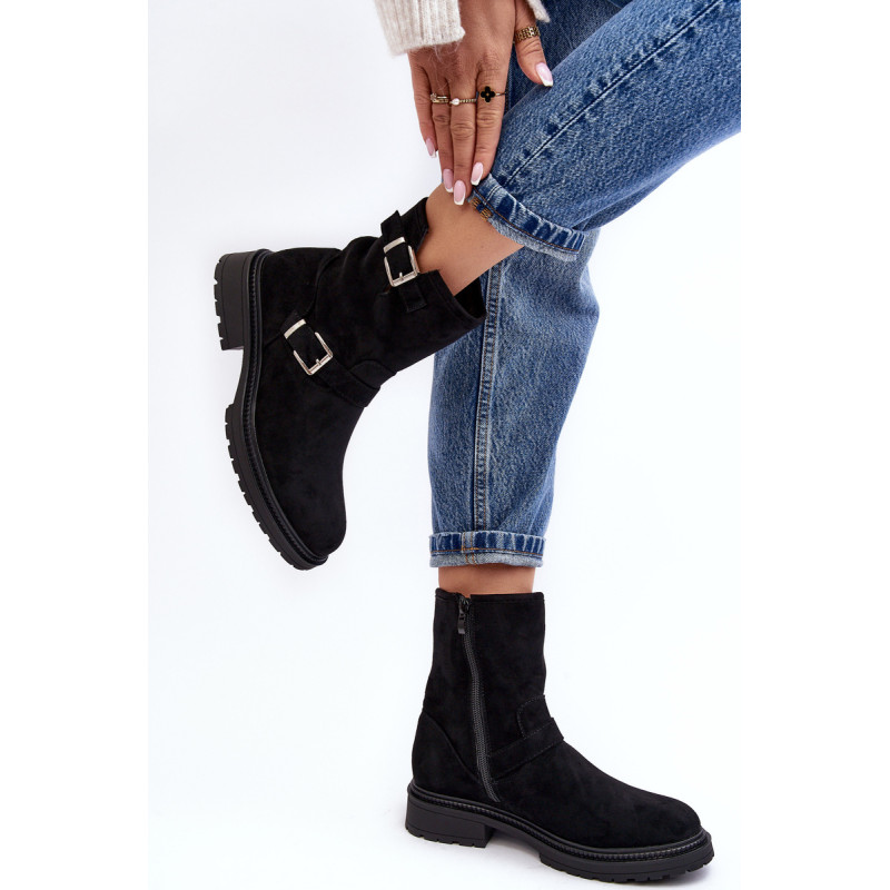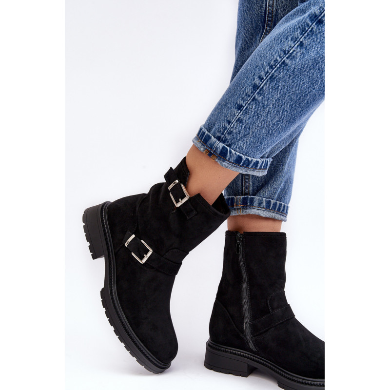 Klasikiniai moteriški kulkšnies batai su kotu. Nustatykite ant plokščio kulno. Šone užsegamas užtrauktuku. Suapvalinti kojų pirštai. Sustingęs skaitiklis. Kotas dekoruotas dirželiais su sagtimi. Minkštas eko odos vidpadis suteiks komforto naudojimo metu. Puikiai tiks prie daugelio rudens drabužių! Renkantis dydį, vadovaukitės dydžių lentele.