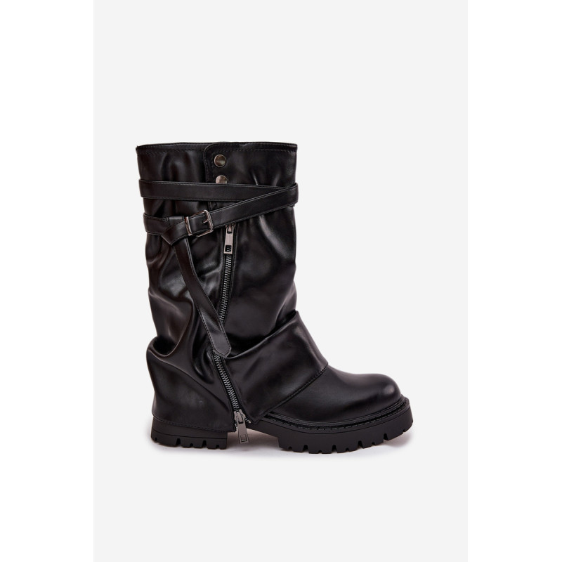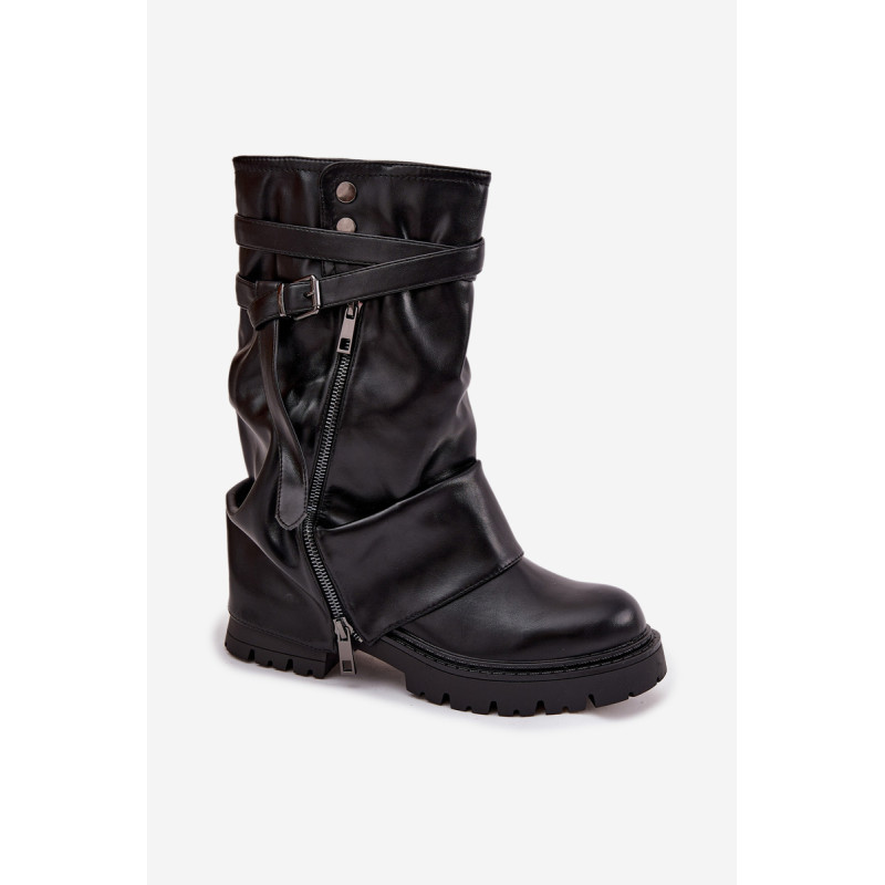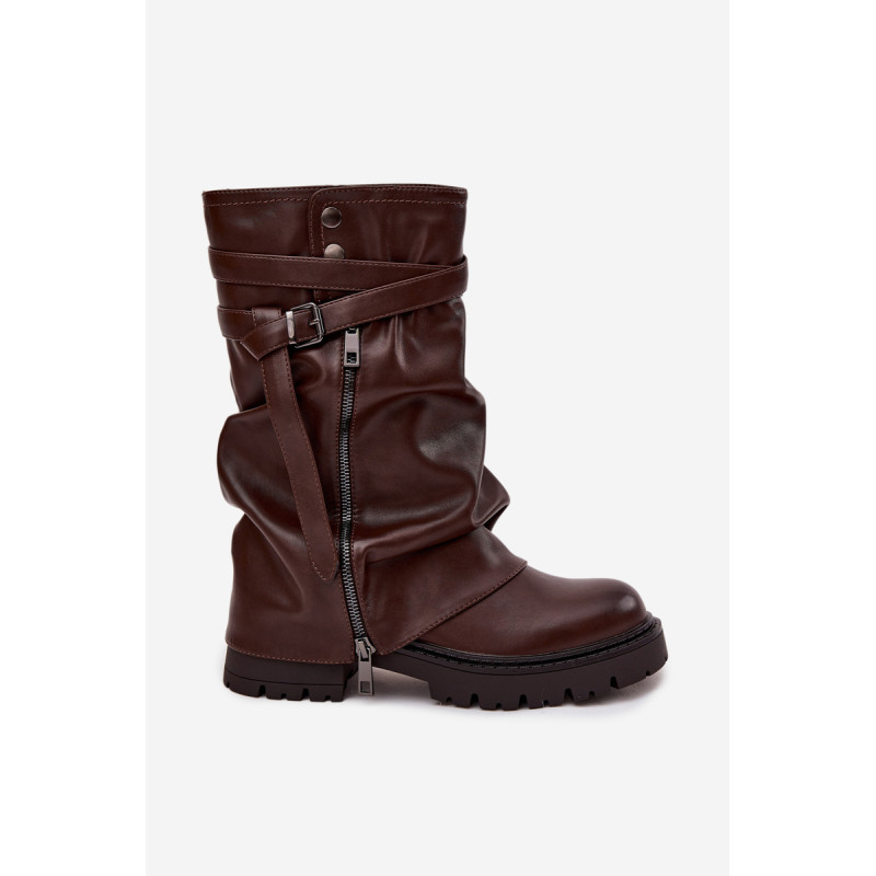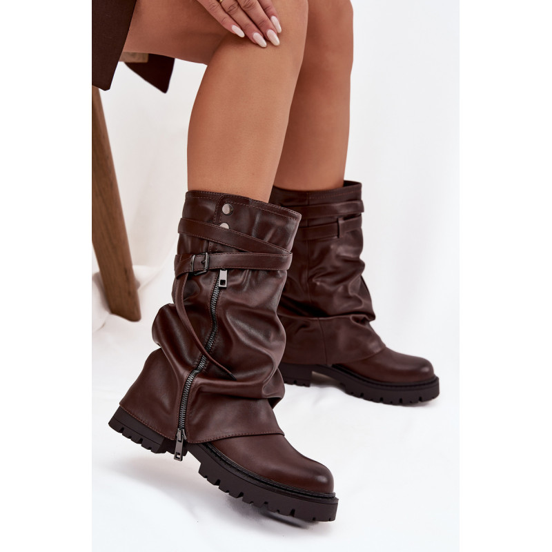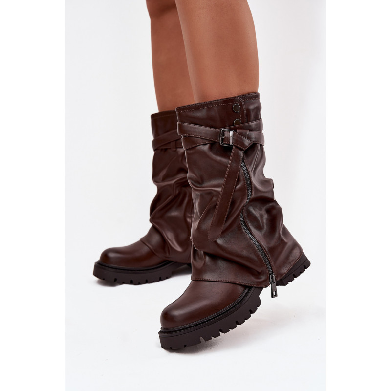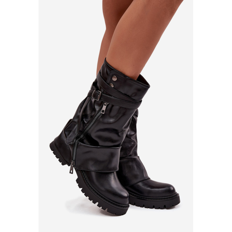 Moteriški puskojiniai batai siekia iki blauzdos vidurio ir yra stilingas pasirinkimas moterims, kurios vertina madingą išvaizdą ir kasdienį patogumą. Modelis išsiskiria įspūdingu, apverstu ir šiek tiek raukšlėtu viršumi. Stilingi akcentai yra dekoratyvinė juosta su sagtimi ir dekoratyvinis užtrauktukas, kurie suteikia modernų įvaizdį ir pabrėžia jų išskirtinumą. Plokščias kulnas užtikrina patogumą net ir ilgai dėvint, todėl šie batai yra puikus pasirinkimas kasdieniam naudojimui. Šis madingas modelis puikiai dera su prigludusiomis kelnėmis, leggingais, taip pat su suknelėmis ar sijonais, kuriant stilingus ir moteriškus derinius, idealiai tinkančius rudens-žiemos sezonui. Renkantis dydį, vadovaukitės dydžių lentele.