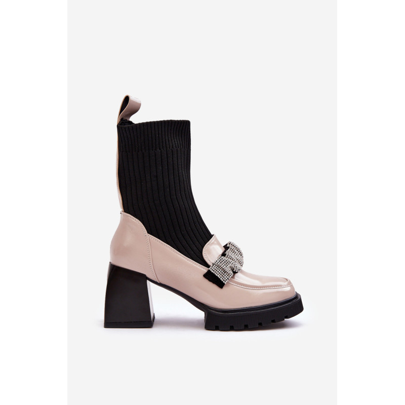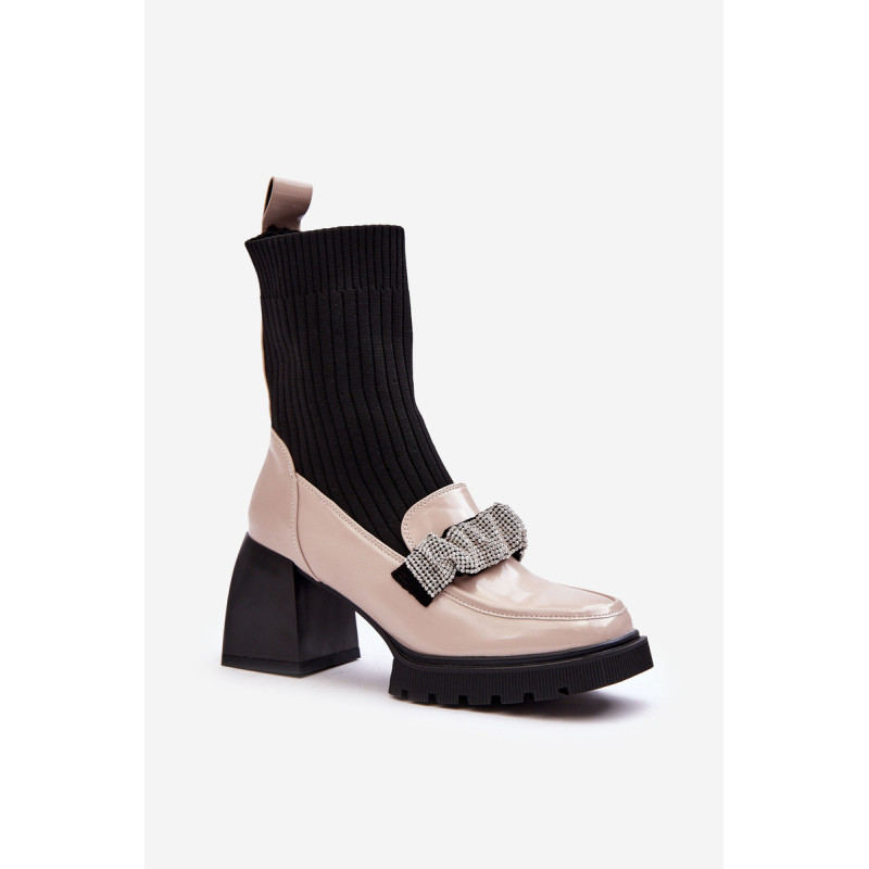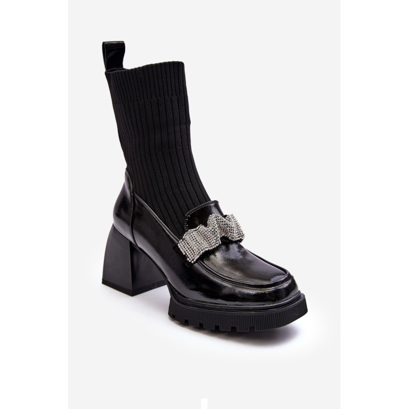 Moteriški batai buvo pagaminti iš aukštos kokybės ekologiškos odos. Viršus kojinių stiliaus. Priekyje klostuotas diržas, dekoruotas blizgančiomis smeigėmis. Kvadratiniai kojų pirštai. Modelis stovi ant stabilaus blokinio kulno. Sustiprinta pirštų dangtelis. Šis modelis yra šio sezono hitas – jūs turite jį turėti! Rinkdamiesi dydį žiūrėkite dydžių lentelę.