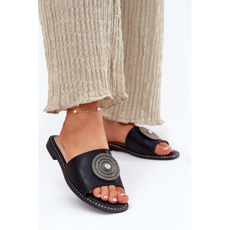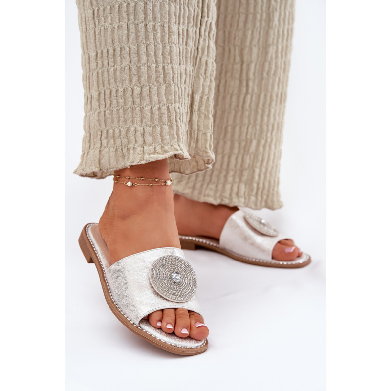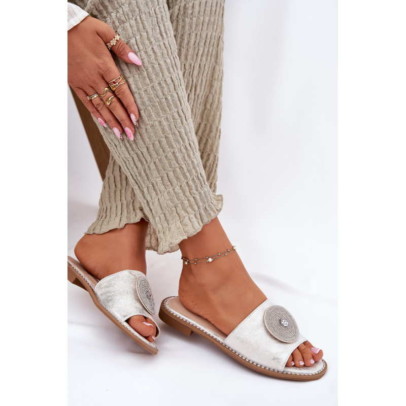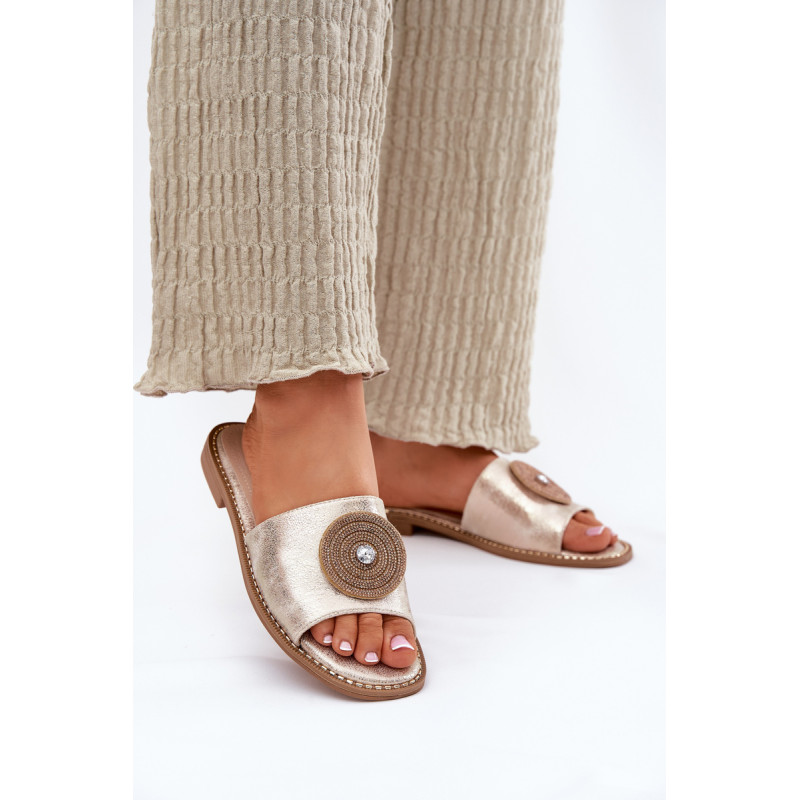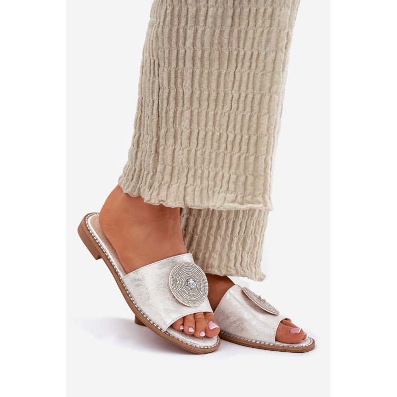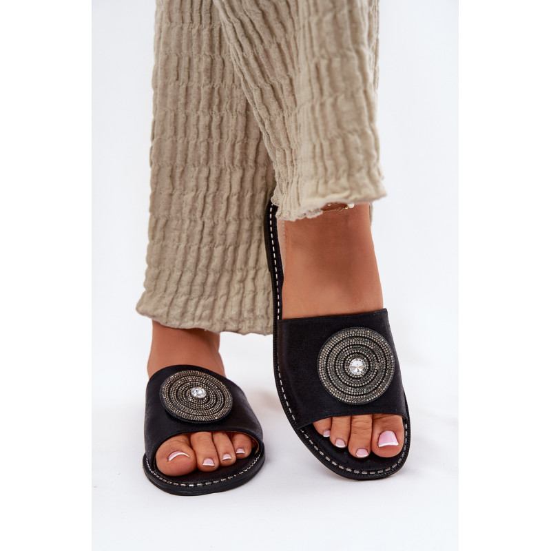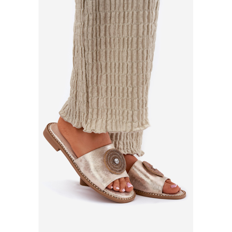 Eleganti moteriški šlepetės, pagamintos iš aukštos kokybės eko odos. Įrengtos ant plokščio kulno, jos užtikrina stabilumą ir komfortą visą dieną. Oda įdėklas garantuoja komfortą ir tinkamą ventiliaciją, rūpindamasi kojų patogumu net karštomis dienomis. Priekyje yra dekoratyvinis elementas, kuris suteikia unikalaus žavesio ir elegancijos, todėl jis yra puikus pasirinkimas vasaros stiliams. Šios šlepetės yra puiki galimybė tiek kasdieniams, tiek elegantiškesniems deriniams. Renkantis dydį, vadovaukitės dydžių lentele.