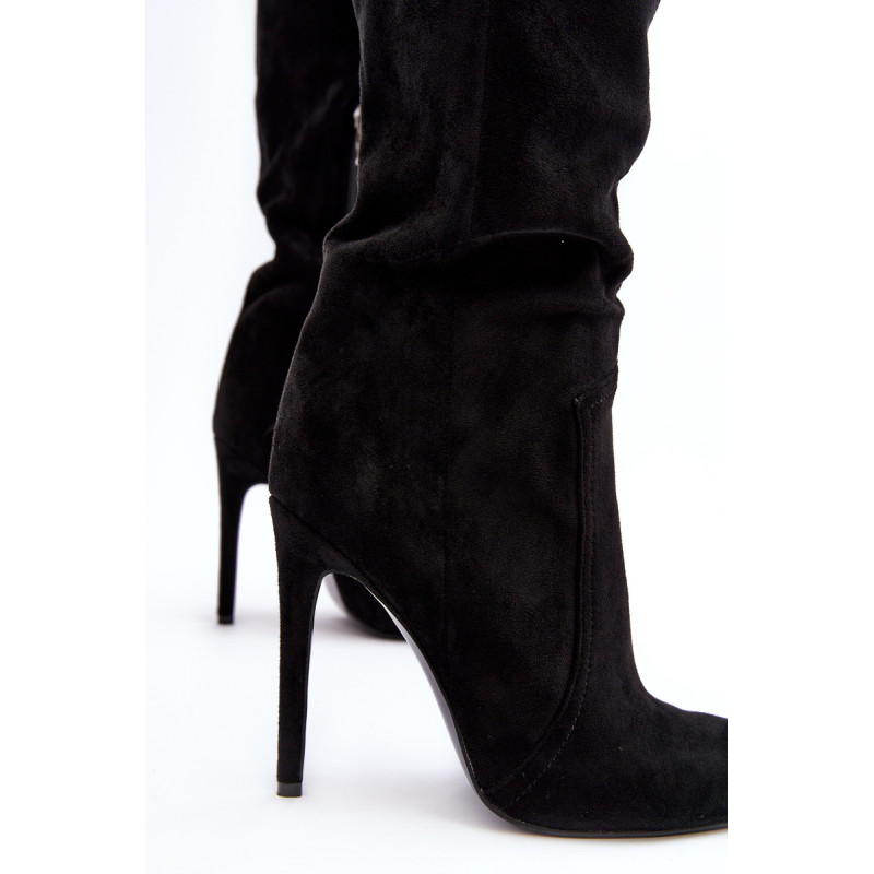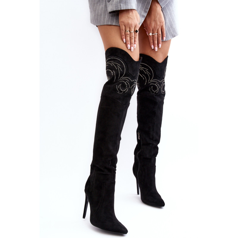 Moteriški batai aukštu viršų virš kelių. Nustatyti ant kulno stileto formos. Pagaminta iš ekologiškos zomšos. Užsegamas modelis su papildomu užtrauktuku. Smailūs pirštai optiškai lieknins kojas. Vidus švelniai paminkštintas malonia liesti batų antklode. Kojos pirštas sustingęs. Kulkšnies viršus puoštas siūlėmis ir kalnų krištolais. Šį modelį privalote turėti savo drabužių spintoje! Rinkdamiesi dydį, vadovaukitės dydžių lentele.