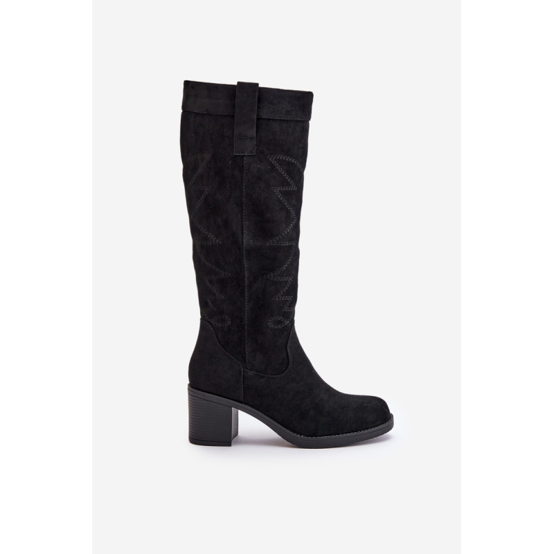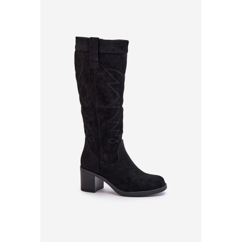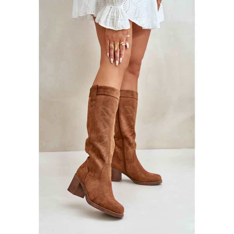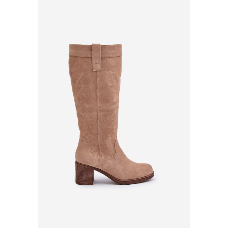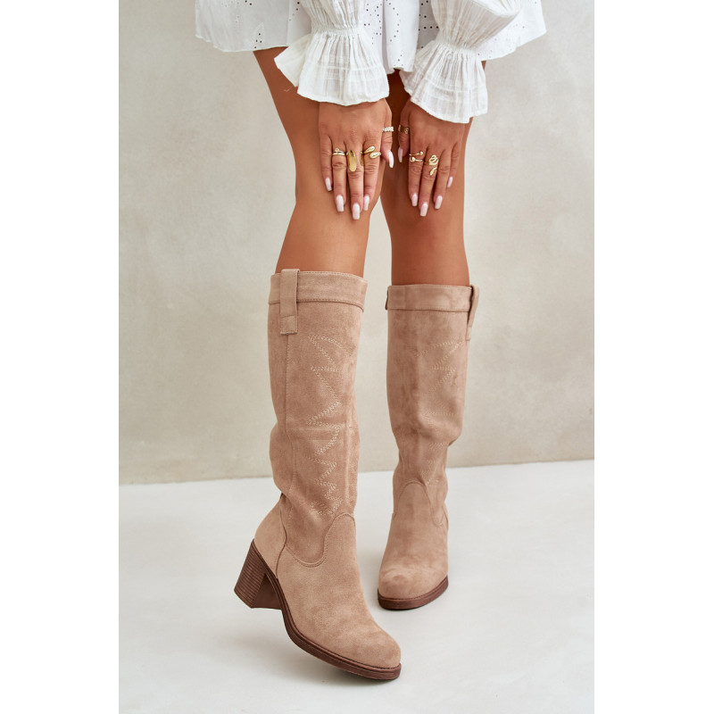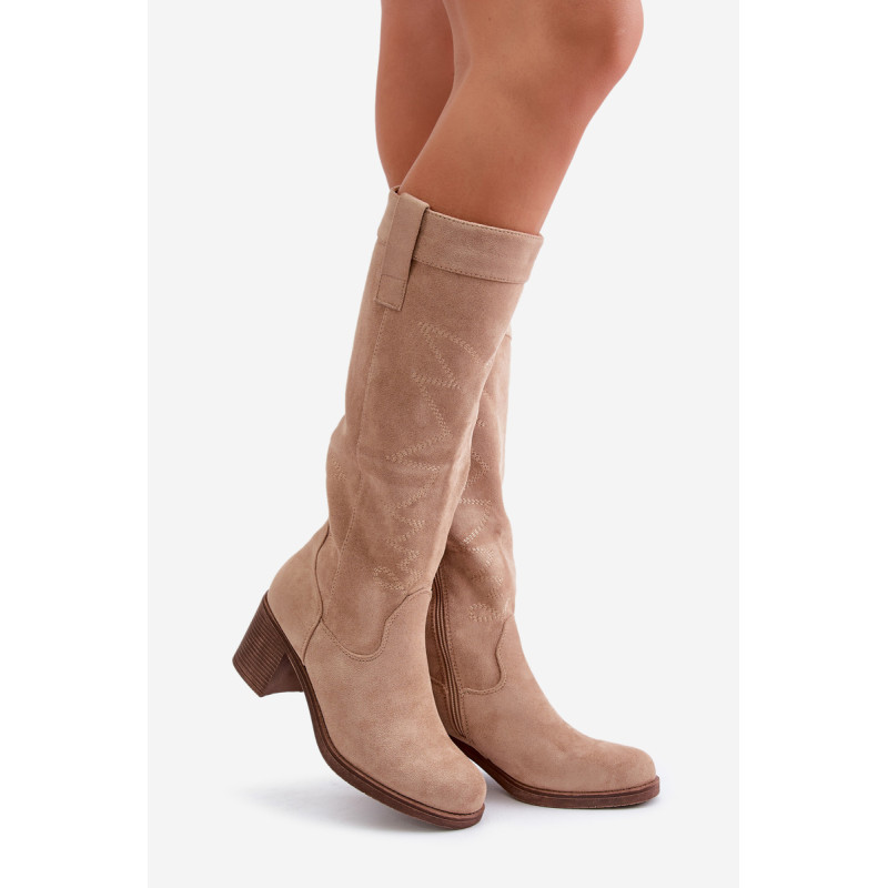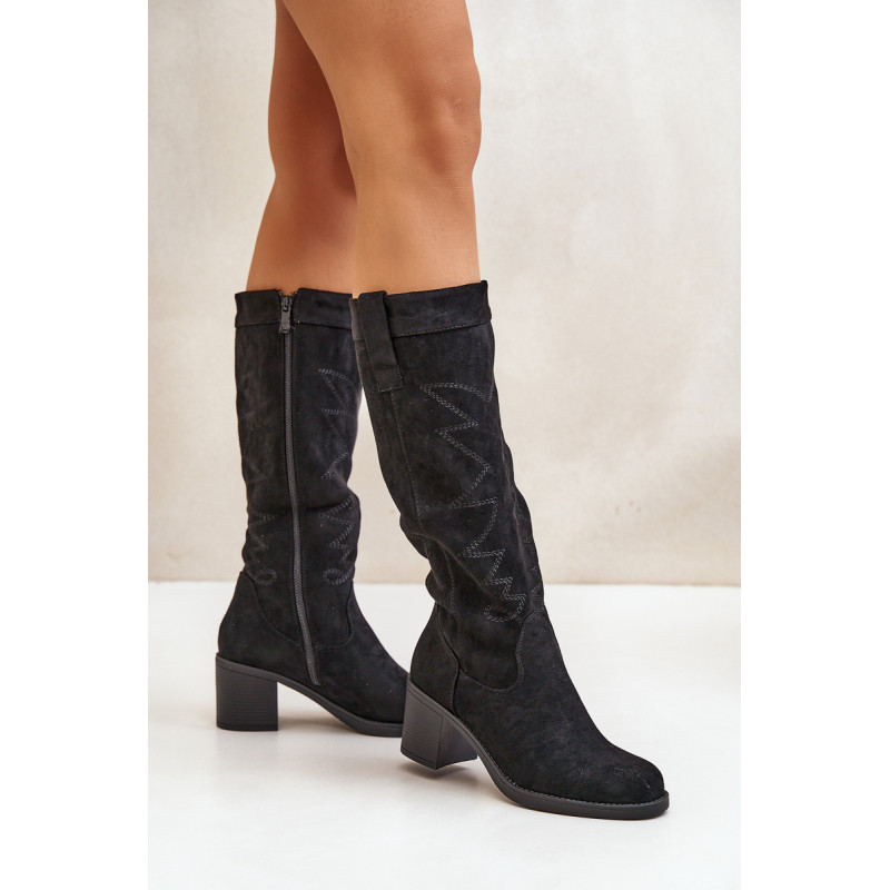 Moteriški batai iki kelių, pagaminti iš ekologiškos zomšos. Pastatykite ant žemo blokinio kulno. Apvaliapirščiai. Kotas dekoruotas siūlėmis. Modelis užsegamas užtrauktuku. Puikiai tinka rudens stiliams! Rinkdamiesi dydį, žiūrėkite dydžių lentelę.