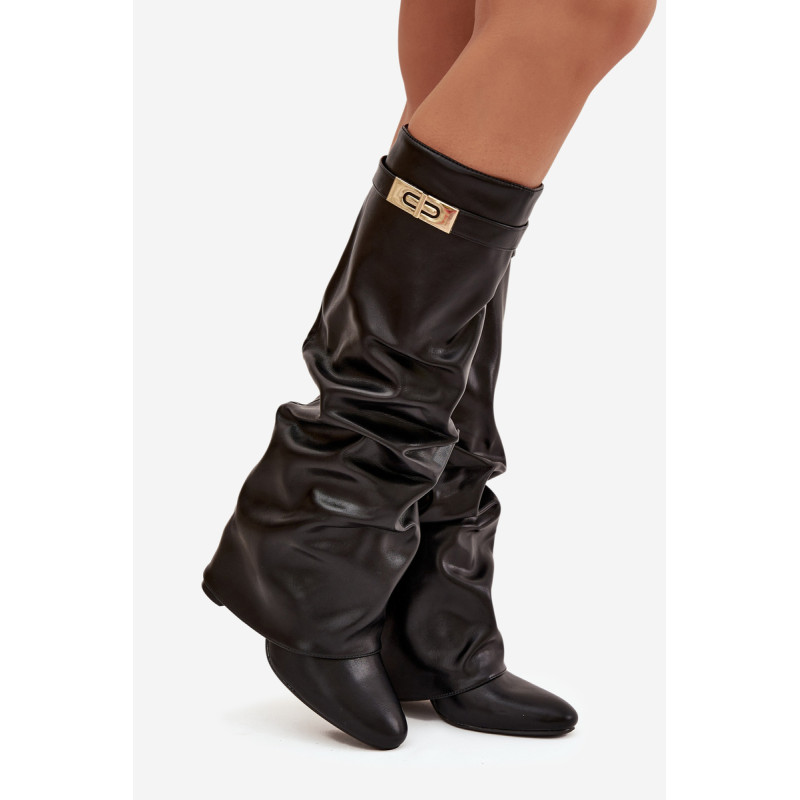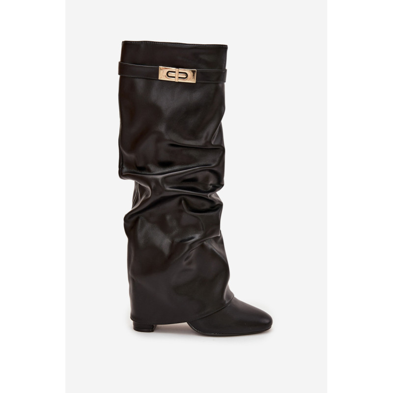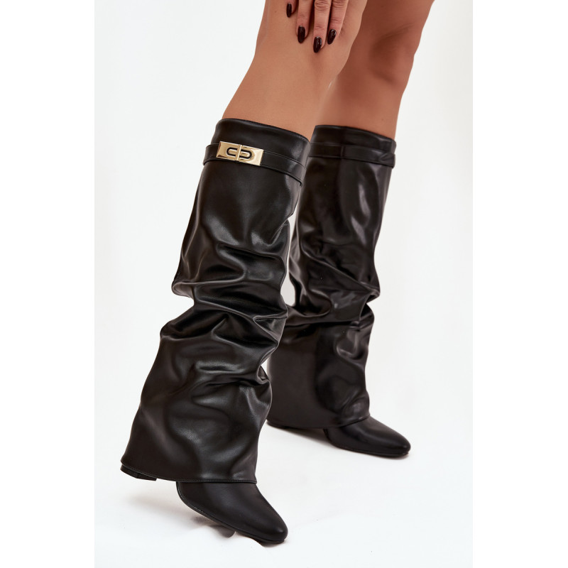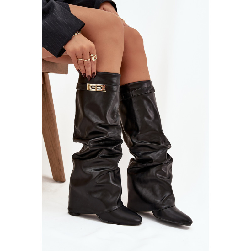 Moteriški ekologiški odiniai auliniai batai, siekiantys virš kelių, yra elegantiška pasirinkimo galimybė vėsesnėms dienoms. Pagrindinis šio modelio privalumas yra apversta šlaunies dalis, papuošta auksiniu detalės dirželiu, kuris suteikia jiems unikalaus charakterio. Smaili nosis optiškai pailgina kojas, o bloko kulnas užtikrina stabilumą ir komfortą. Uždaryti užtrauktuku, šie auliniai batai bus puikus pasirinkimas elegantiškiems pasivaikščiojimams ir kasdieniam stiliui. Renkantis dydį, vadovaukitės dydžių lentele.