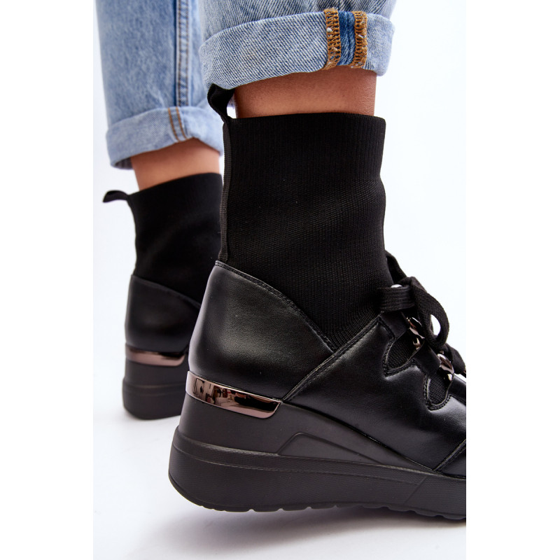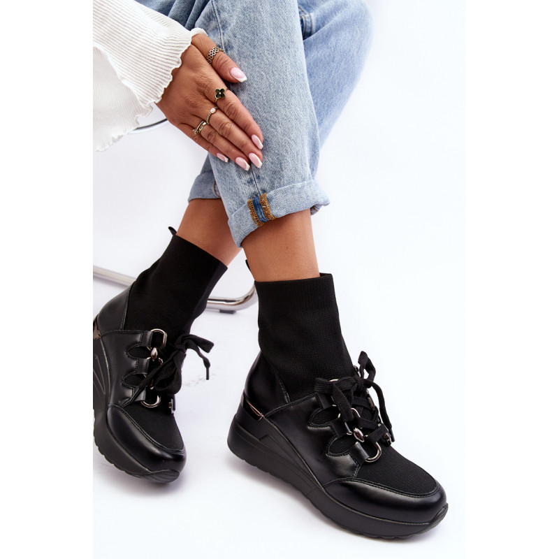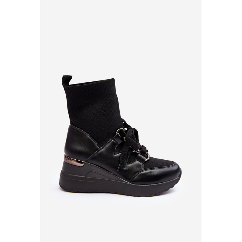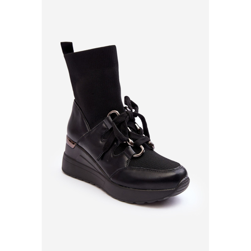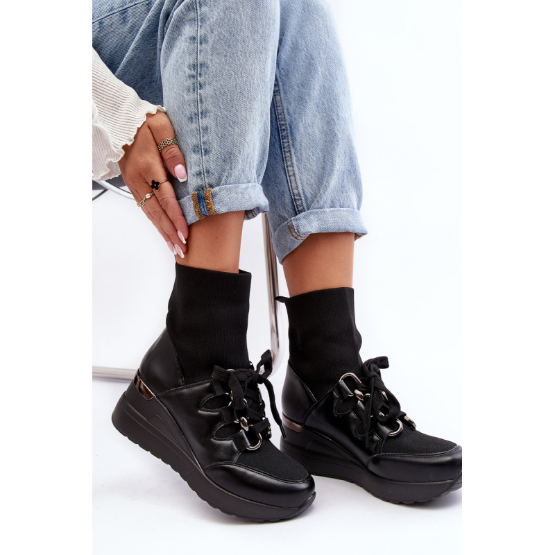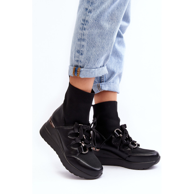 Sportinio stiliaus moteriški batai, pagaminti iš ekologiškos odos ir tekstilės medžiagos derinio. Nustatykite ant pleišto. Viršutinė kojinės formos. Slip-on modelis su papildomais raišteliais. Suapvalinti kojų pirštai. Sustiprintas kulnas. Minkštas, ekologiškos odos vidpadis suteiks patogumo naudojant. Renkantis dydį, vadovaukitės dydžių lentele.