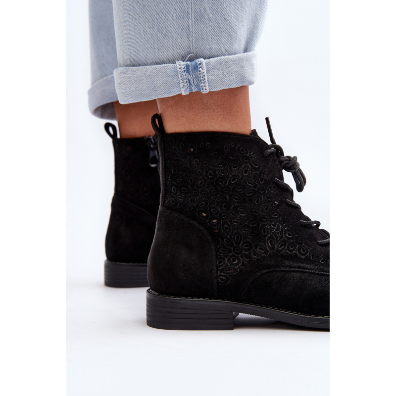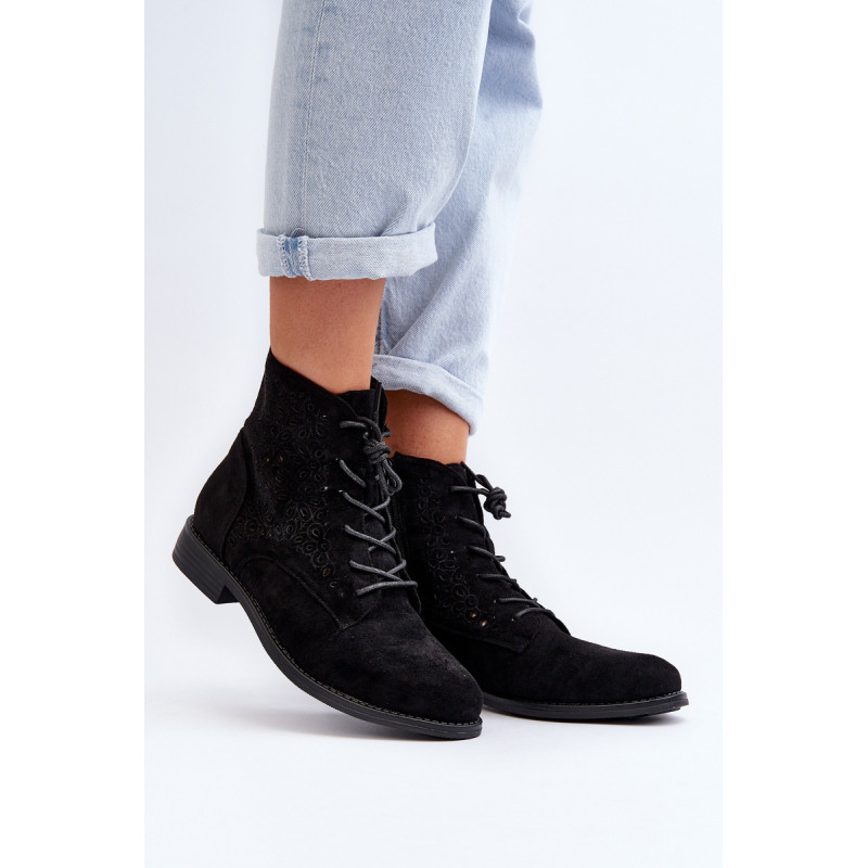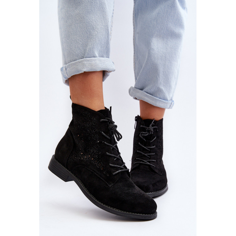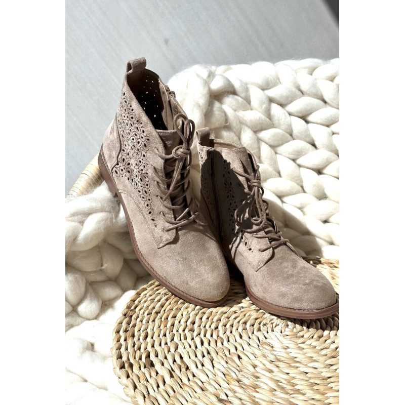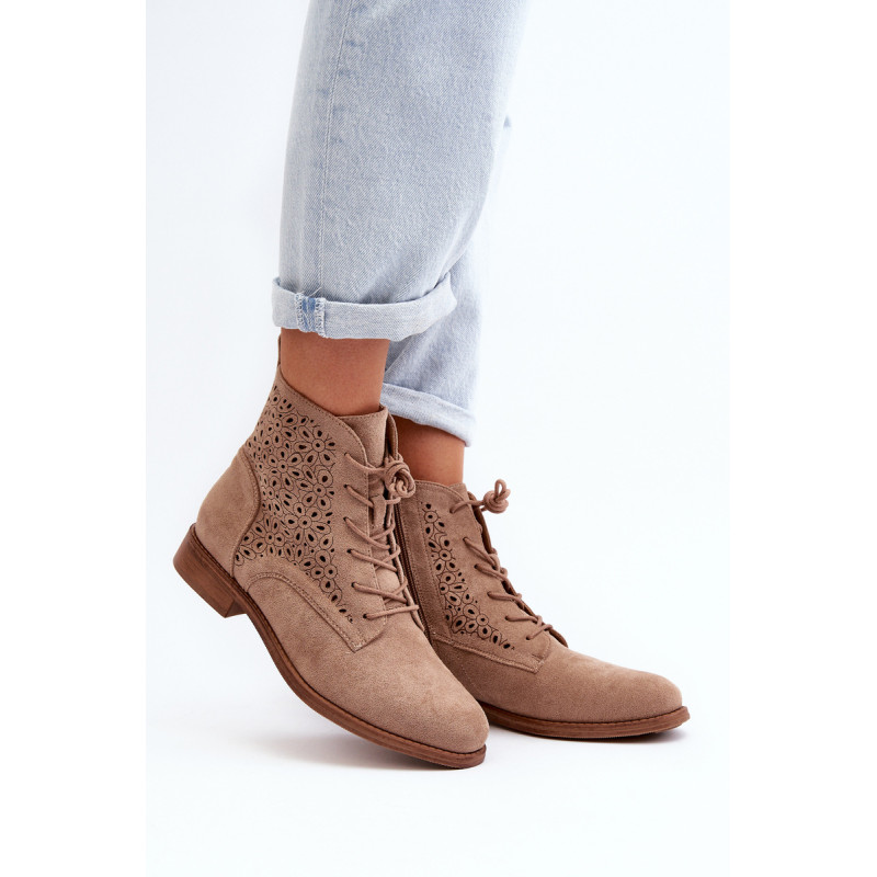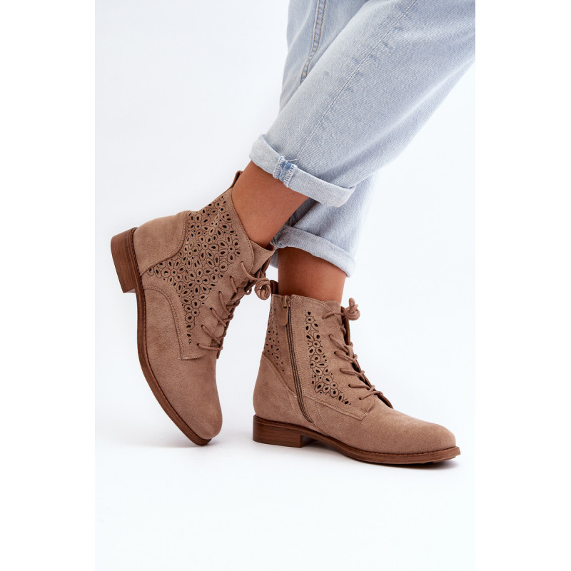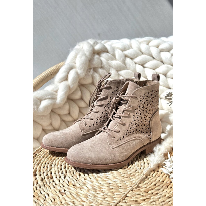 Moteriški batai iš ekologiškos zomšos. Viršus perforuotas, papuoštas gėlėmis. Nustatykite ant plokščio kulno. Užsegamas užtrauktuku šone ir papildomai su raišteliu, kas leis geriau priglusti. Suapvalinti kojų pirštai. Be to, šis modelis turi sustiprintą kulno skaitiklį. Būtinai peržiūrėkite kitus mūsų pasiūlyme esančius batų modelius! Rinkdamiesi dydį, žiūrėkite dydžių lentelę.