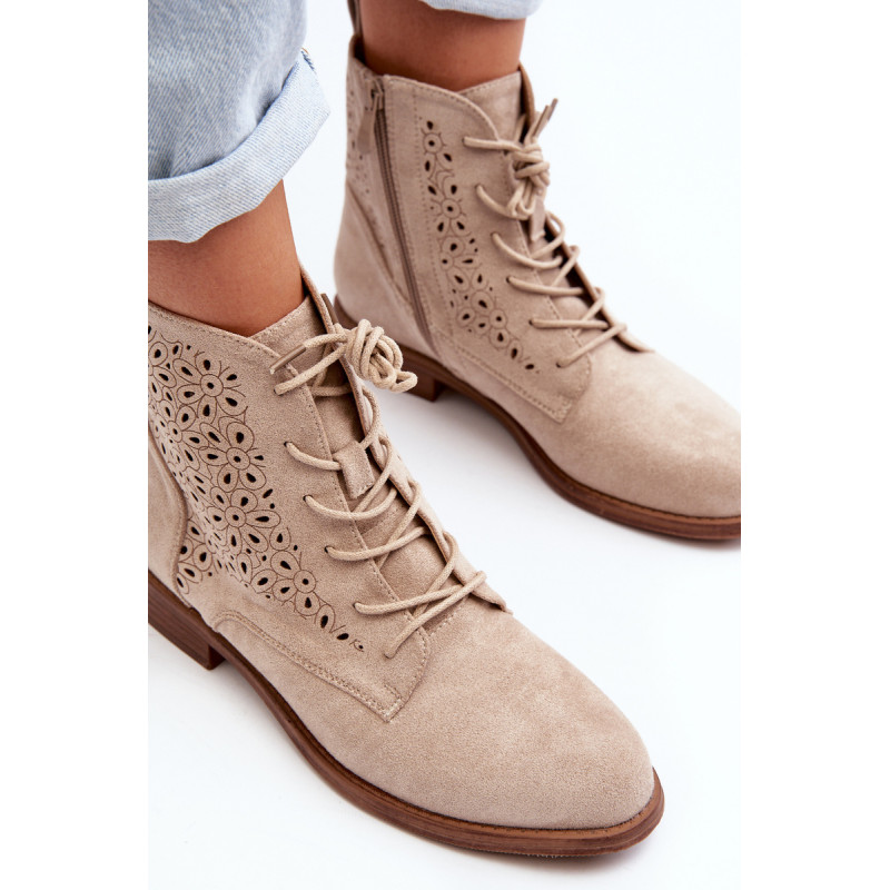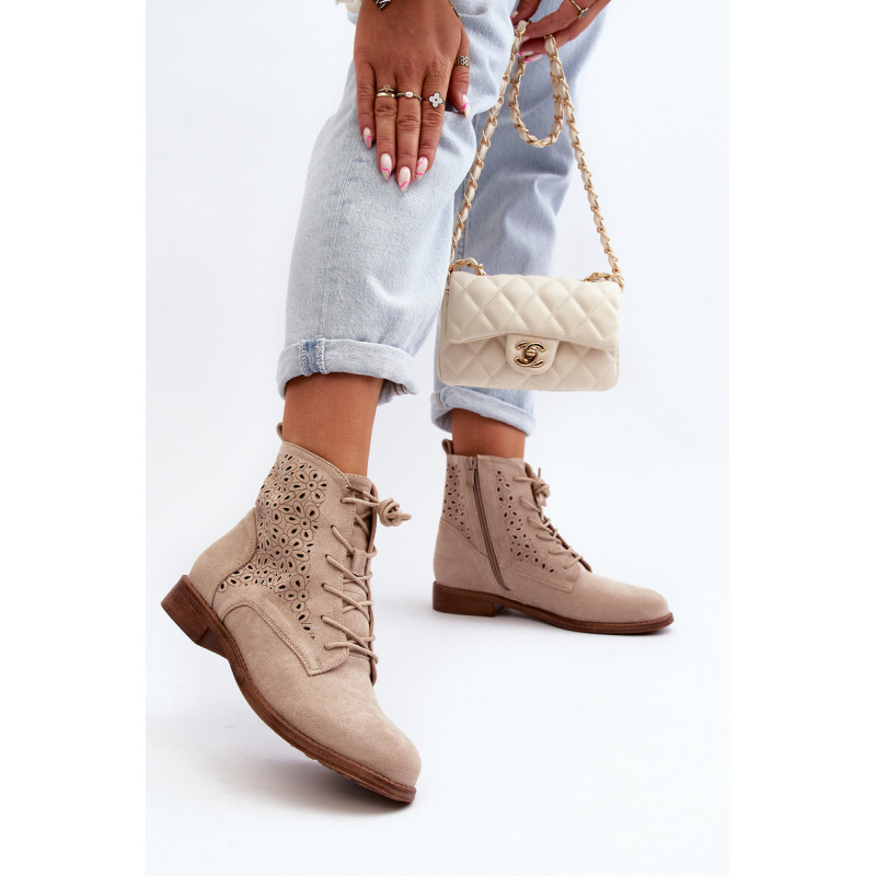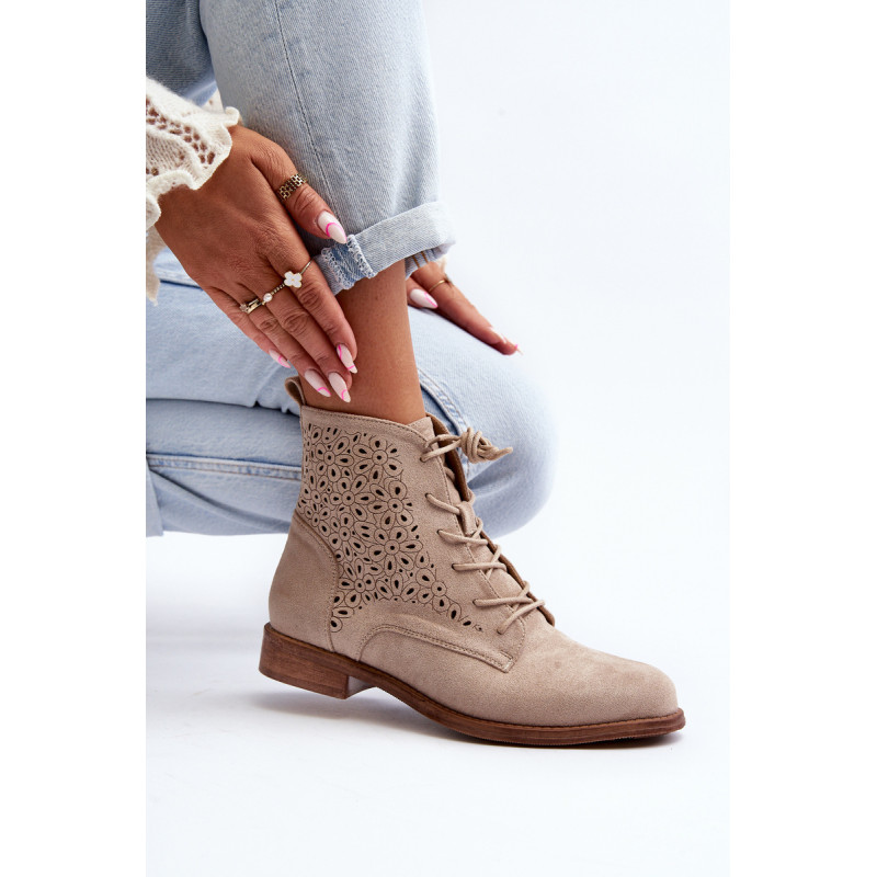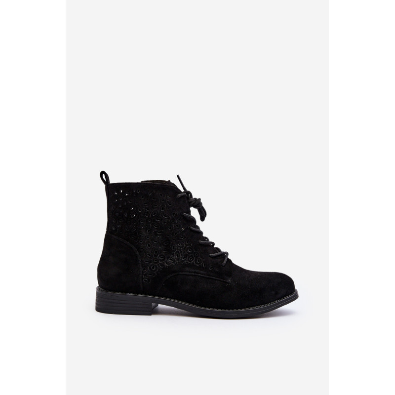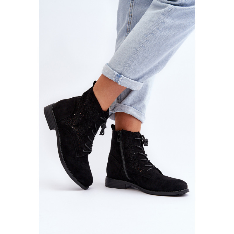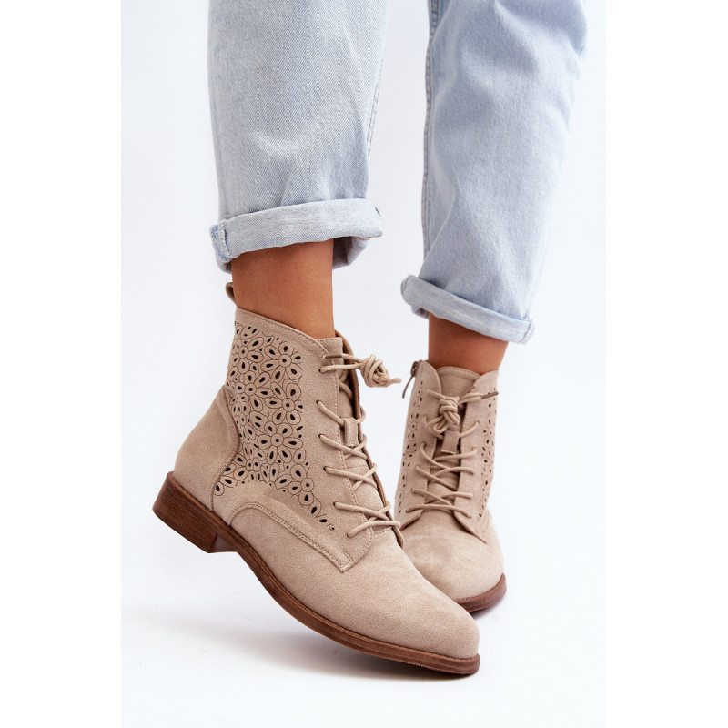 Moteriški batai iš ekologiškos zomšos. Viršus perforuotas, papuoštas gėlėmis. Nustatykite ant plokščio kulno. Užsegamas užtrauktuku šone ir papildomai su raišteliu, kas leis geriau priglusti. Suapvalinti kojų pirštai. Be to, šis modelis turi sustiprintą kulno skaitiklį. Būtinai peržiūrėkite kitus mūsų pasiūlyme esančius batų modelius! Rinkdamiesi dydį, žiūrėkite dydžių lentelę.