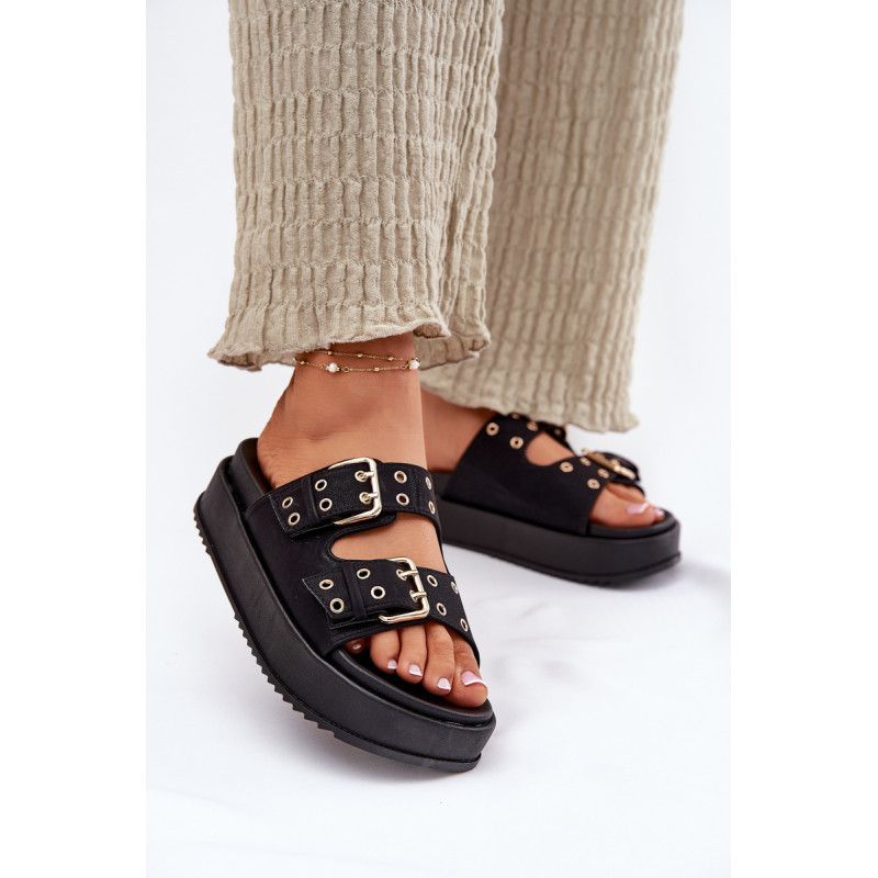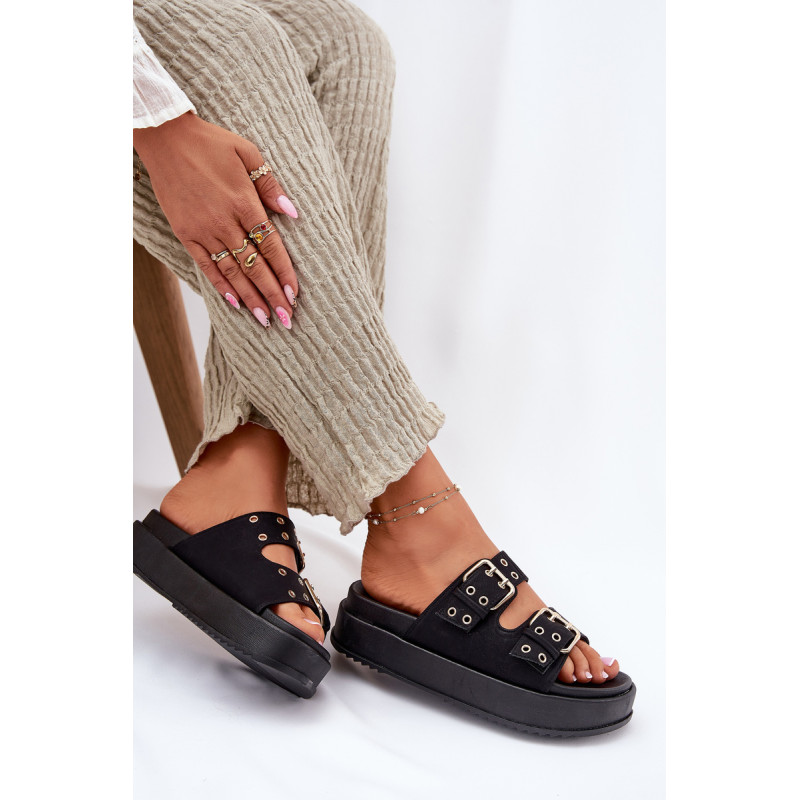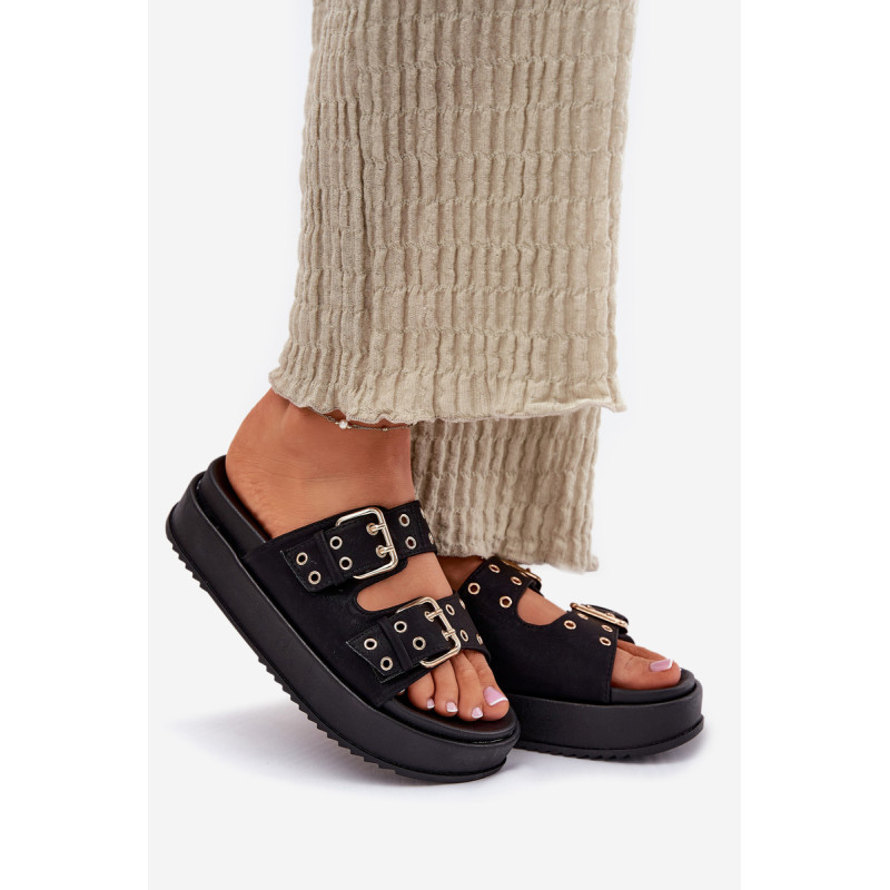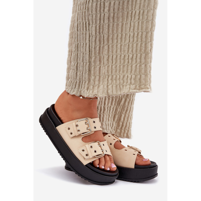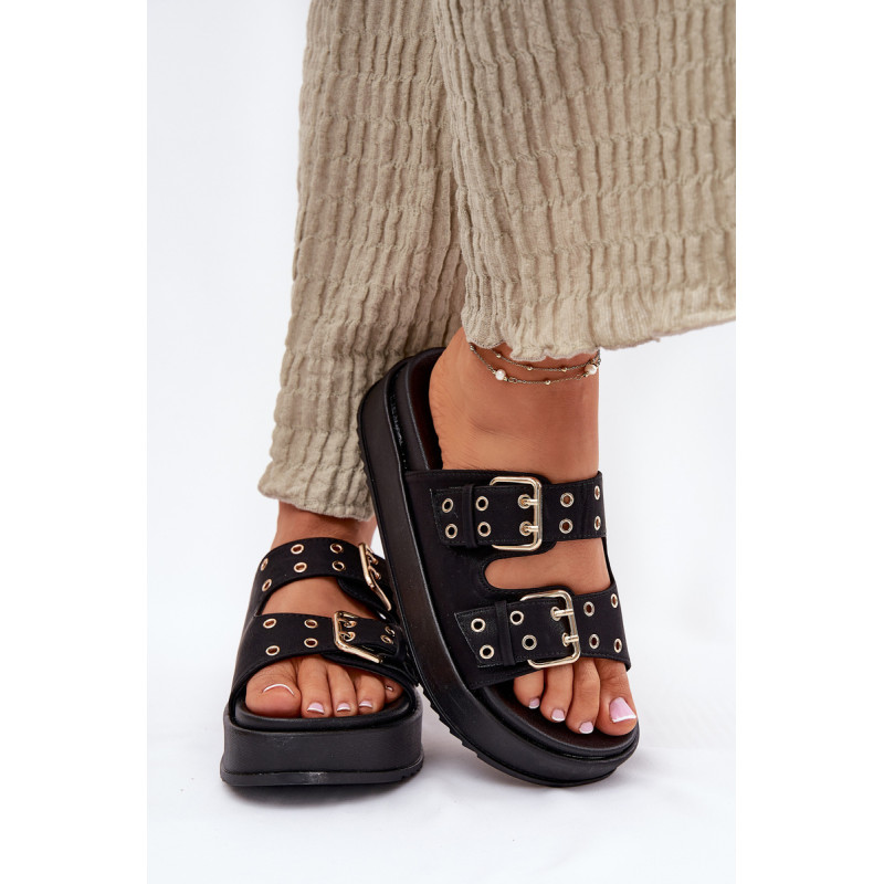 Moteriški šlepetės iš eko odos, įrengtos masyvi platforma, yra puikus pasirinkimas vasarai moterims, vertinančioms madingą išvaizdą ir komfortą. Priekyje yra reguliuojami dirželiai su sagtimis, kurie leidžia idealiai pritaikyti prie pėdos ir suteikia visumai modernų charakterį. Puikiai tinka tiek kasdienėms stiliaus, tiek atostogoms. Renkantis dydį, vadovaukitės dydžių lentele.