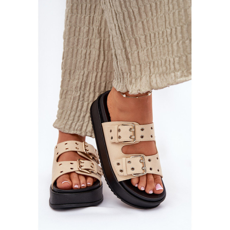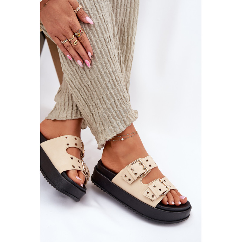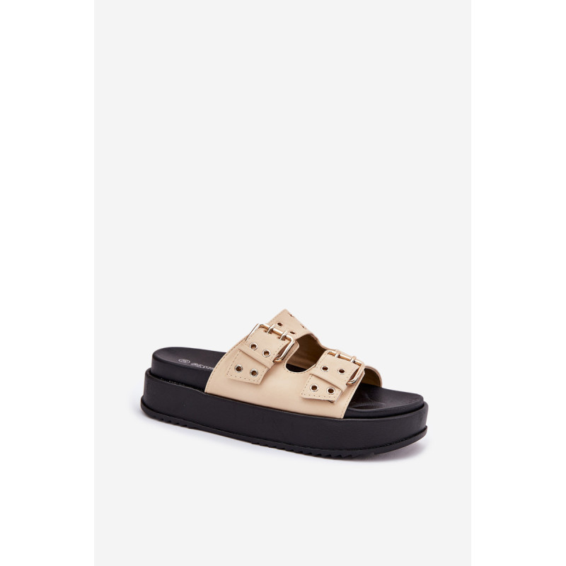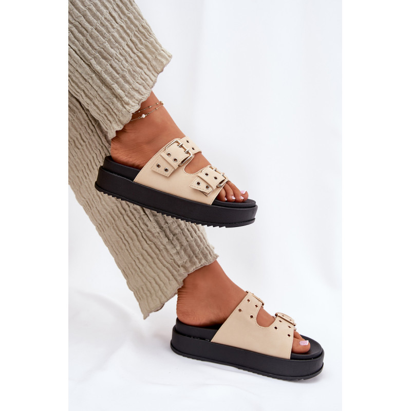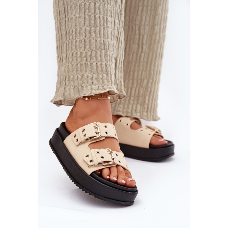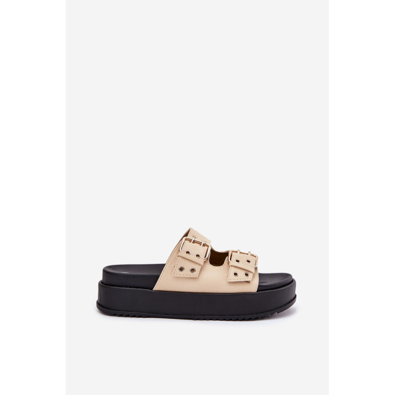 Moteriški šlepetės iš eko odos, įrengtos masyvi platforma, yra puikus pasirinkimas vasarai moterims, vertinančioms madingą išvaizdą ir komfortą. Priekyje yra reguliuojami dirželiai su sagtimis, kurie leidžia idealiai pritaikyti prie pėdos ir suteikia visumai modernų charakterį. Puikiai tinka tiek kasdienėms stiliaus, tiek atostogoms. Renkantis dydį, vadovaukitės dydžių lentele.