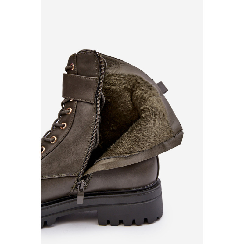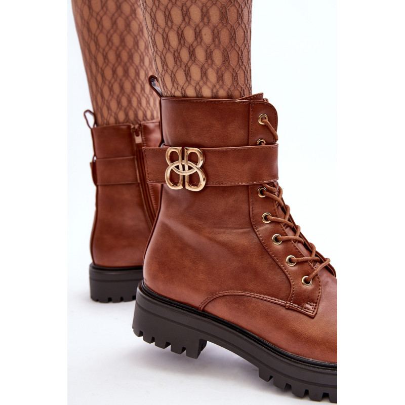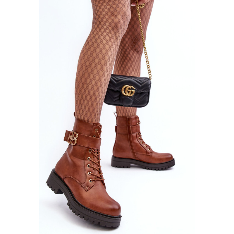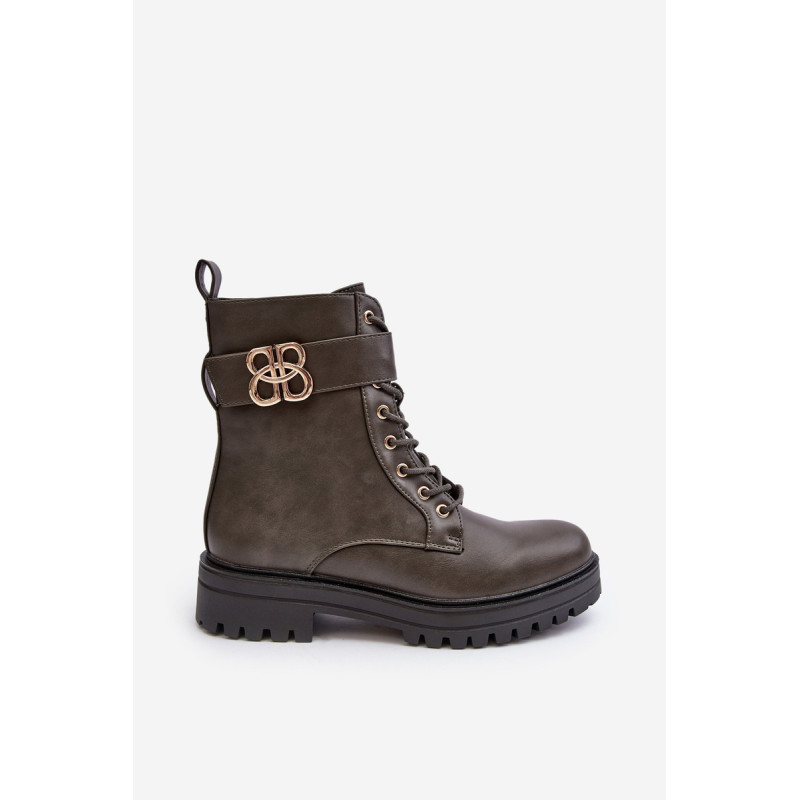 Moteriški batai ant plokščio, stabilaus kulno. Suvarstomas priekyje ir papildomai užsegamas užtrauktuku. Pirštai suapvalinti. Vidus išklotas batų pamušalu. Viršuje diržas su auksine puošyba. Be to, kulnas yra standus. Renkantis dydį, vadovaukitės dydžių lentele.