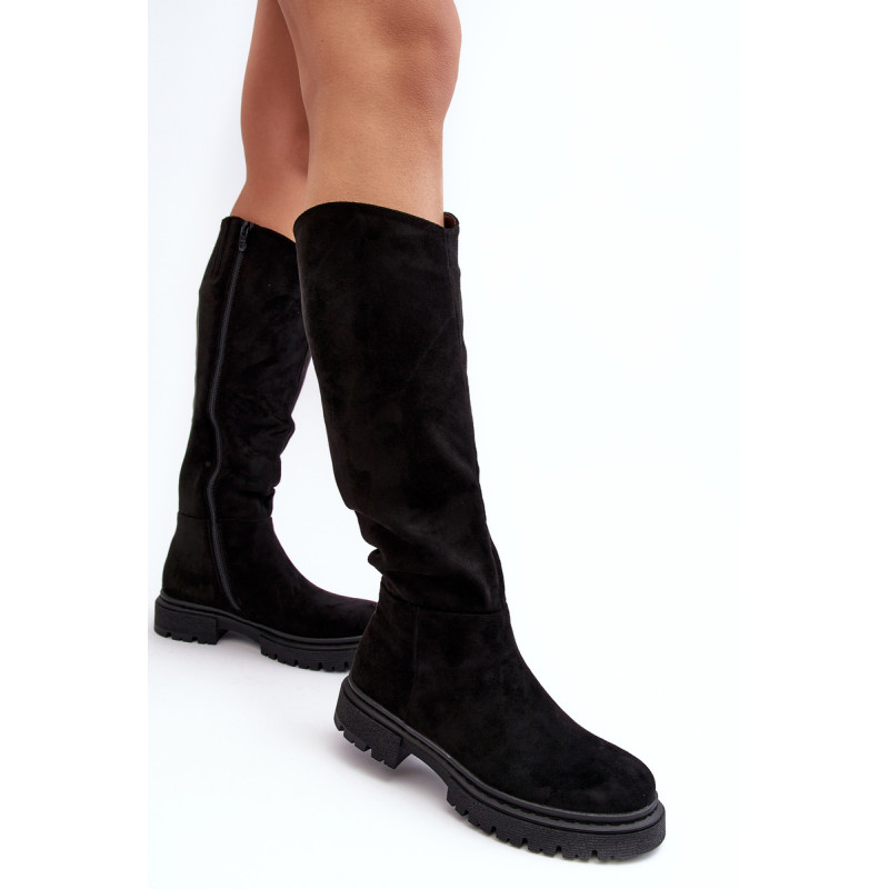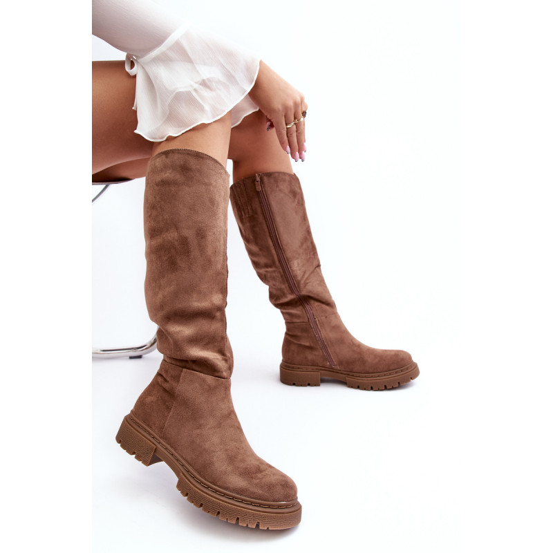 Moteriški batai yra pagaminti iš ekologiškos zomšos. Nustatykite ant plokščio kulno. Velenas virš kelių. Suapvalinti kojų pirštai. Viduje išklotas kailiuku. Klasikinis stilius tiks prie daugelio rudens-žiemos stilizacijų! Rinkdamiesi dydį, žiūrėkite dydžių lentelę.