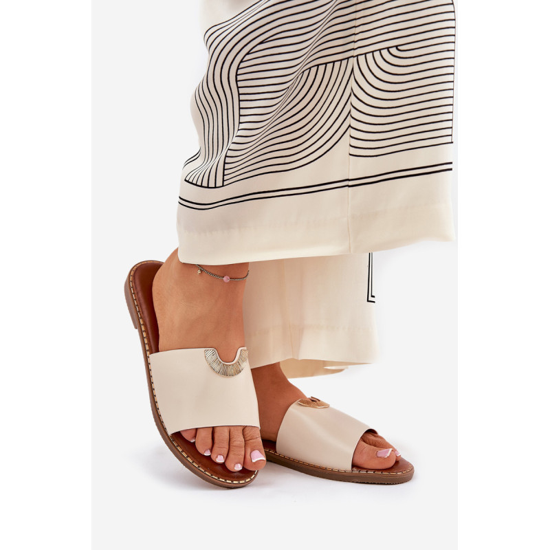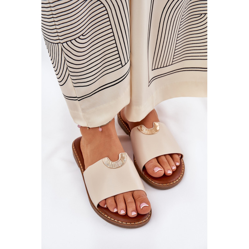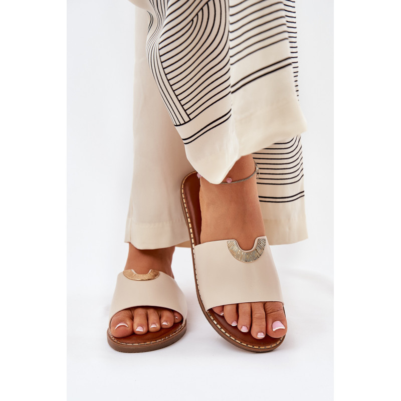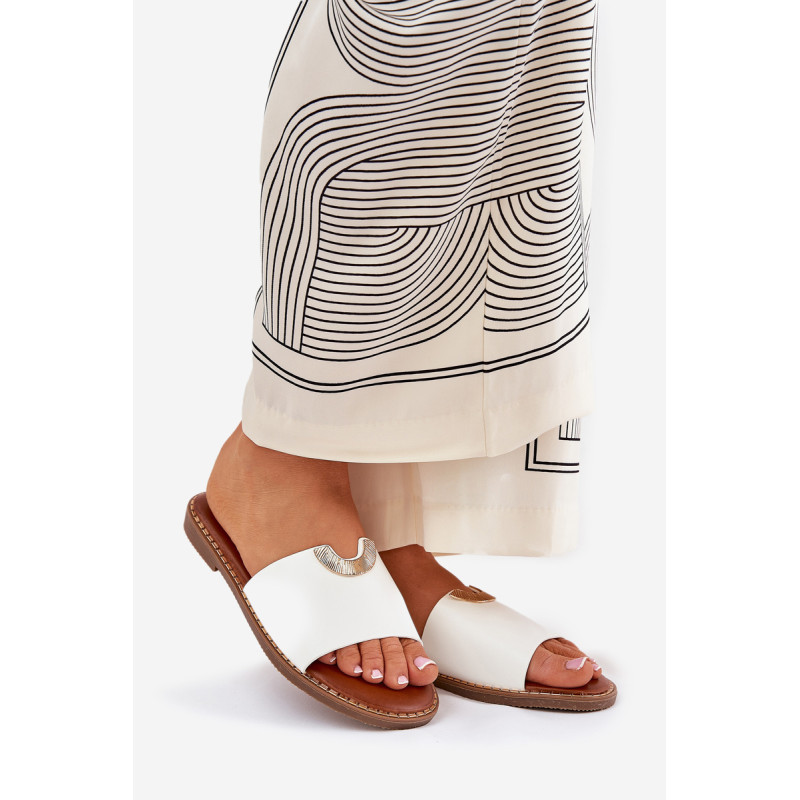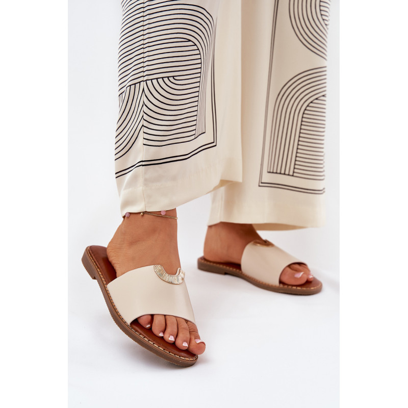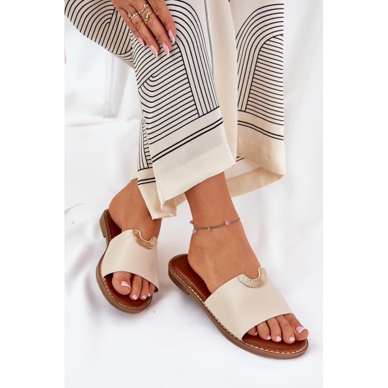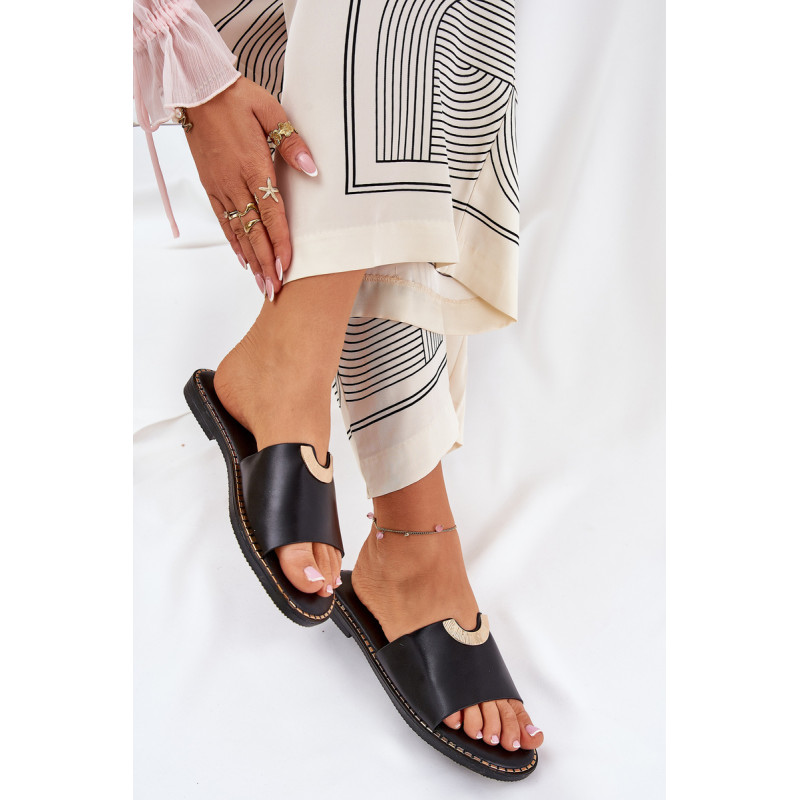 Moteriški šlepetės su plokščiu kulnu yra puikus pasirinkimas vasaros dienoms. Pagaminta iš ekologiškos odos. Klasikinis modelis papildytas dekoratyviniais elementais, kurie suteikia elegantišką charakterį. Puikiai tinka kasdieniam dėvėjimui ir vasaros pasivaikščiojimams. Puikiai dera su suknelėmis, sijonais ir kelnių, pridėdamos stilingą akcentą kiekvienam įvaizdžiui. Renkantis dydį, vadovaukitės dydžių lentele.