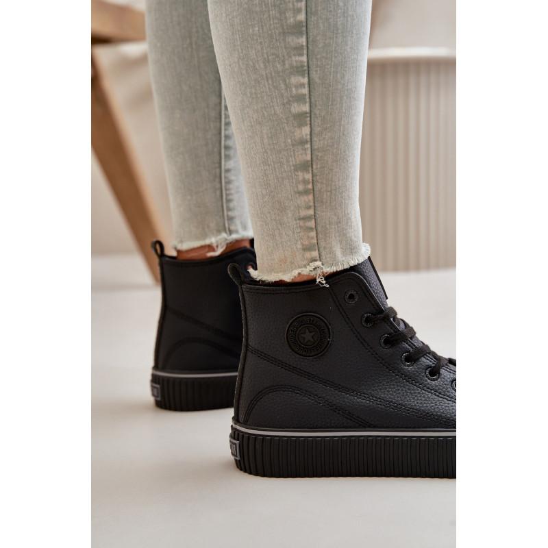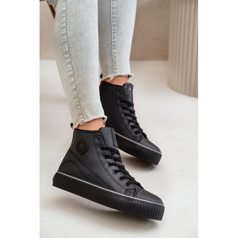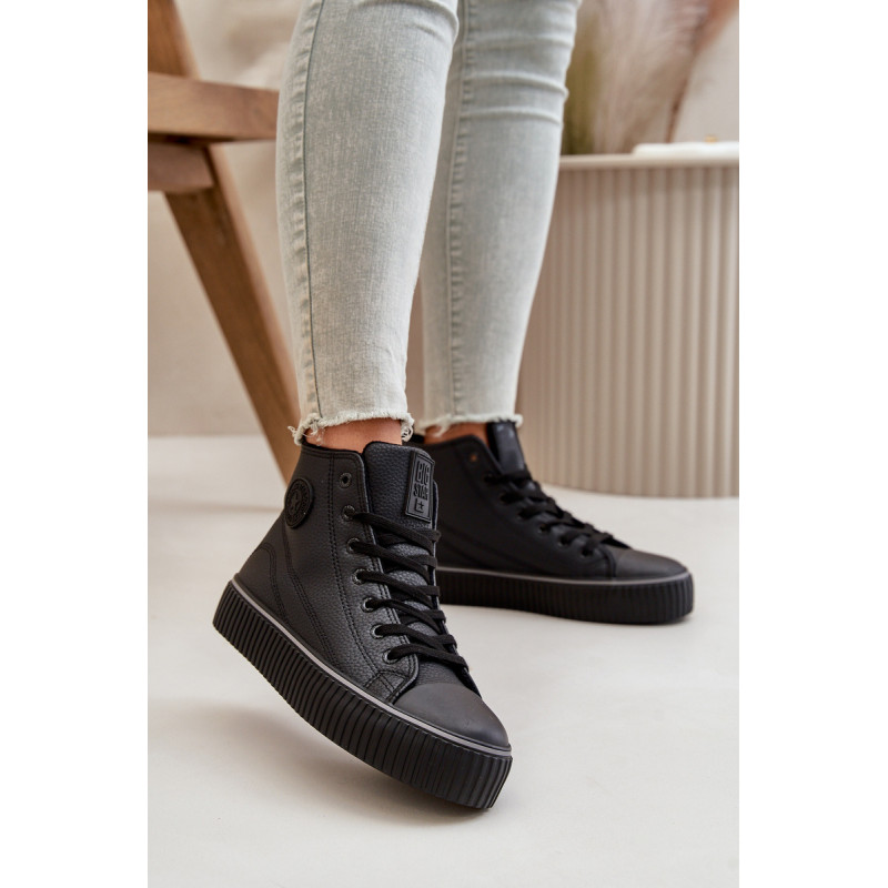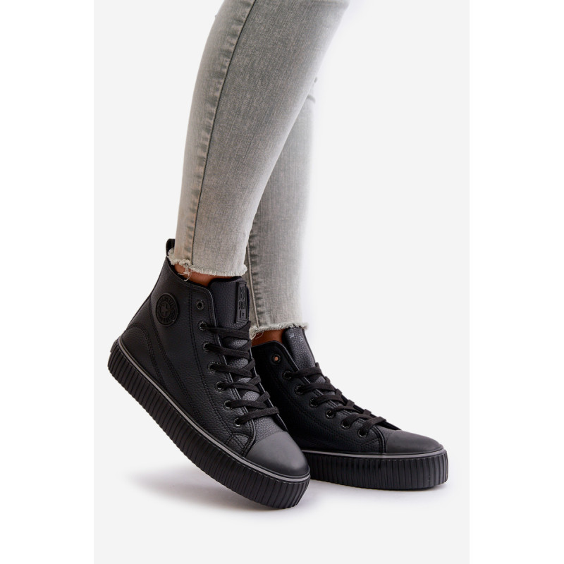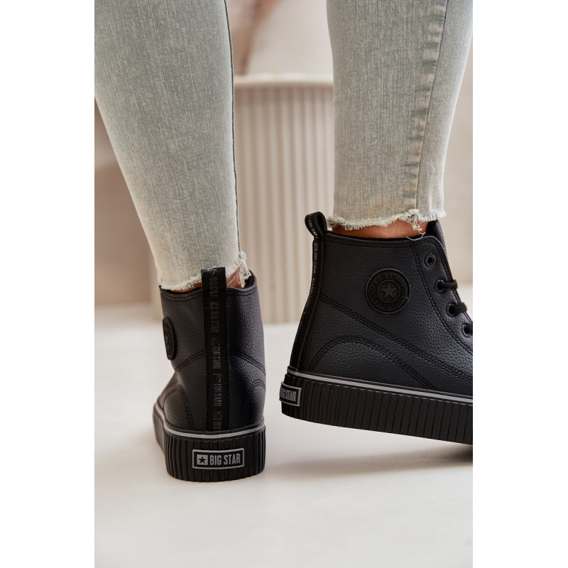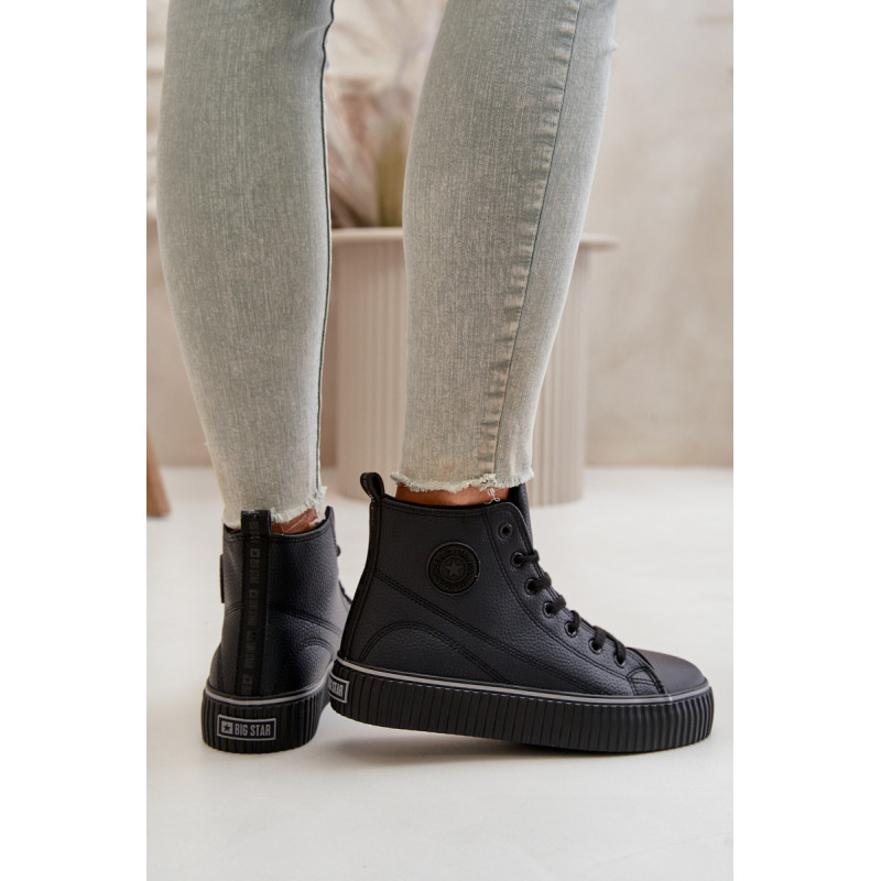 BIG STAR prekės ženklo moteriški sportbačiai, pastatyti ant platformos, pagamintos iš guminės medžiagos. Pagaminta iš eko odos. Užsegamas užtrauktuku ir papildomai turi raištelius. Vidus apšiltintas kailiu. Kojos pirštas sustingęs. Viršutinė dalis siekia kulkšnį. Būtinai peržiūrėkite visą mūsų BIG STAR batų kolekciją. Rinkdamiesi dydį, žr. dydžių lentelę.