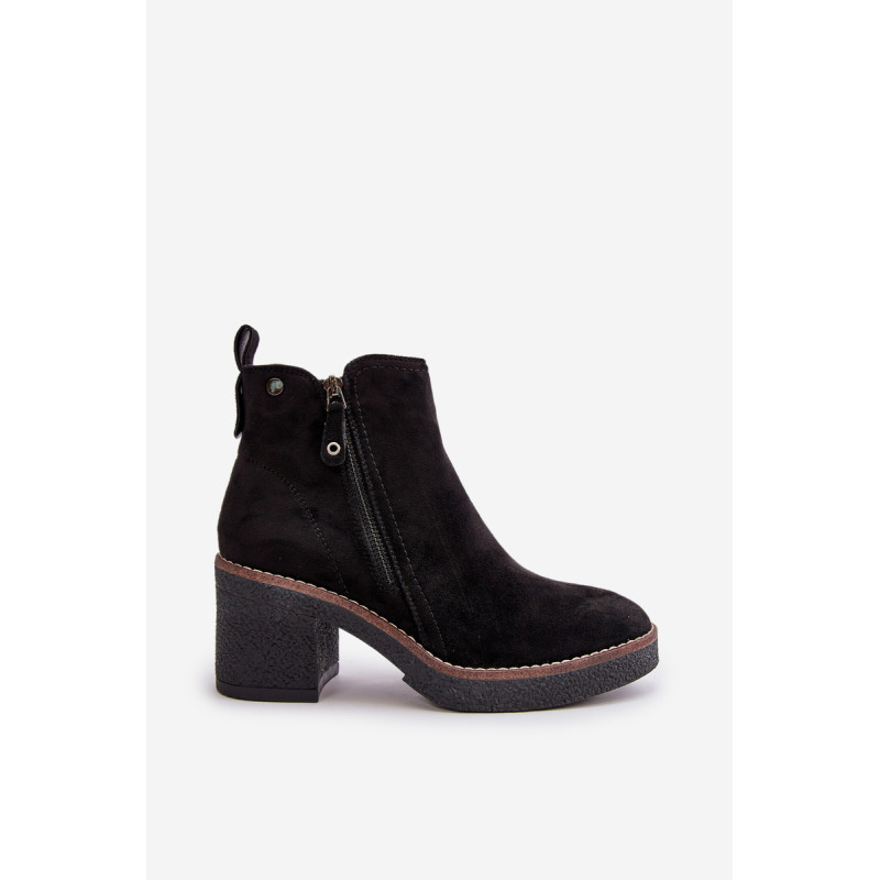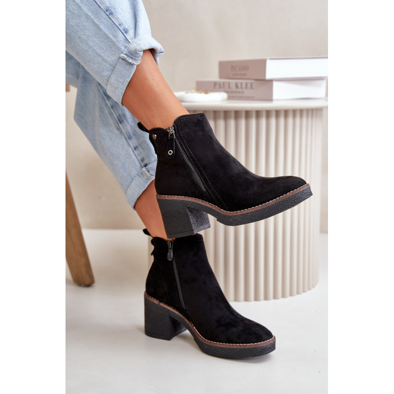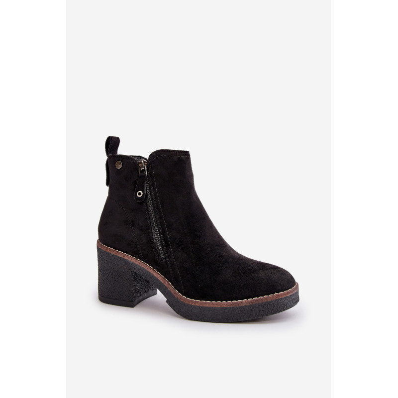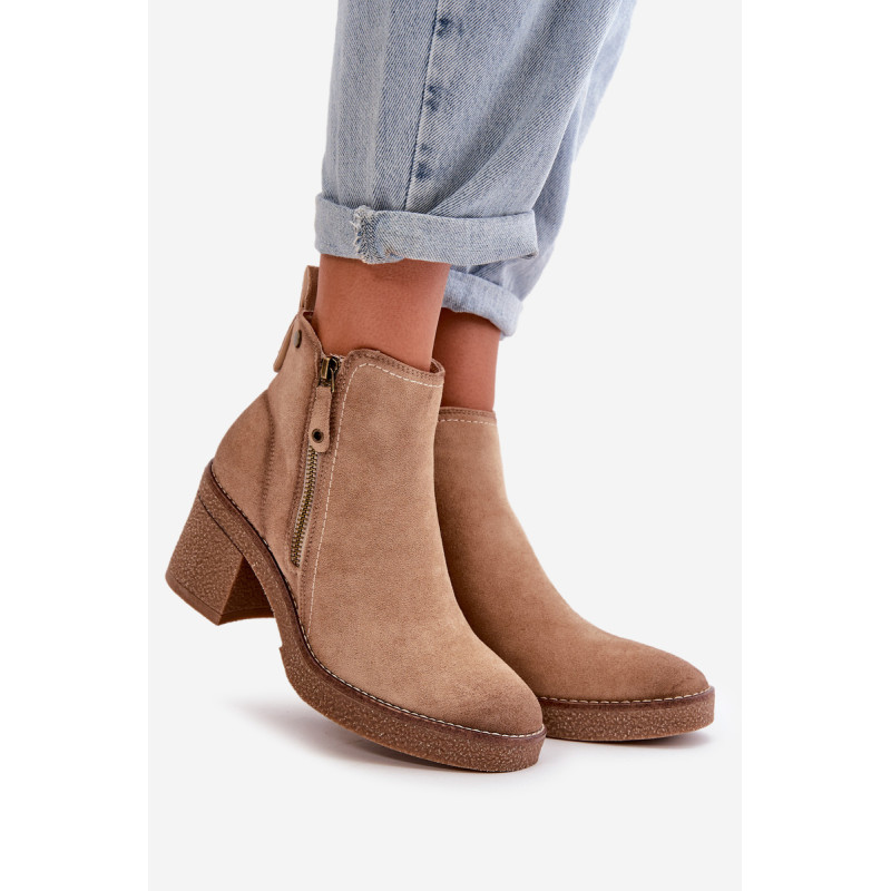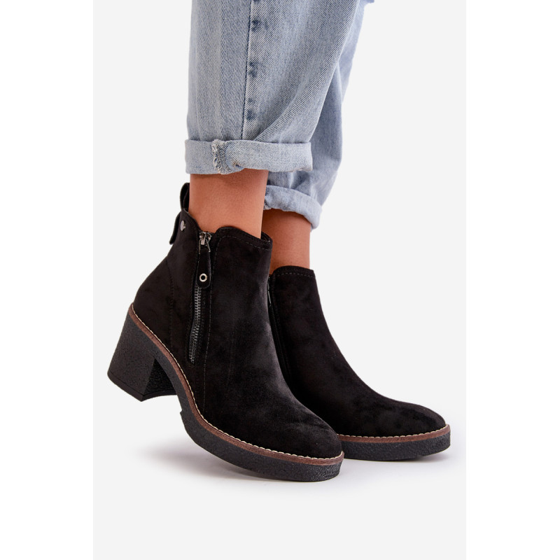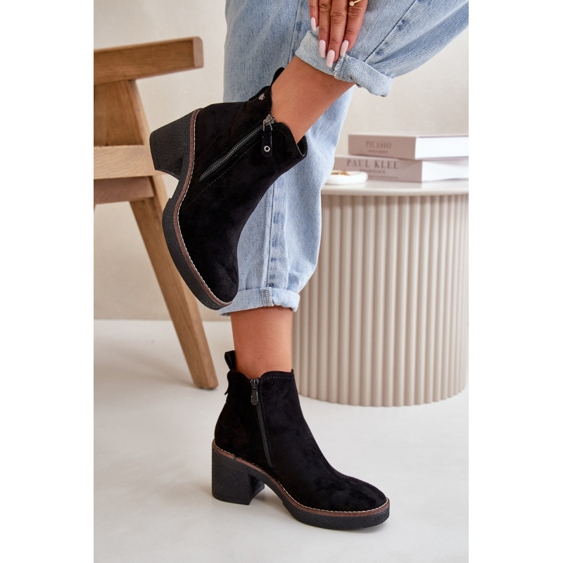 Moteriški batai iš minkštos veganiškos zomšos. Pastatyti ant stabilaus blokinio kulno. Vidus išklotas batų vilna, kuri dėvint suteikia šilumos ir komforto. Šis modelis turi apvalius pirštus ir užsegamas užtrauktuku, todėl jį lengva užsidėti ir nusiimti. Idealiai tinka rudens ir žiemos stiliui. Rinkdamiesi dydį žiūrėkite dydžių lentelę.