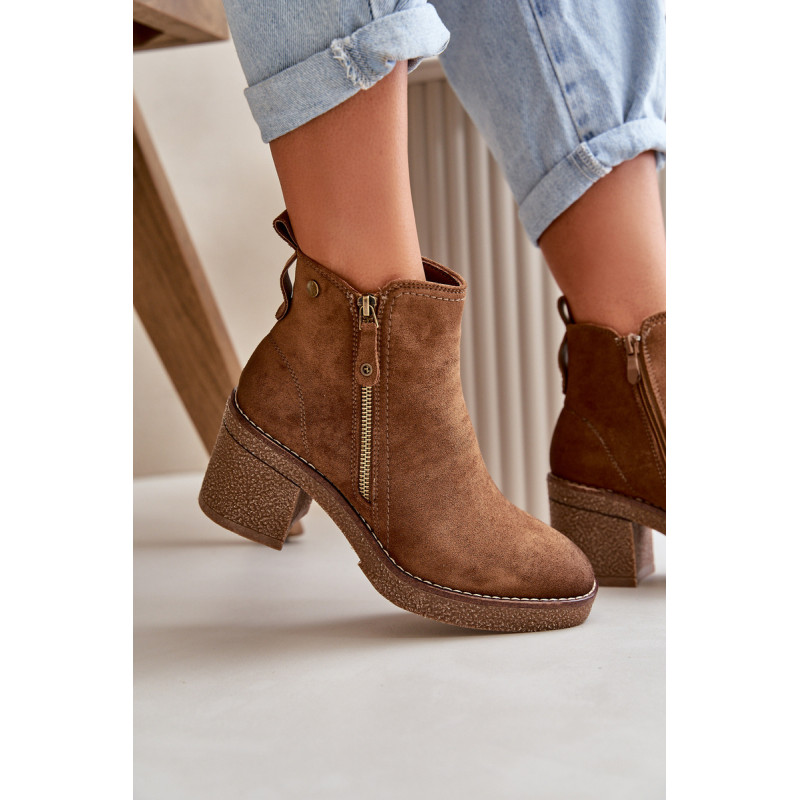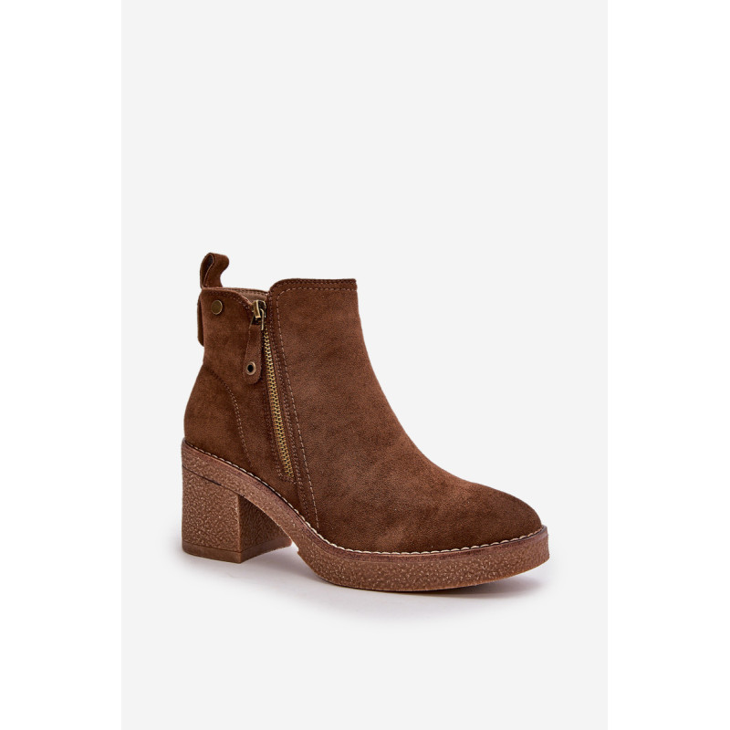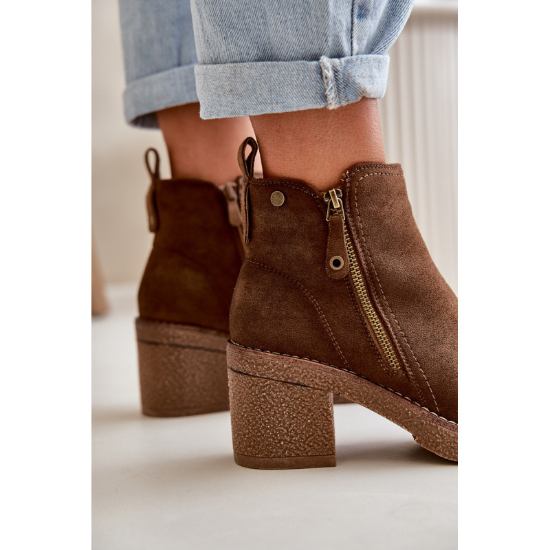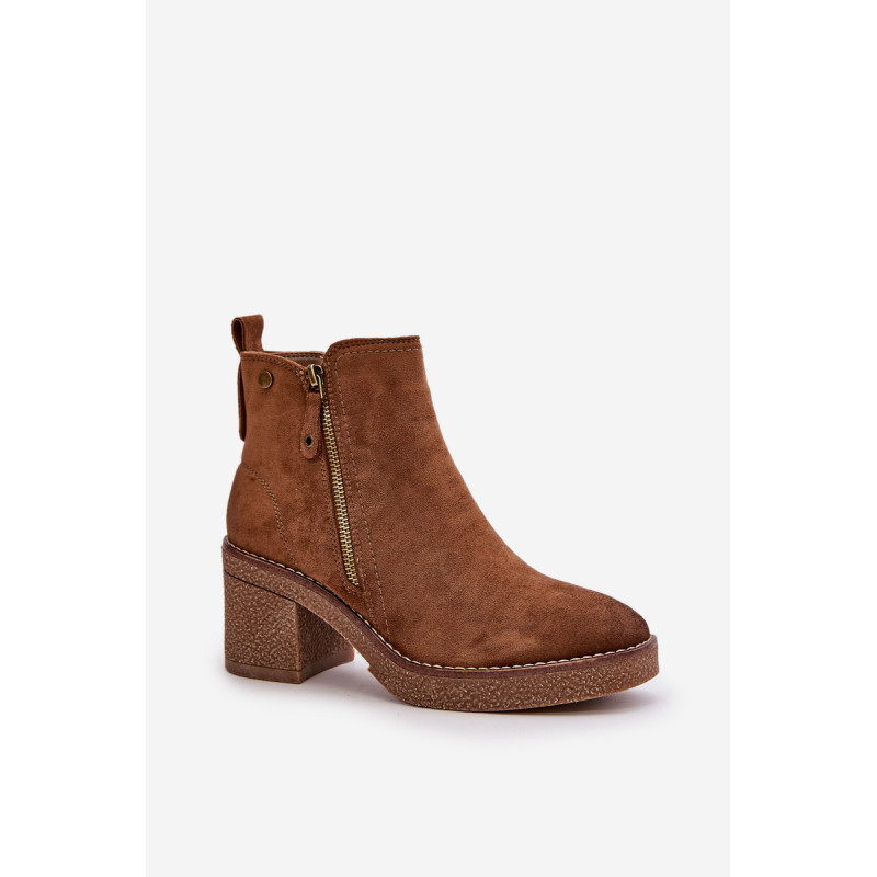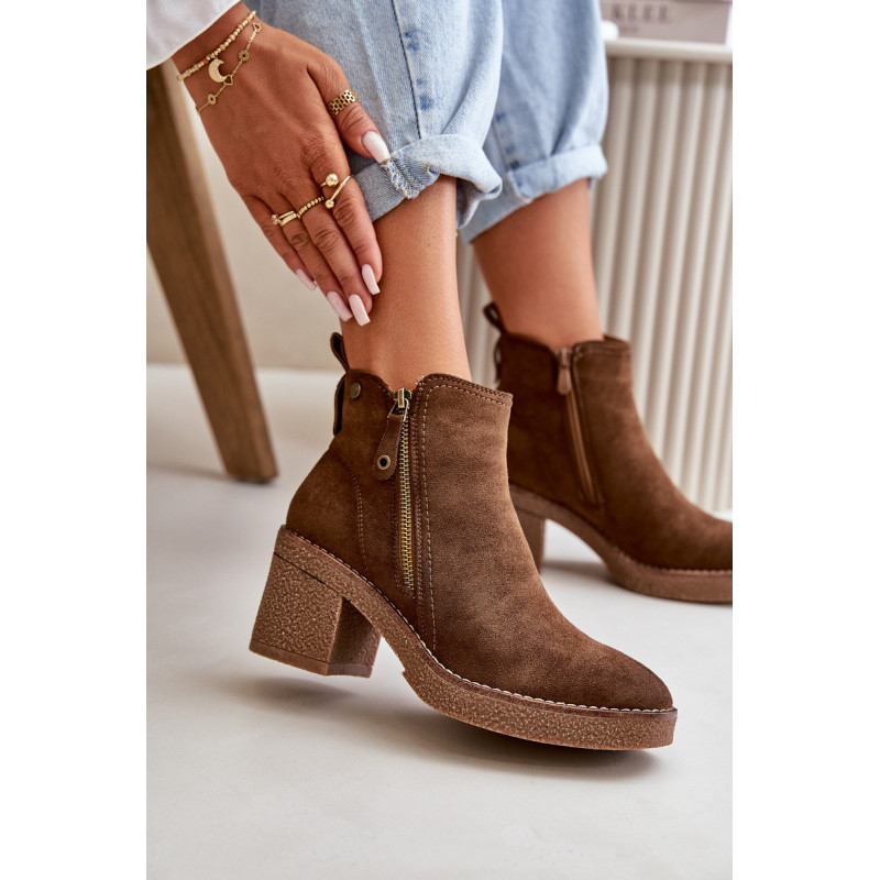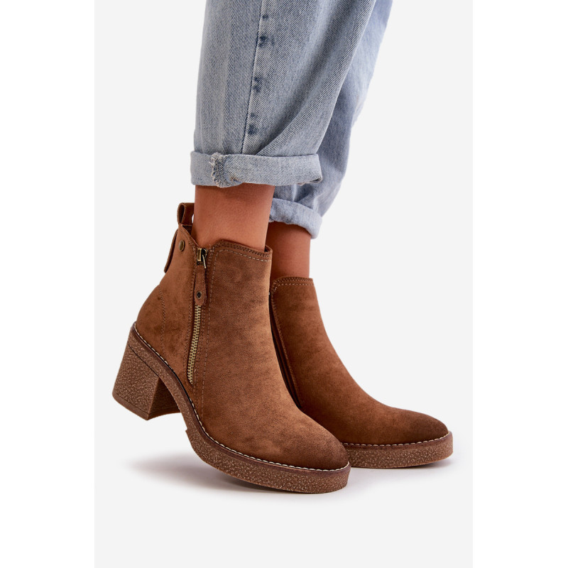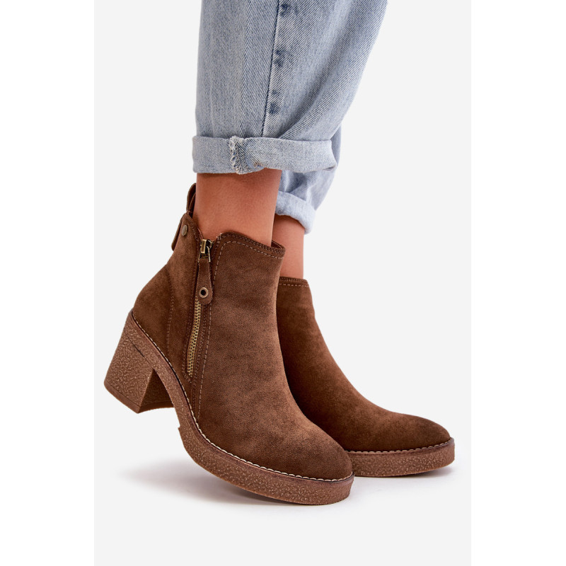 Moteriški batai iš minkštos veganiškos zomšos. Pastatyti ant stabilaus blokinio kulno. Vidus išklotas batų vilna, kuri dėvint suteikia šilumos ir komforto. Šis modelis turi apvalius pirštus ir užsegamas užtrauktuku, todėl jį lengva užsidėti ir nusiimti. Idealiai tinka rudens ir žiemos stiliui. Rinkdamiesi dydį žiūrėkite dydžių lentelę.