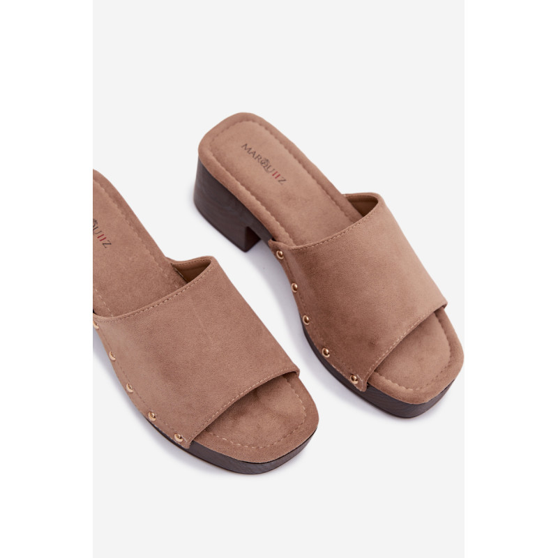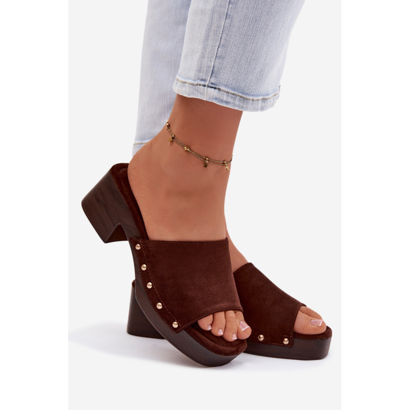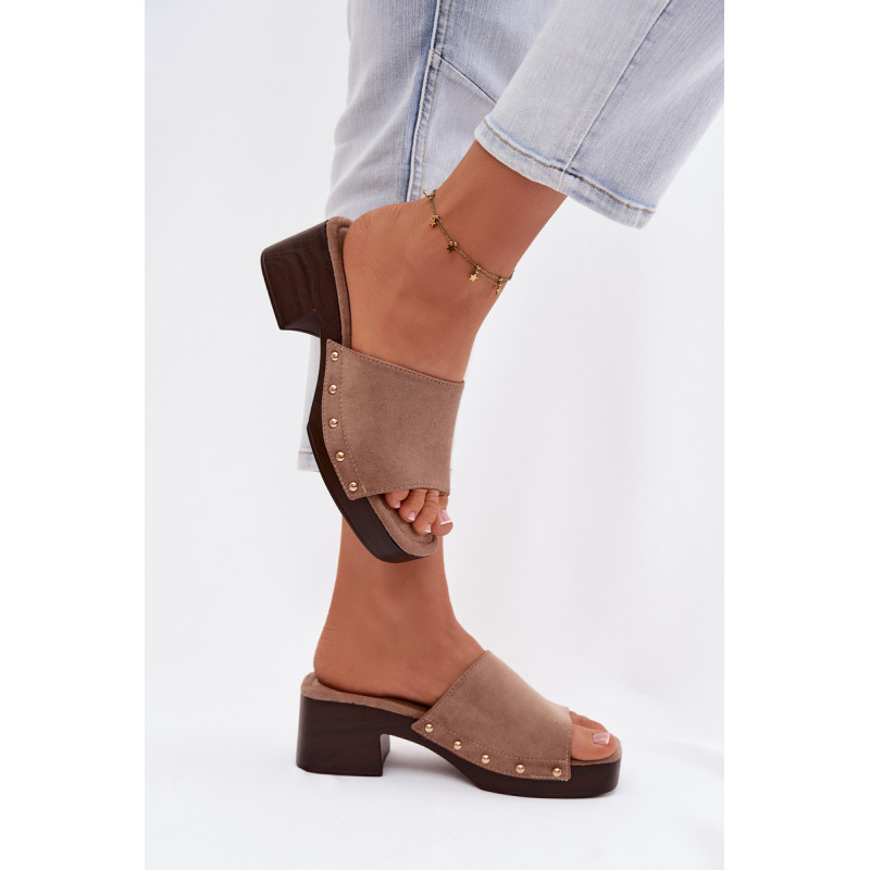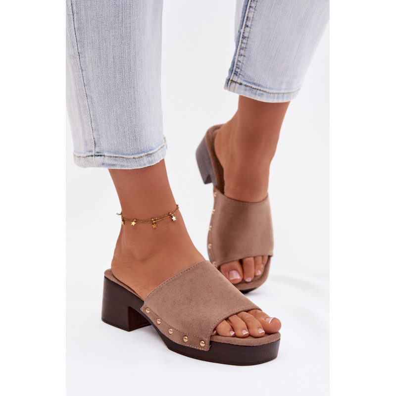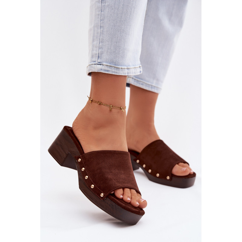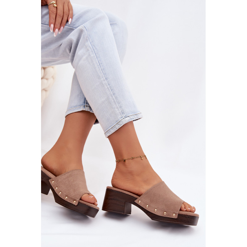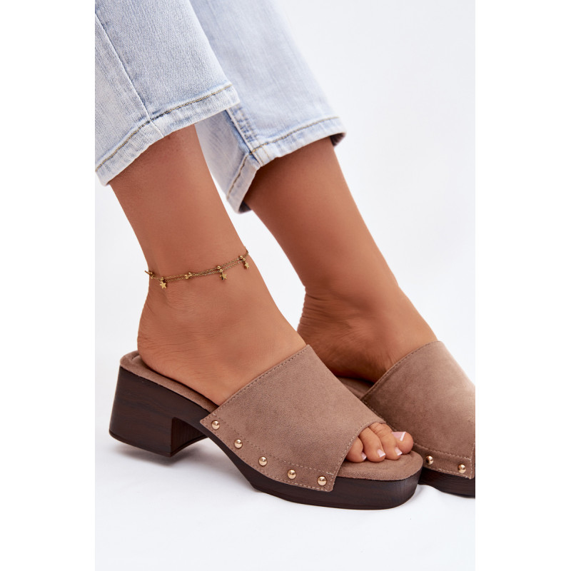 Moteriškos šlepetės, pagamintos iš ekologiško zomšos, yra stilingas pasiūlymas moterims, kurios mėgsta mados akcentus. Modelis su stabilia kubo formos kulnu ir platforma užtikrina patogumą ir pasitikėjimą žingsniu. Minkšta įdėklas rūpinasi komfortu, o auksiniai kniedės šonuose suteikia visumai išraiškingo charakterio. Šios šlepetės puikiai tinka tiek kasdieniam dėvėjimui, tiek labiau stilingiems vasaros deriniams. Renkantis dydį, vadovaukitės dydžių lentele.