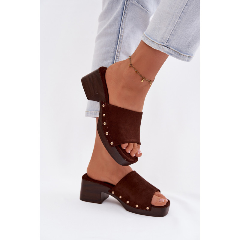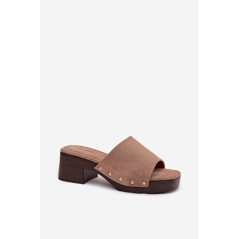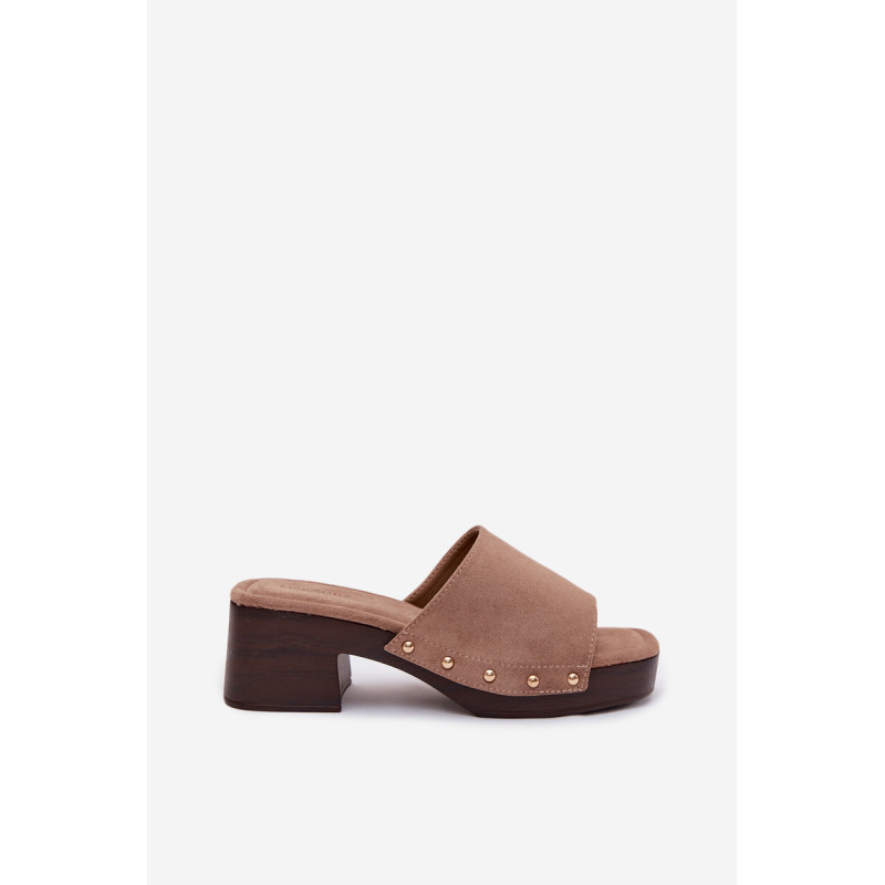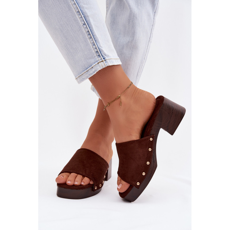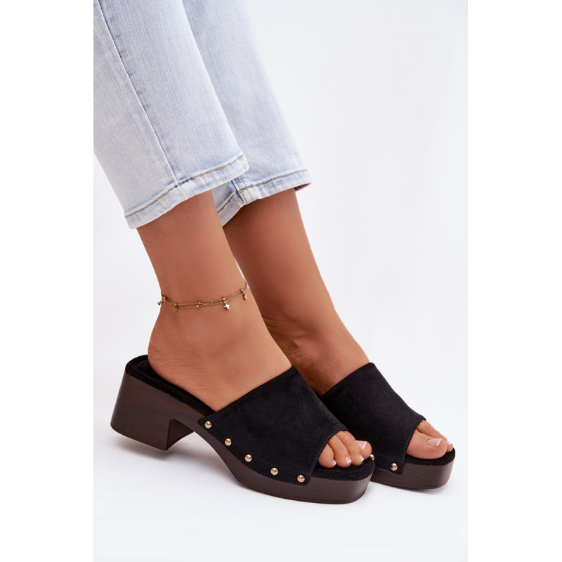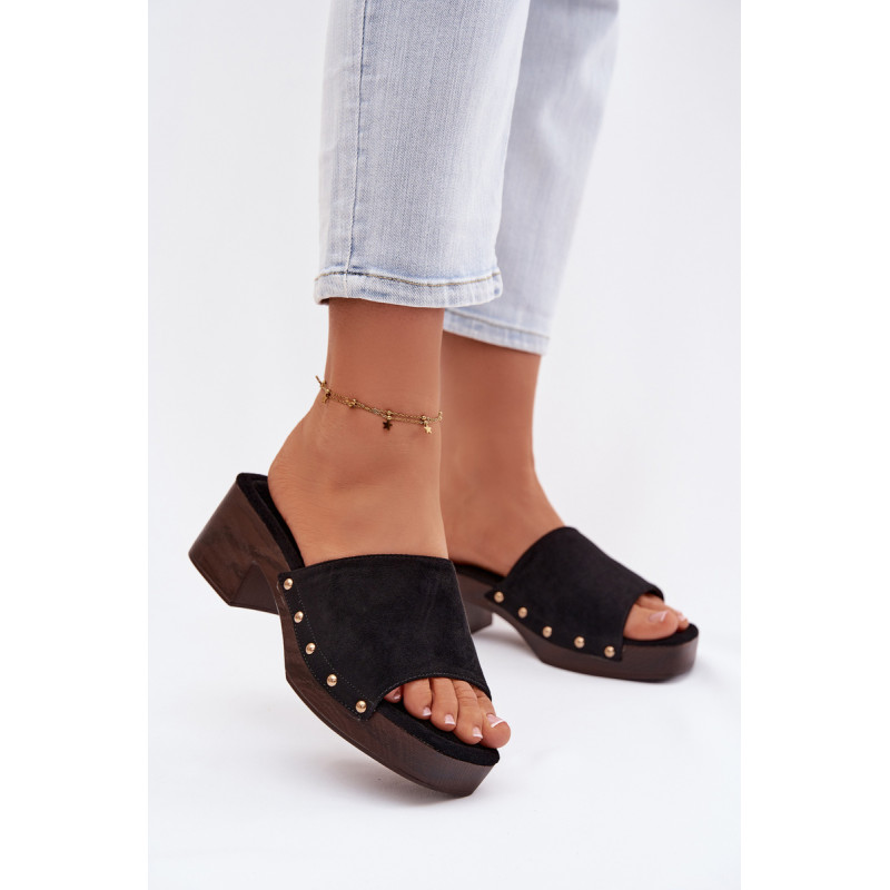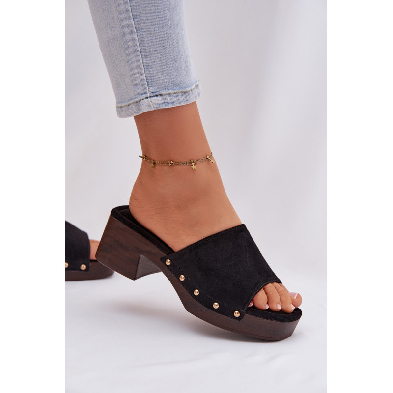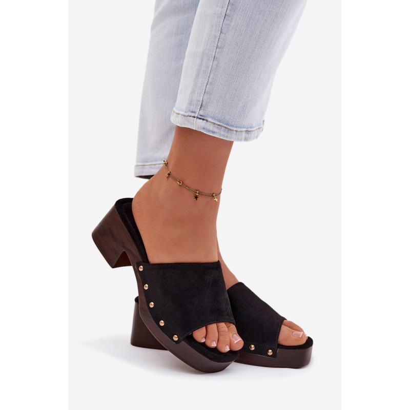 Moteriškos šlepetės, pagamintos iš ekologiško zomšos, yra stilingas pasiūlymas moterims, kurios mėgsta mados akcentus. Modelis su stabilia kubo formos kulnu ir platforma užtikrina patogumą ir pasitikėjimą žingsniu. Minkšta įdėklas rūpinasi komfortu, o auksiniai kniedės šonuose suteikia visumai išraiškingo charakterio. Šios šlepetės puikiai tinka tiek kasdieniam dėvėjimui, tiek labiau stilingiems vasaros deriniams. Renkantis dydį, vadovaukitės dydžių lentele.